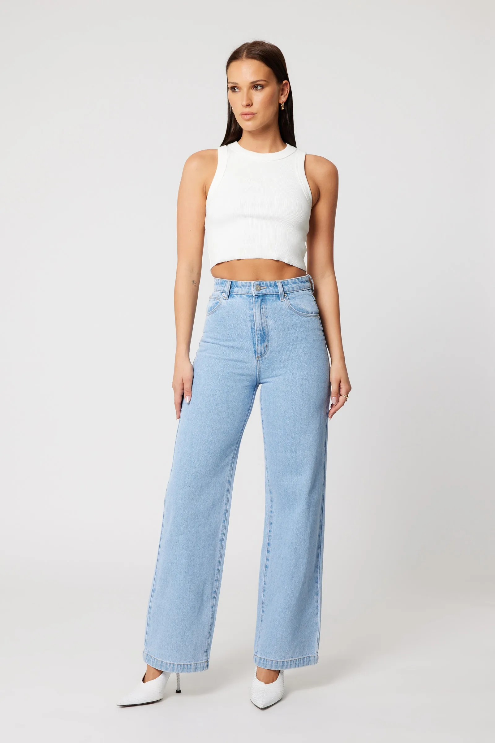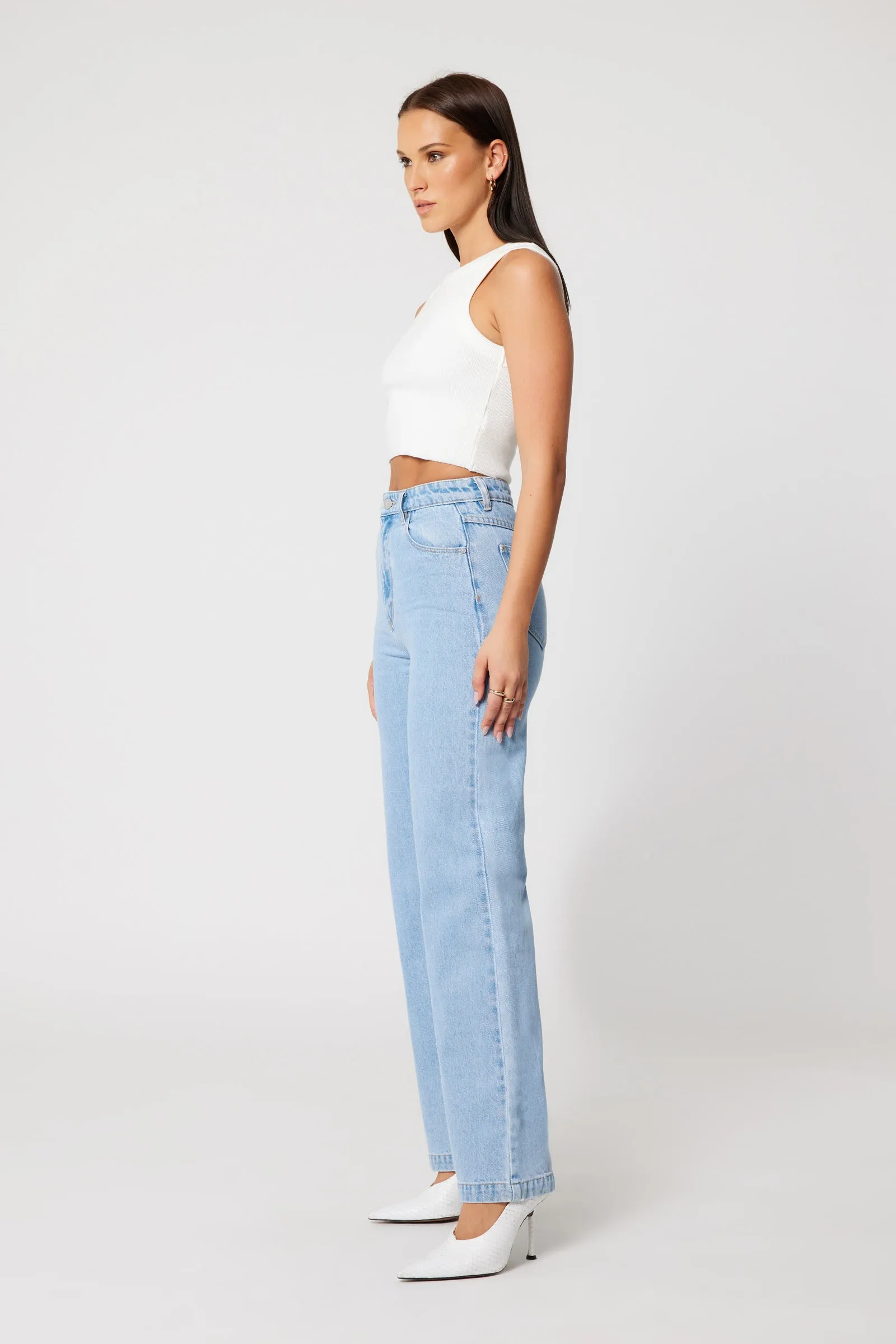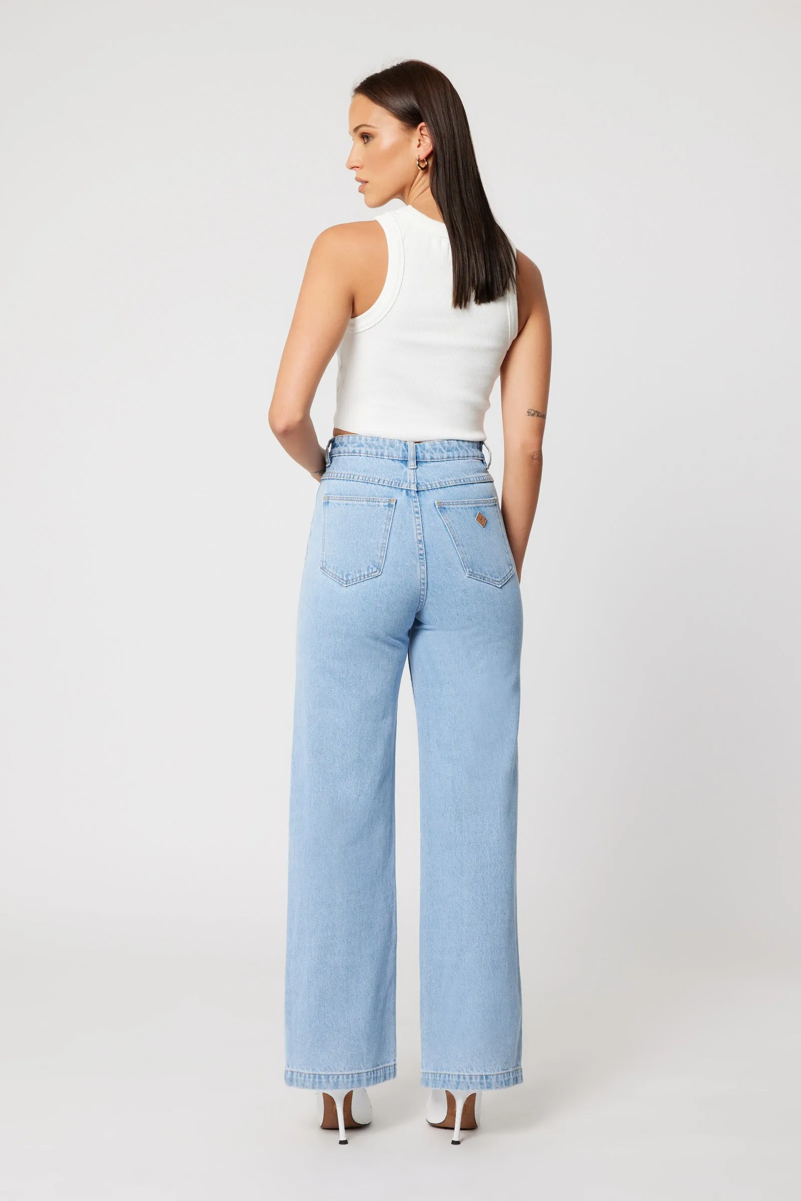 The 94 High & Wide in Kendall is a high rise, wide leg jean, made with a rigid denim.