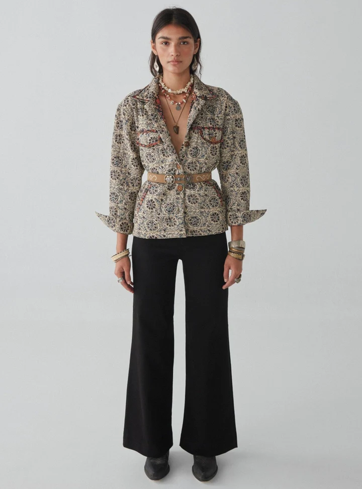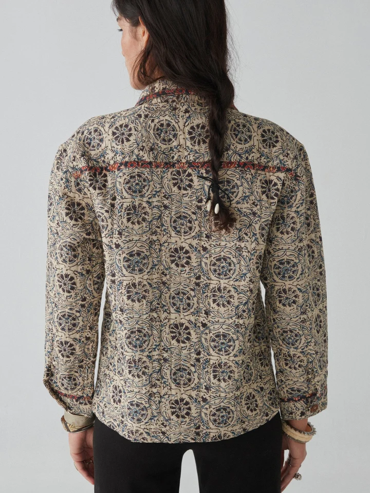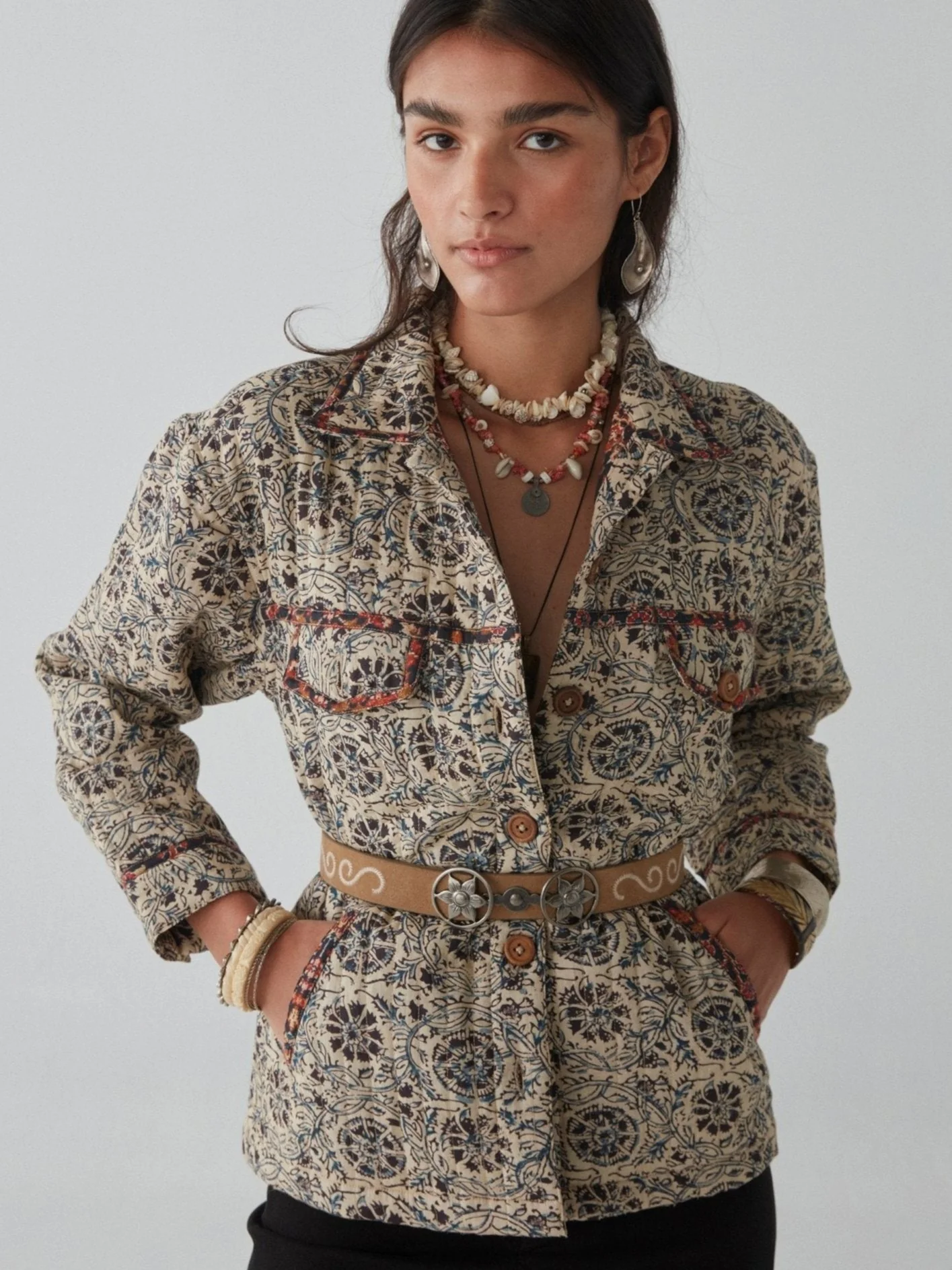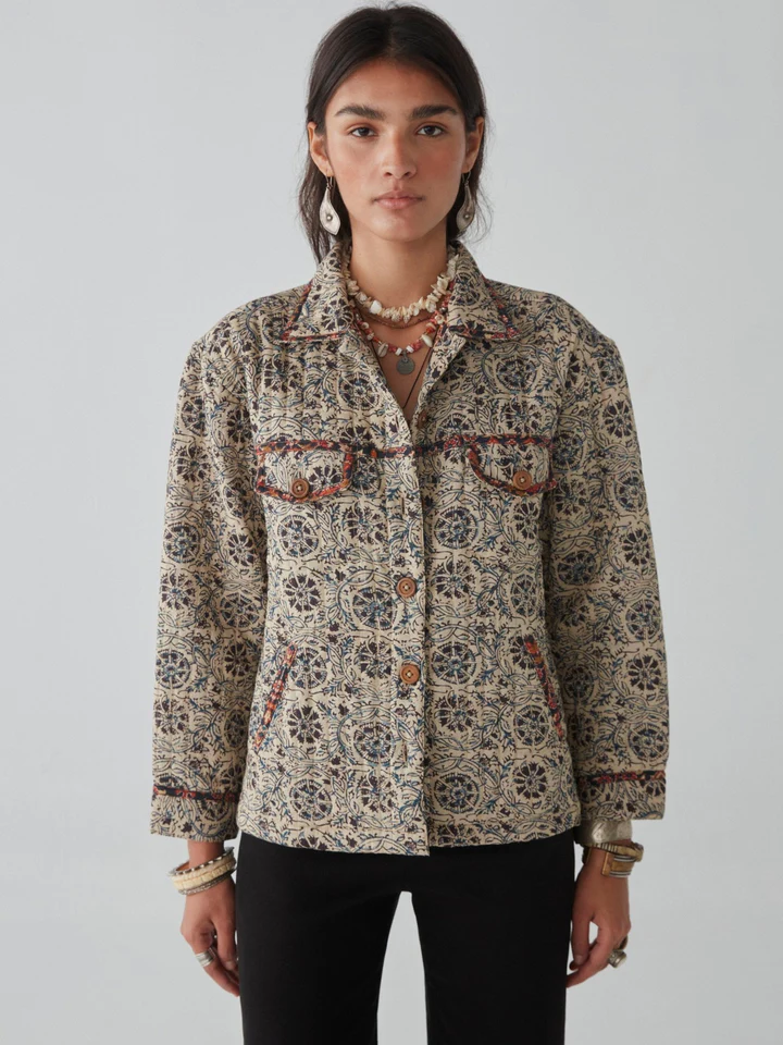 Cut in padded cotton fabric, the Anoushka Jacket features a vintage-inspired, block-print floral design with medium-sized horn buttons and contrast piping/lining; the funky wooden buttons adding a subtle rustic touch.
