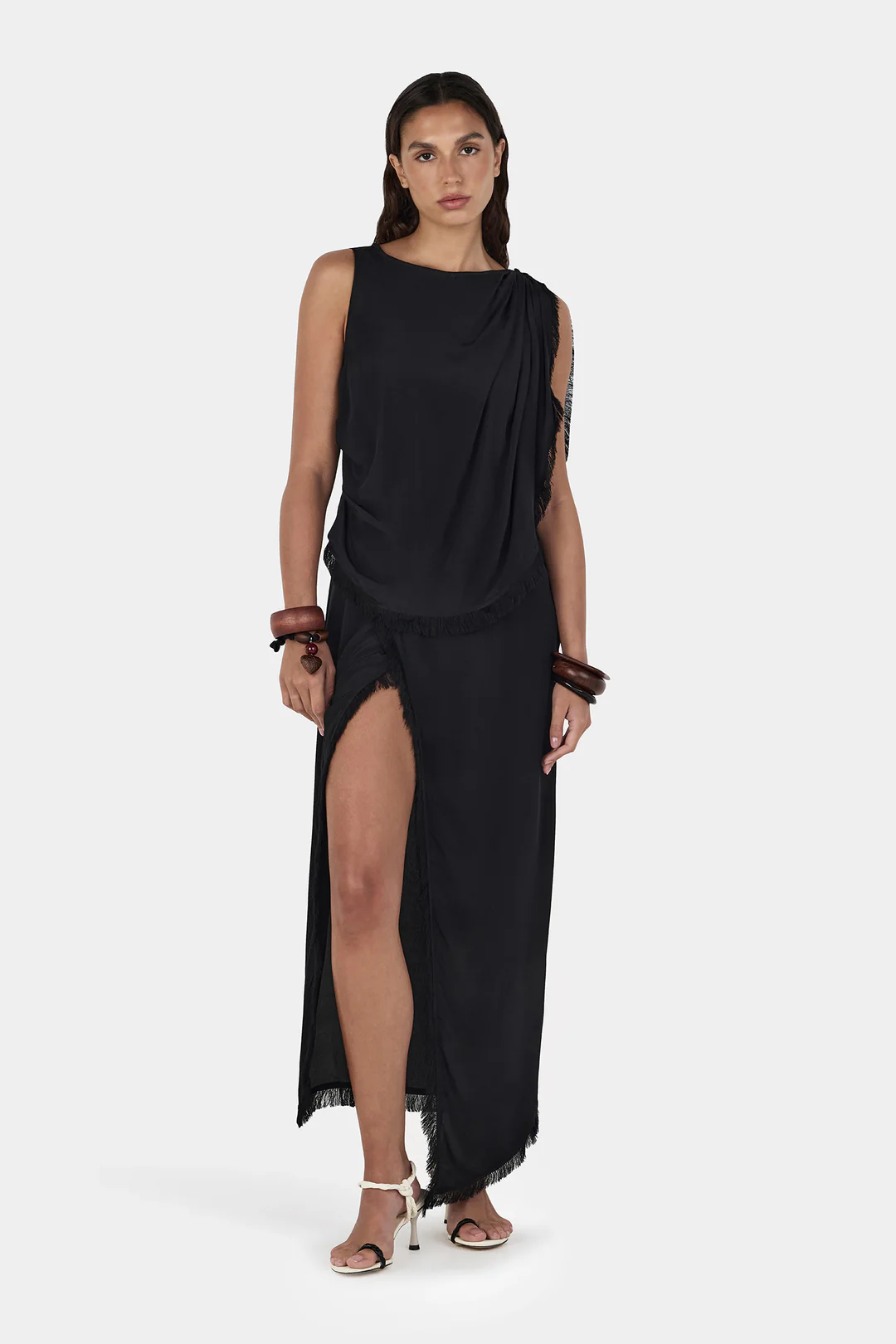 The Arcadia Dress is a midi-length silhouette featuring a softly draped shoulder overlay and signature Hansen fringe detailing along every edge. Designed with a wrap skirt and front leg split, it offers fluid movement and a flattering finish. Complete with an invisible side-seam zip, the Arcadia Dress creates a chic, effortless silhouette perfect for special occasions.