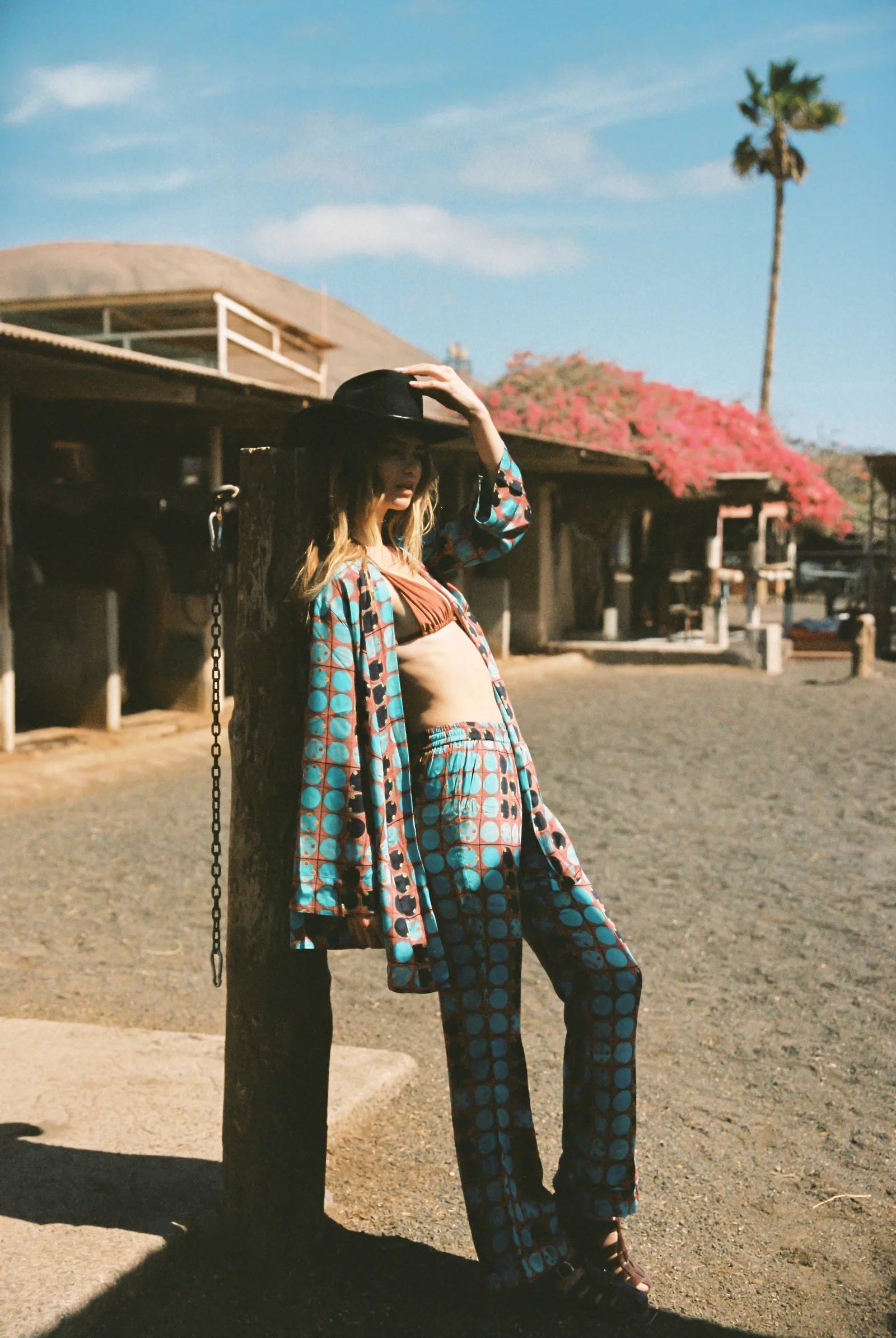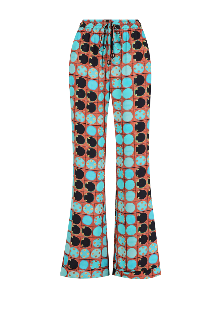 Kinga Csilla’s signature rayon fabrication creates a luxurious canvas for this digitally printed flare pant. This bold geometric print is effortlessly cool which doesn’t trading on comfort.
