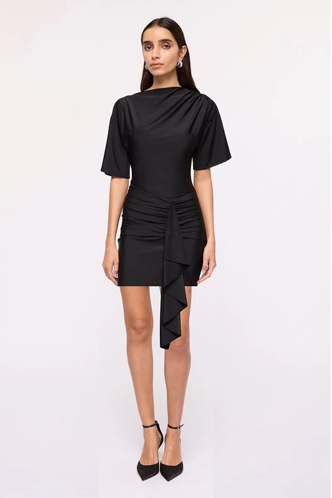 The Arlo Ruched Jersey Mini Dress in black embodies confident femininity with its sleek silhouette. Crafted in soft stretch viscose jersey, it contours the body with precise ruching from neckline to hem, creating a sculptural yet comfortable fit. The asymmetrical neckline adds a refined touch, while subtle gathering enhances natural shape. Finished in a classic black, it’s the ultimate refined statement piece for resort events, long lunches, and modern evenings.