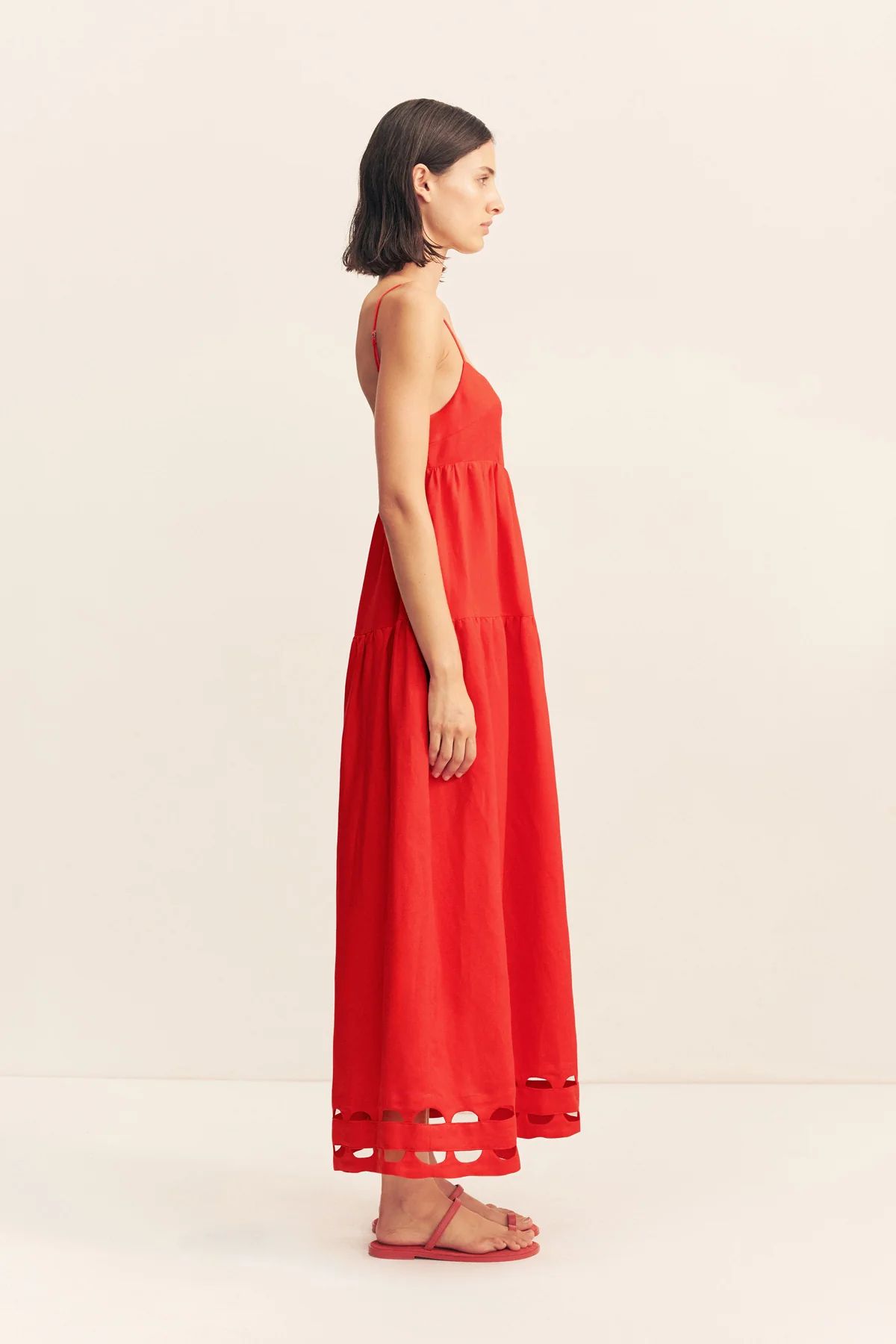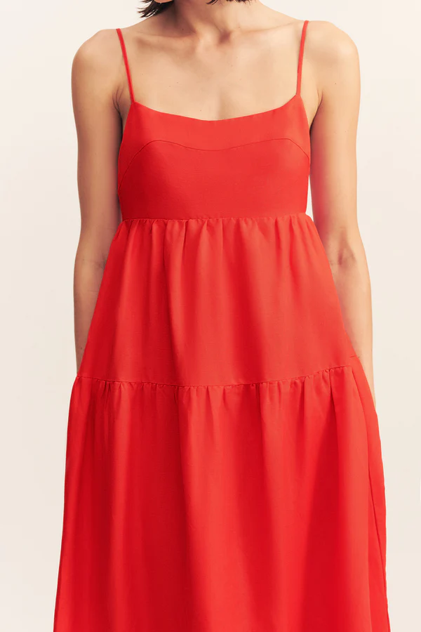Square neck tiered midi dress with scallop cut out detail in red rose in a premium linen blend.