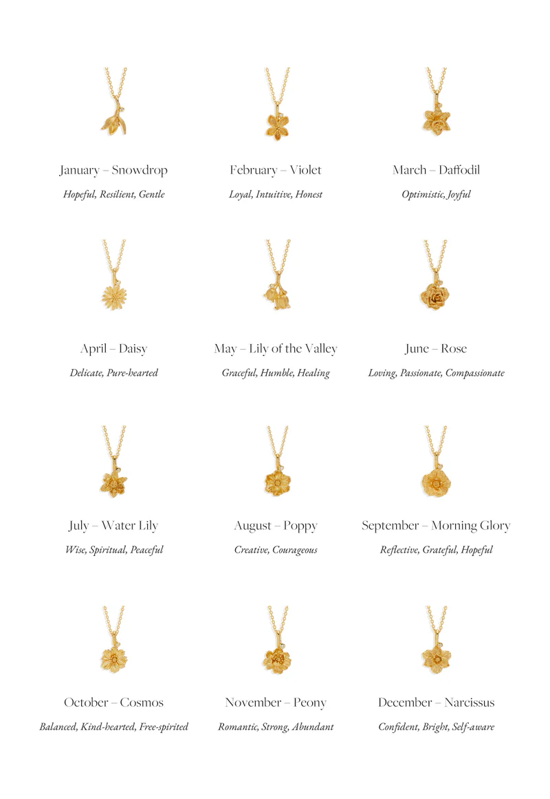 The Morning Glory September Birth Flower Necklace speaks to the virtues of reflection, gratefulness and hopefulness. These vibrant flowers bloom with the sunrise, reminding us to greet each day with intention and gratitude. Wear your own birth flower to celebrate the magic you hold within or as reminder of your connection with loved ones.
