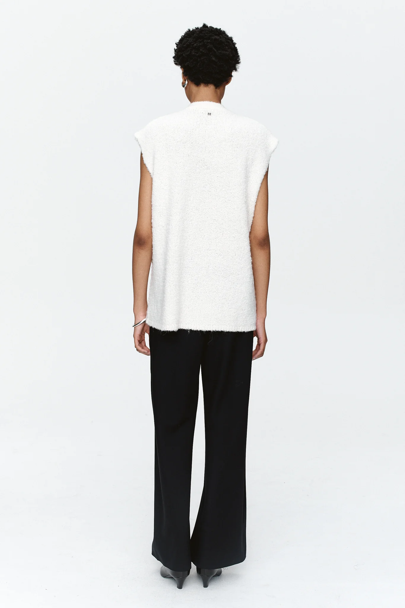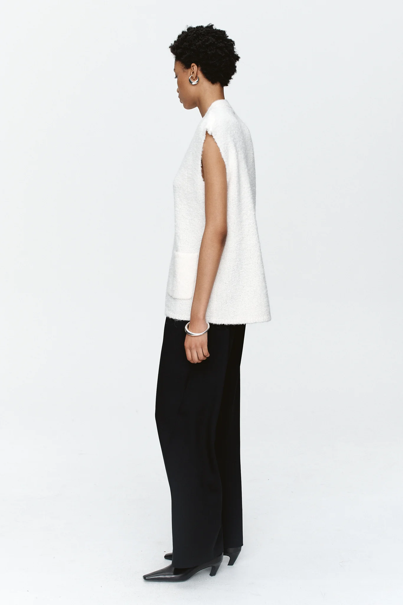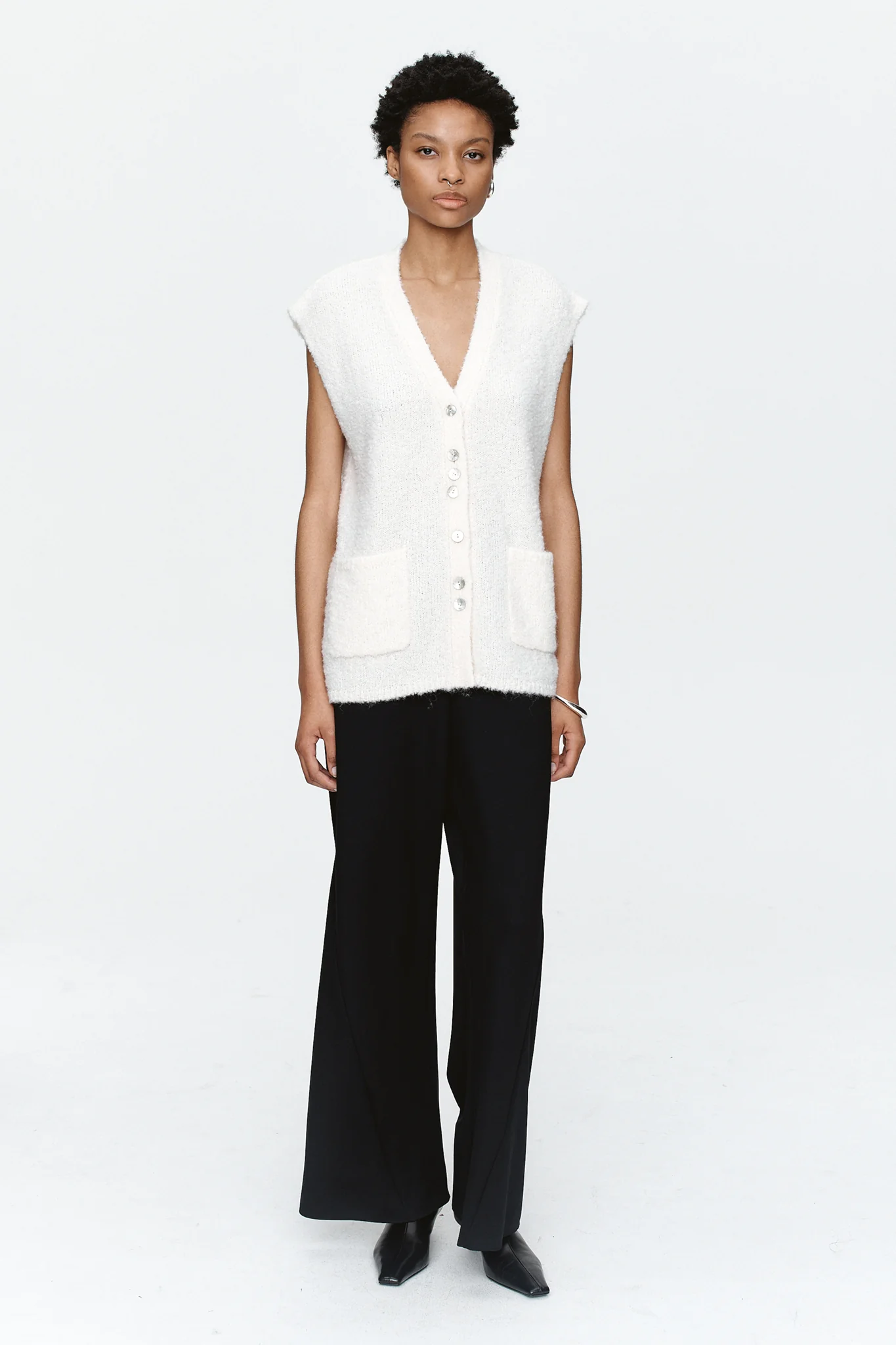 The Bonita Vest is crafted in an Alpaca / Wool yarn finished with a subtle curly texture. This knitted vest features a deep V-neckline secured with agoia buttons down the centre front, in a unique arrangement, with varying spacing. This vest also features two buttons at the side, offering multiple styling options and varying silhouettes. This vest falls at an elongated length, finished with two patch pockets at the front and a slightly capped shoulder.