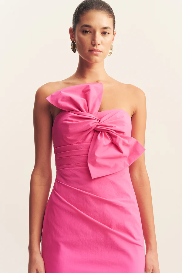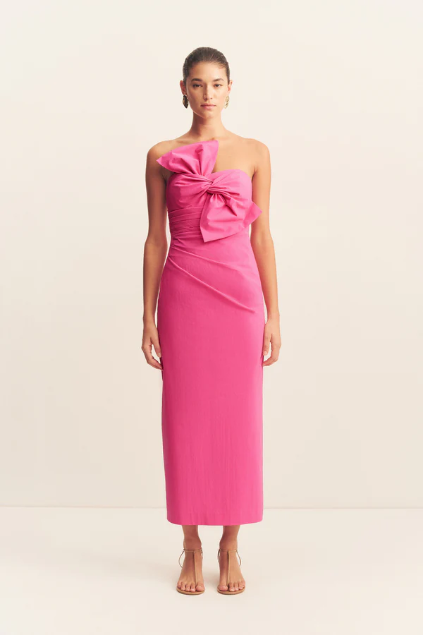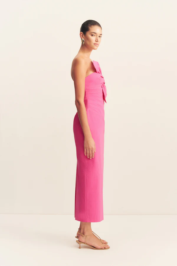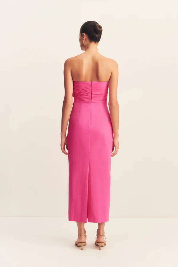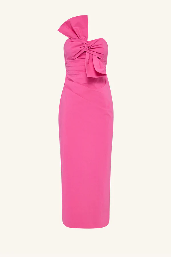 Strapless midi dress with twist knot detail in vivid pink in a premium stretch cotton blend.