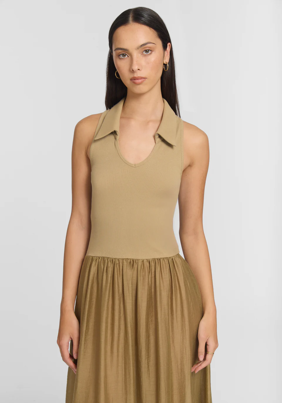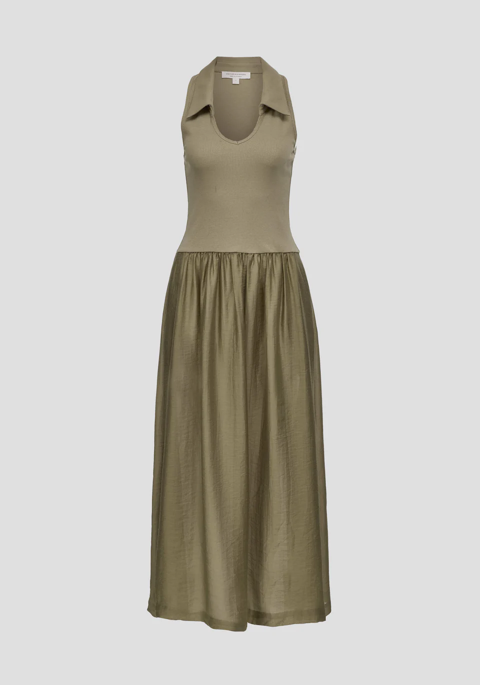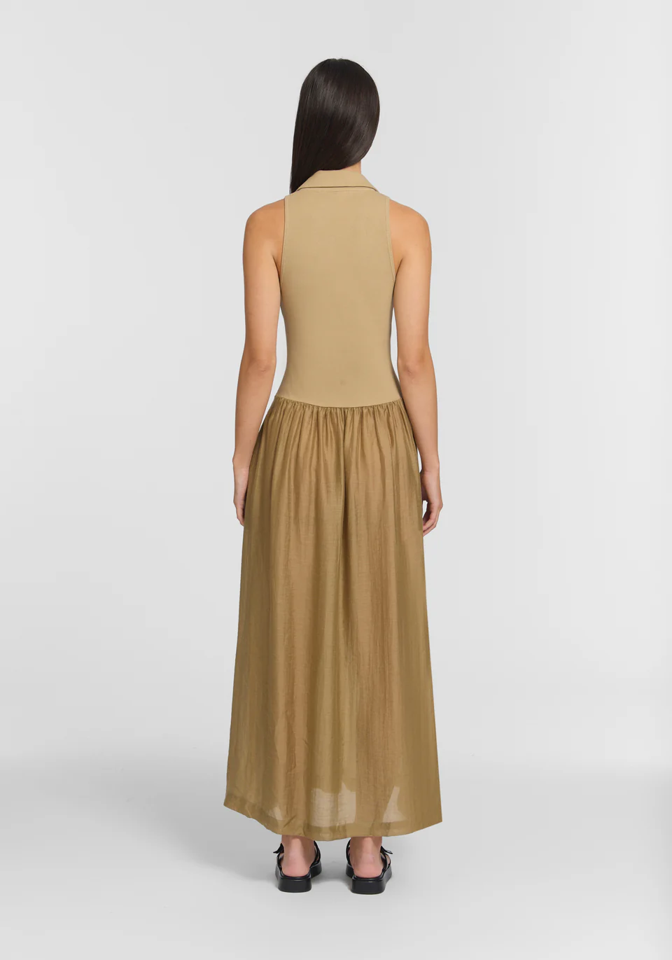The Caretaker Dress, crafted in soft sage, offers a minimalist approach to summer dressing. Featuring a ribbed collar and a woven skirt with soft gathering at a slightly dropped waist, its pull-on style delivers uncomplicated, elevated ease, balancing pure form with quiet functionality.