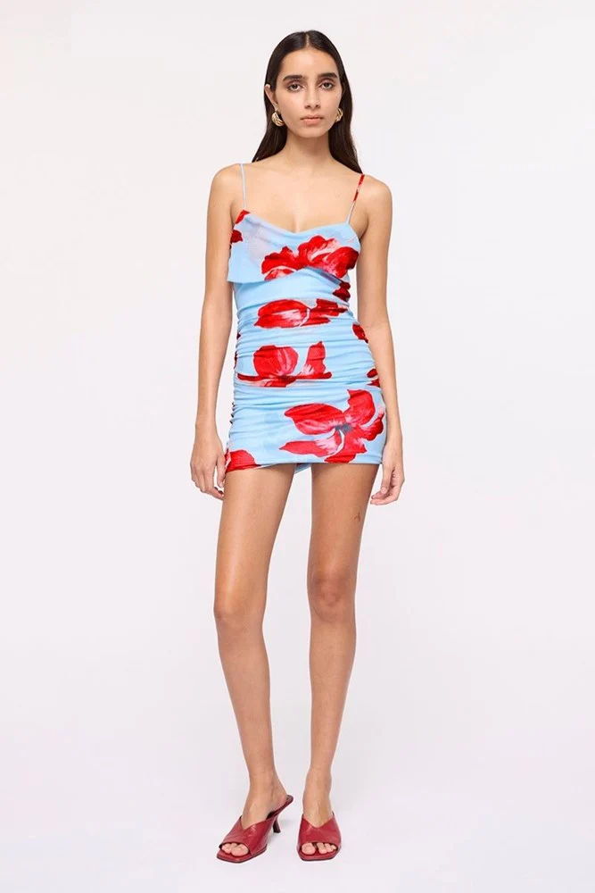 The Chloe Floral Mesh Mini Dress – Blue Pink brings a playful yet elegant touch to resort dressing. Crafted from lightweight sheer mesh with stretch, this body-hugging mini dress showcases a romantic blue and pink floral print. The gathered seams sculpt and flatter, while the single-layer skirt creates a soft, semi-sheer effect that captures effortless femininity. Ideal for daytime events, summer soirées, or coastal evenings, it’s an easy statement piece for every occasion.