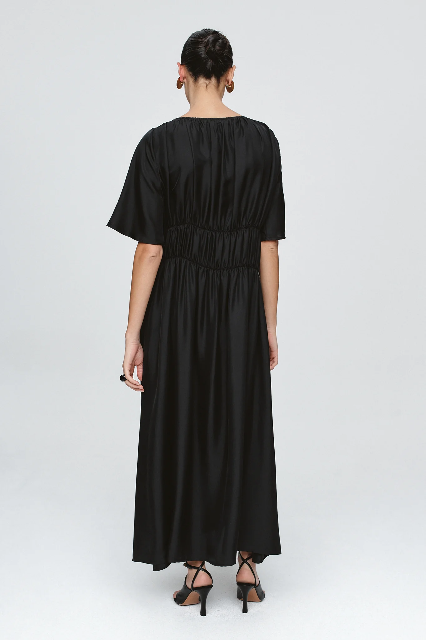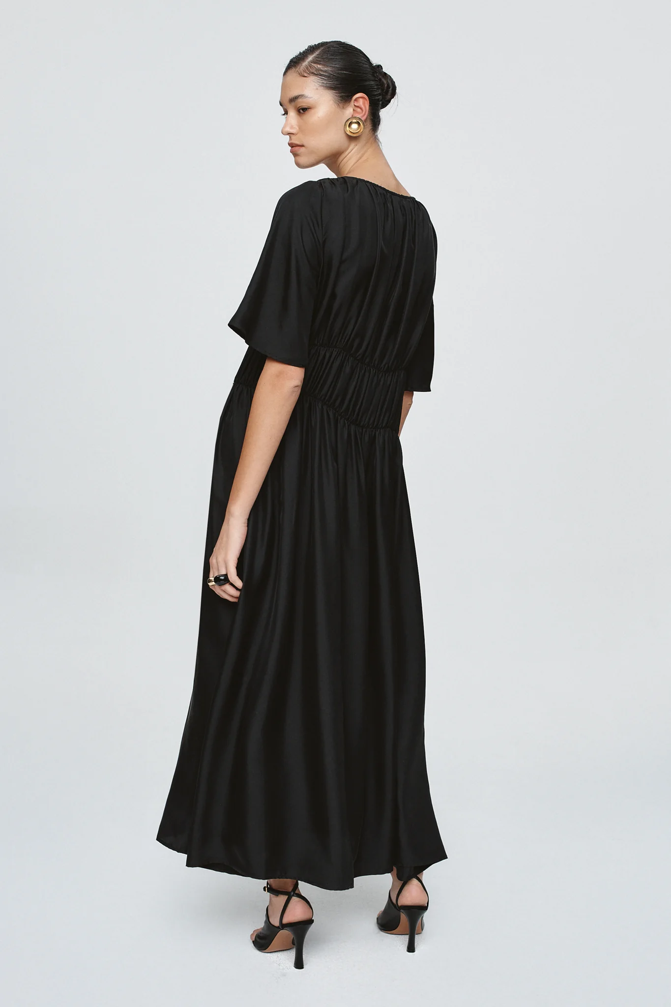 The Dieter Dress is cut from 100% Tencel, offering a soft drape with a subtle sheen. Designed with gathered elasticated channels across the bodice and waist, it creates a softly defined shape while maintaining comfort and ease of movement. The round neckline and wide short sleeves lend a relaxed balance to the sculpted midsection. The full skirt falls to an ankle length.