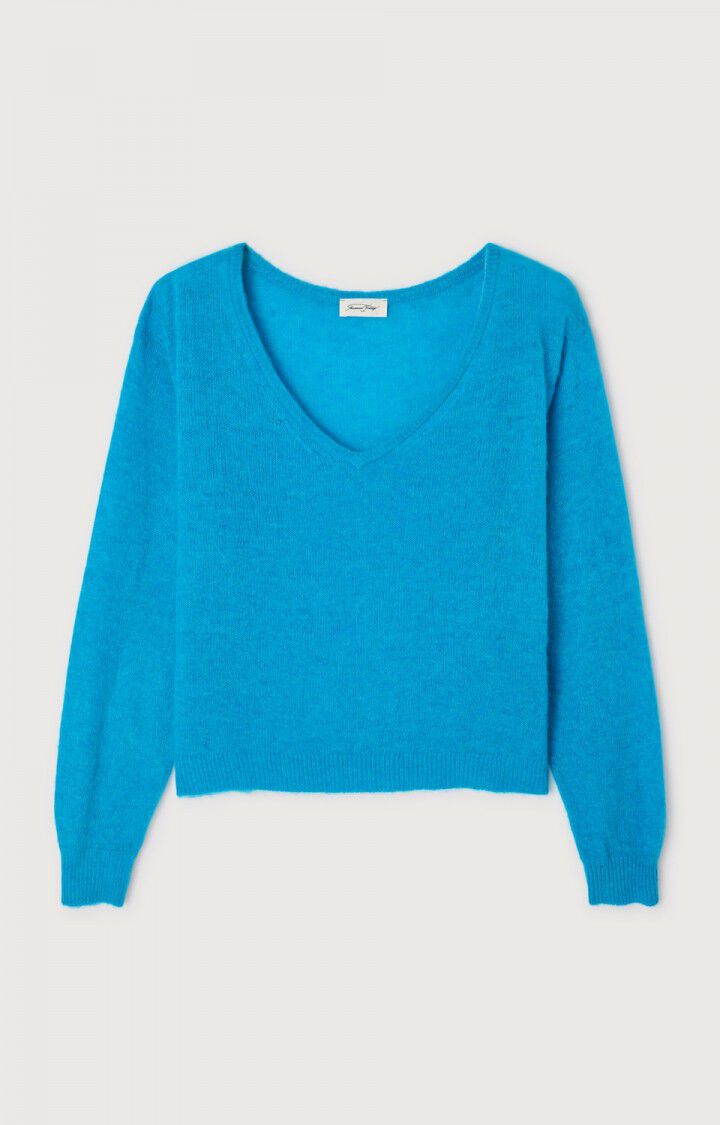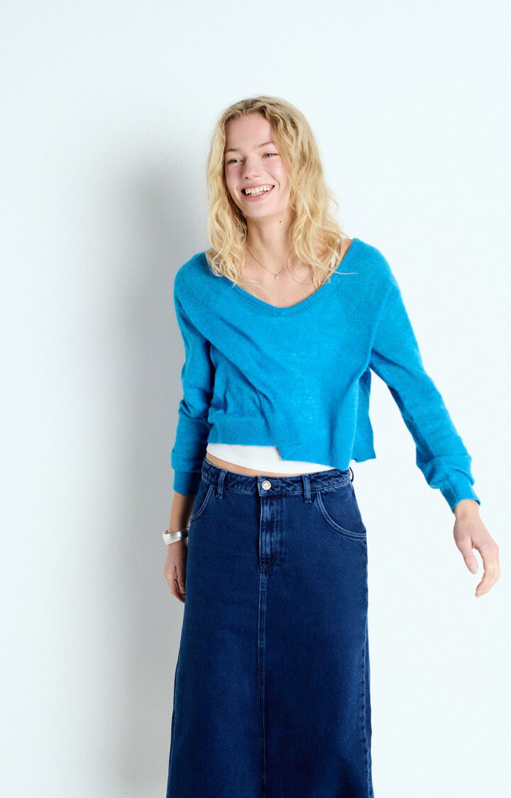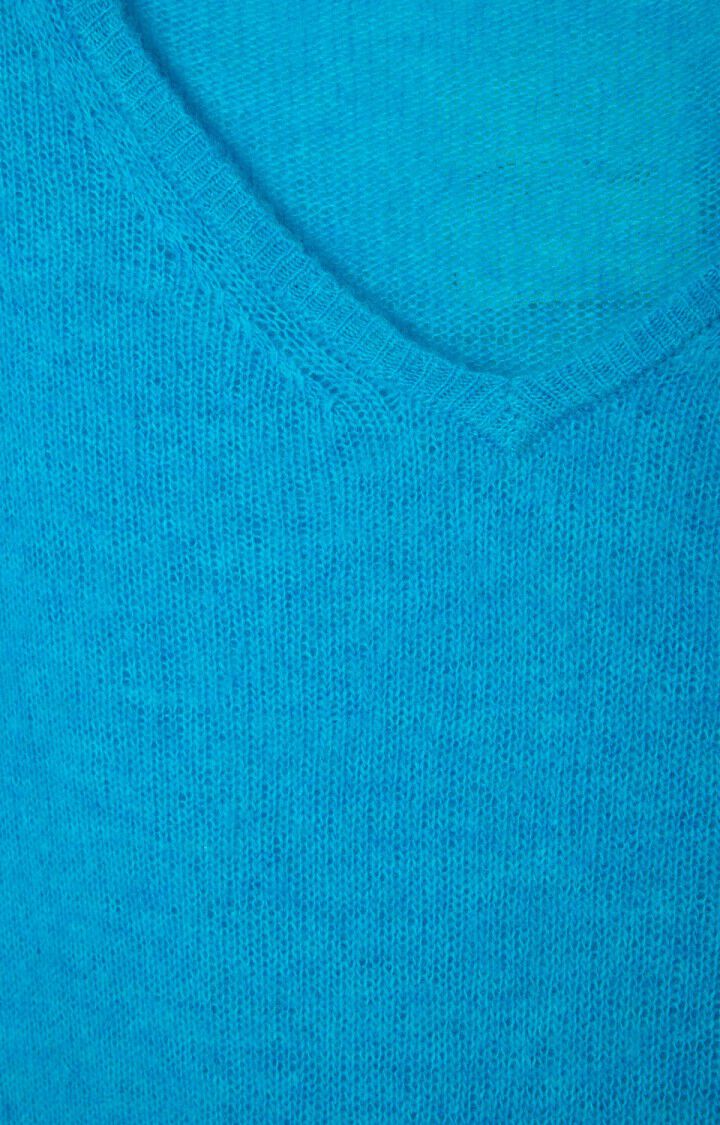 Long sleeve V neck jumper. 40% wool, 30% viscose, 20% polyamid, 10% cashmere.