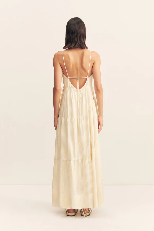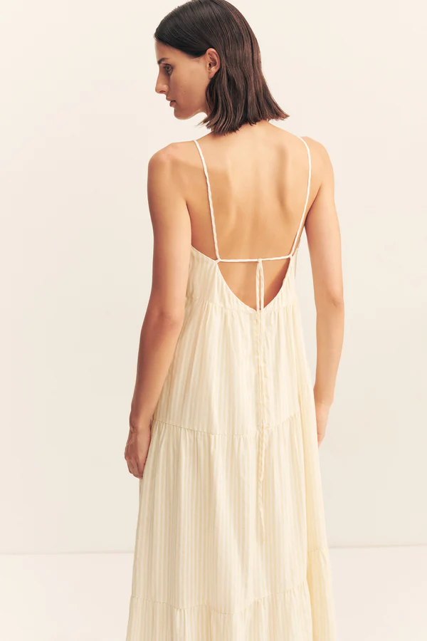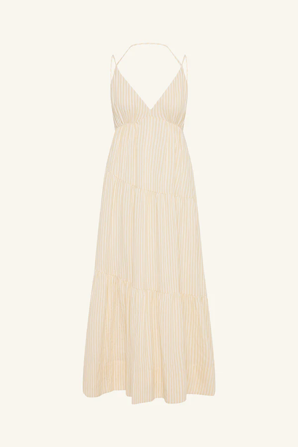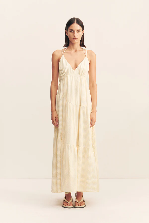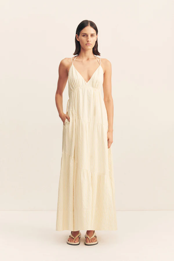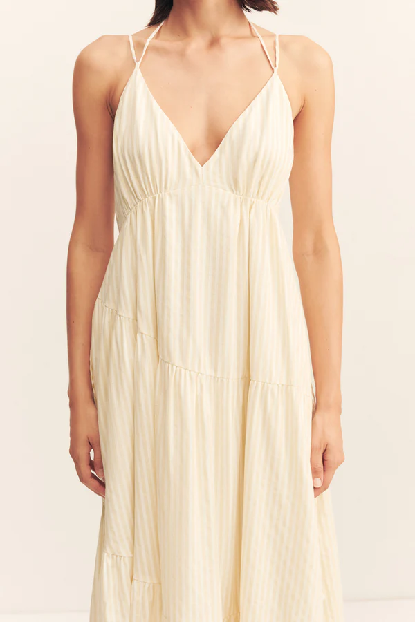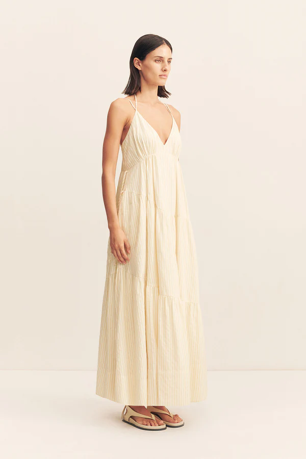 Plunged tiered maxi dress in a premium buttercream striped cotton.