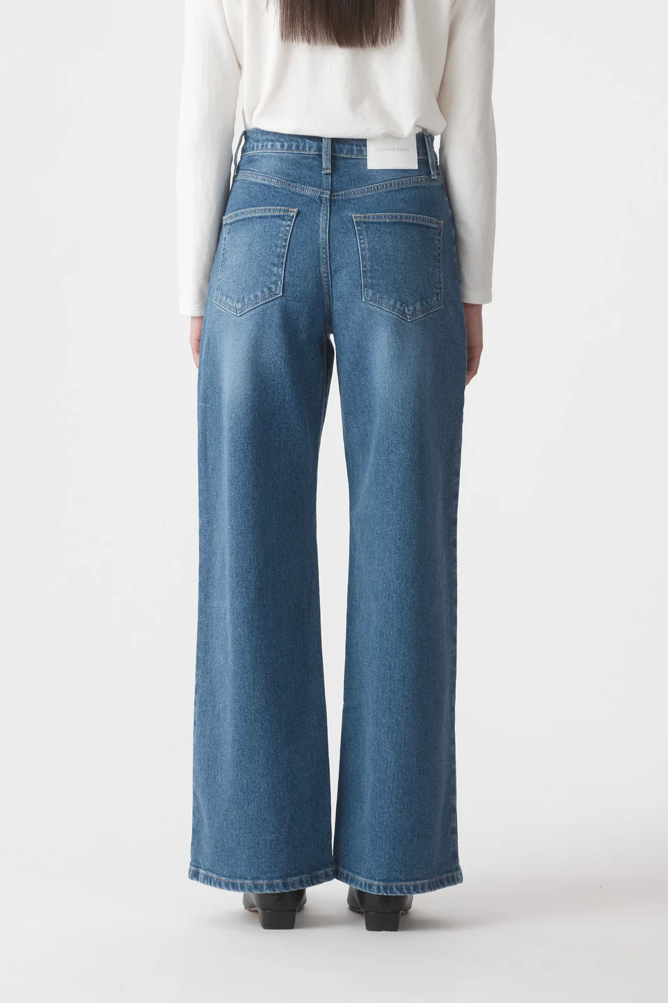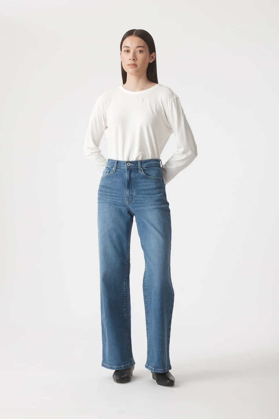 An ultra high rise, retro-inspired cut that hugs through waist and relaxes into a full length, wide leg sillhouette. Crafted in a premium comfort stretch denim.