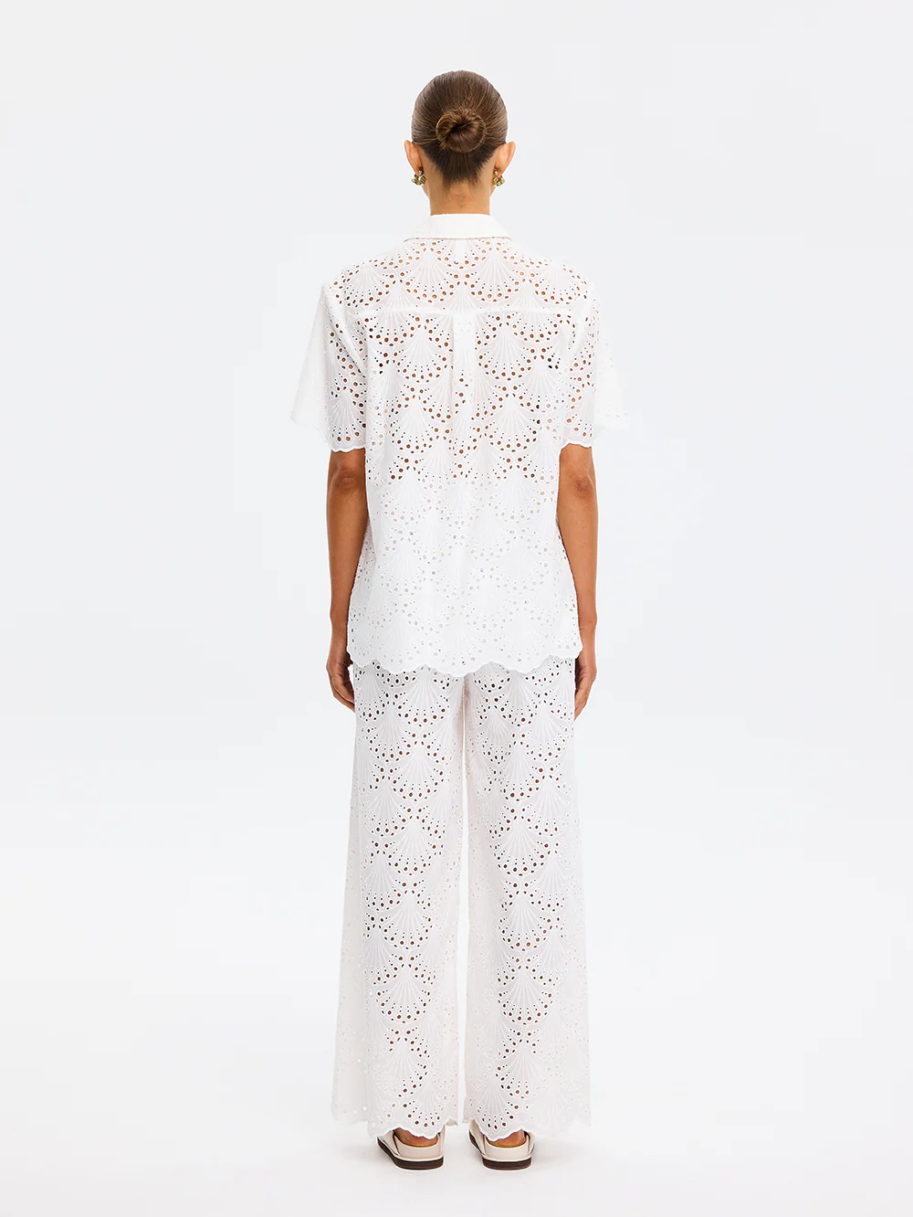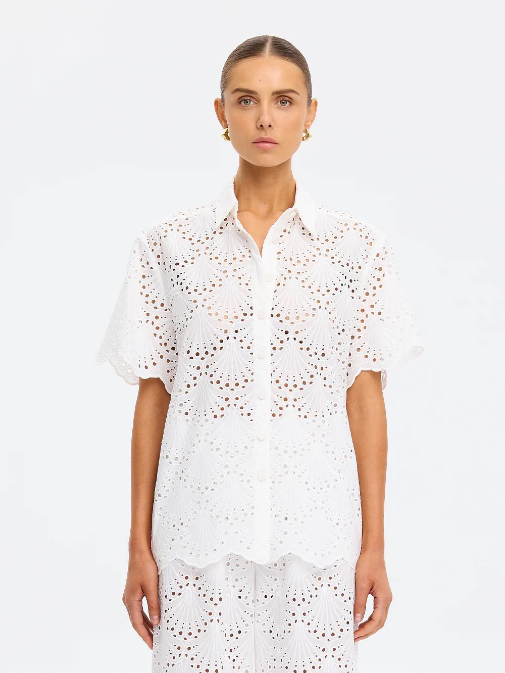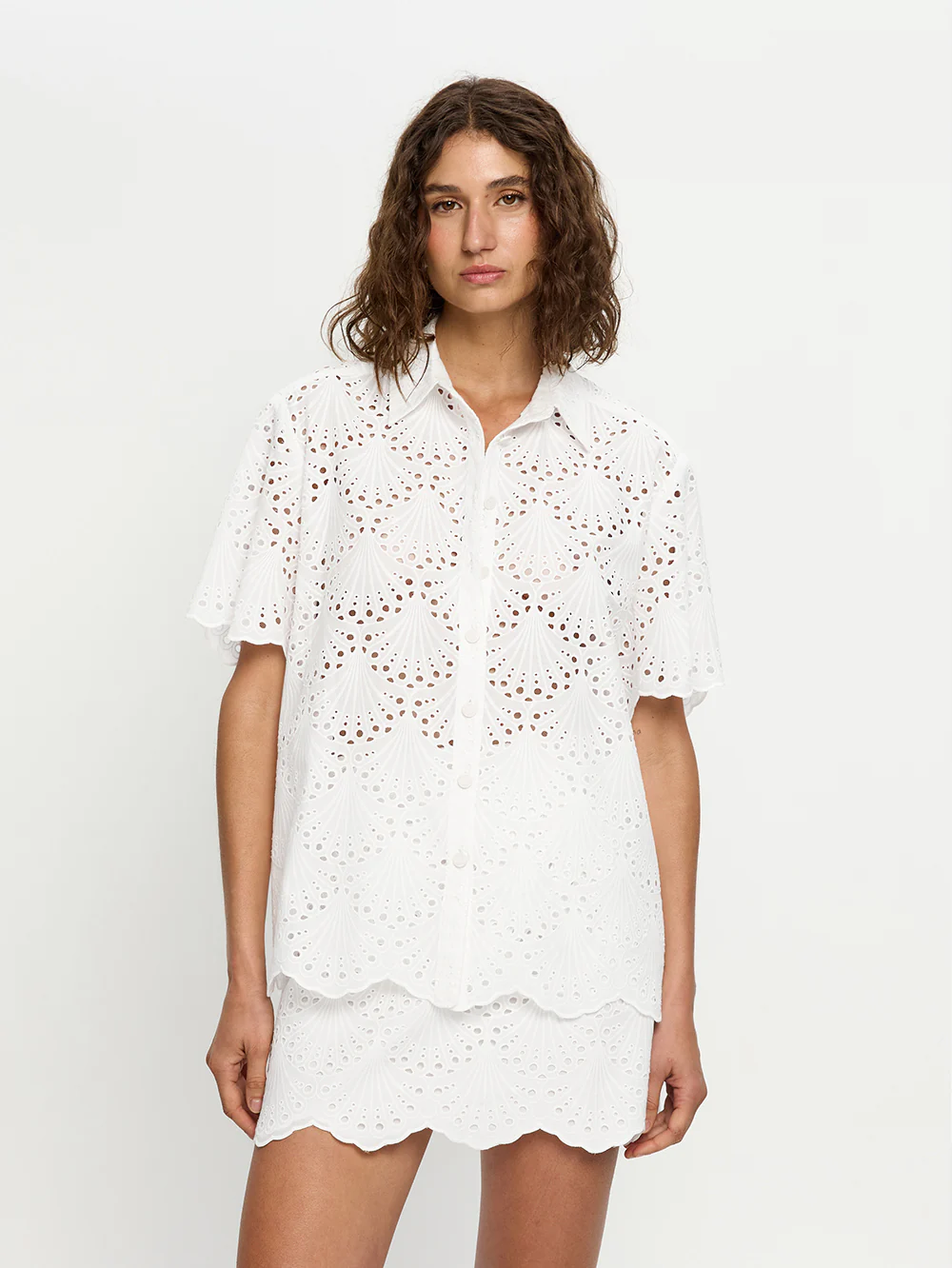 The Elodie Top is crafted in a shell design broderie in a relaxed fit, featuring a front button opening with signature buttons, short sleeves complete with scallop edging on the cuffs and hem. Light and easy to wear, it brings a refined softness to warm-weather dressing. Pair with the matching Elodie Mini Skirt for a coordinated look, or style with denim and sandals for effortless everyday wear.