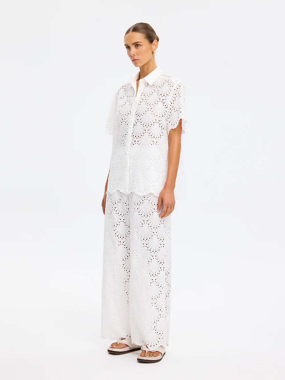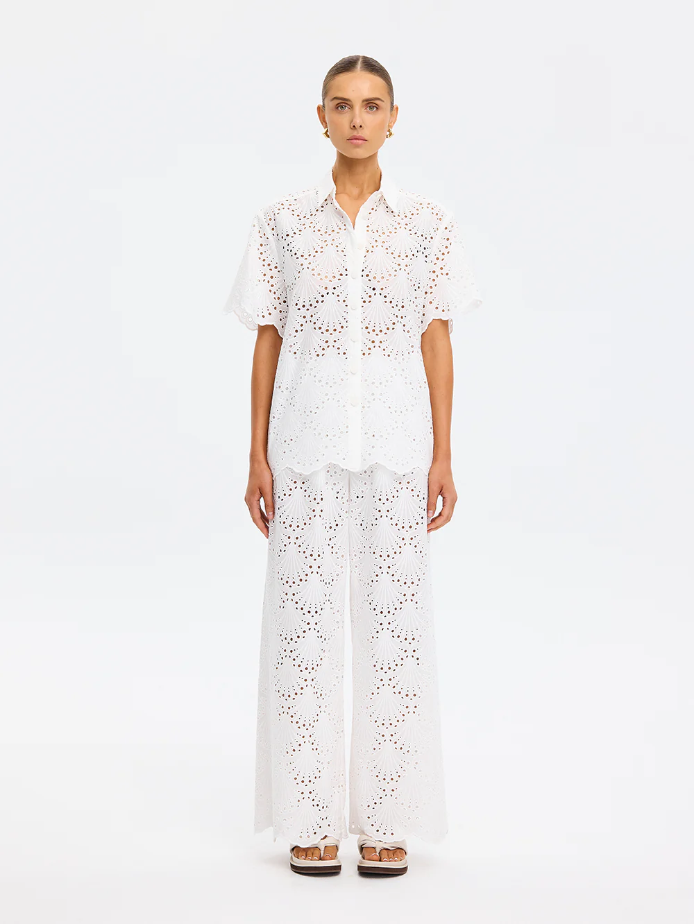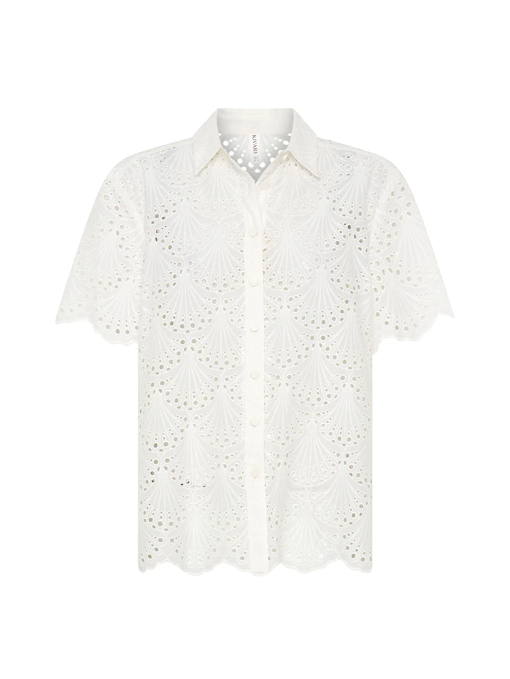 The Elodie Top is crafted in a shell design broderie in a relaxed fit, featuring a front button opening with signature buttons, short sleeves complete with scallop edging on the cuffs and hem. Light and easy to wear, it brings a refined softness to warm-weather dressing. Pair with the matching Elodie Mini Skirt for a coordinated look, or style with denim and sandals for effortless everyday wear.