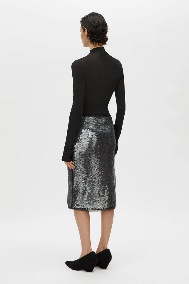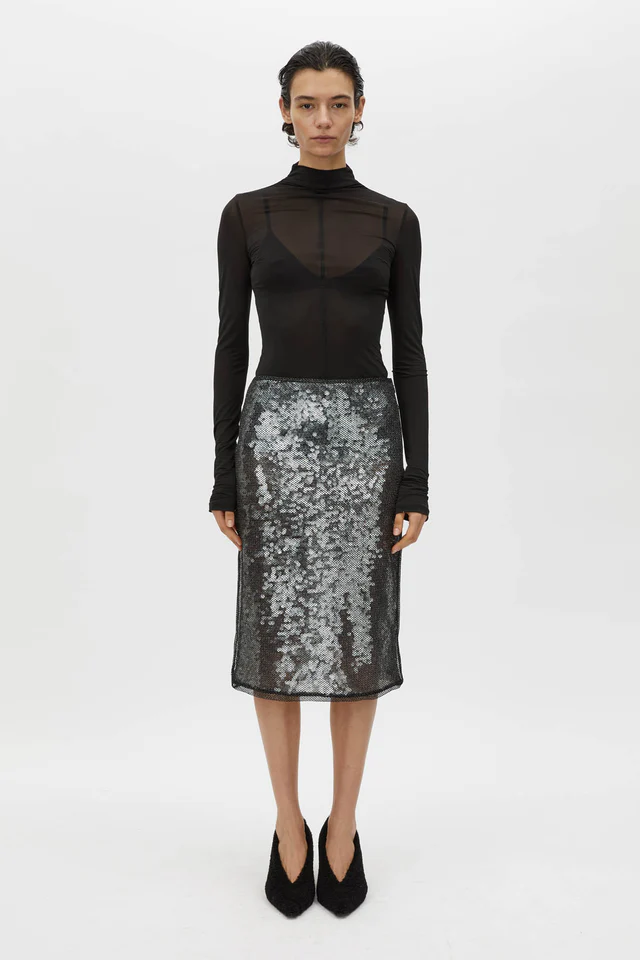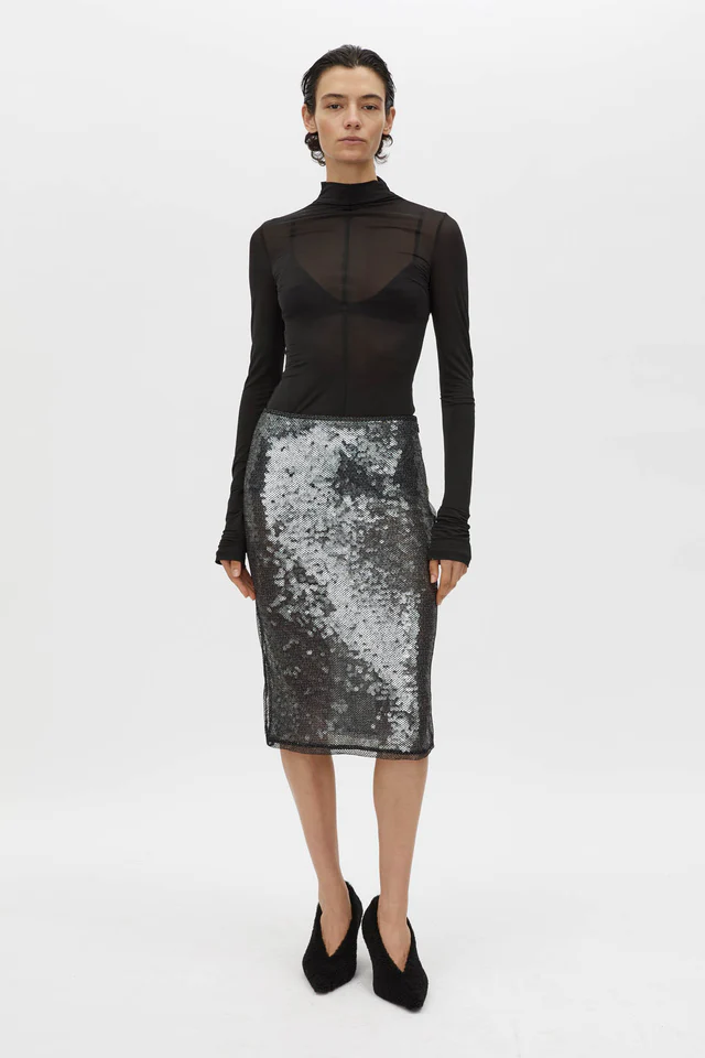 The Facade Midi Skirt offers a modern take on timeless glamour, designed to sit comfortably on the waist. Its large sequins are beautifully contrasted by a slightly longer mesh overlay that bubbles with subtle movement. This versatile piece combines refined details with effortless style, making it an essential addition to any wardrobe.