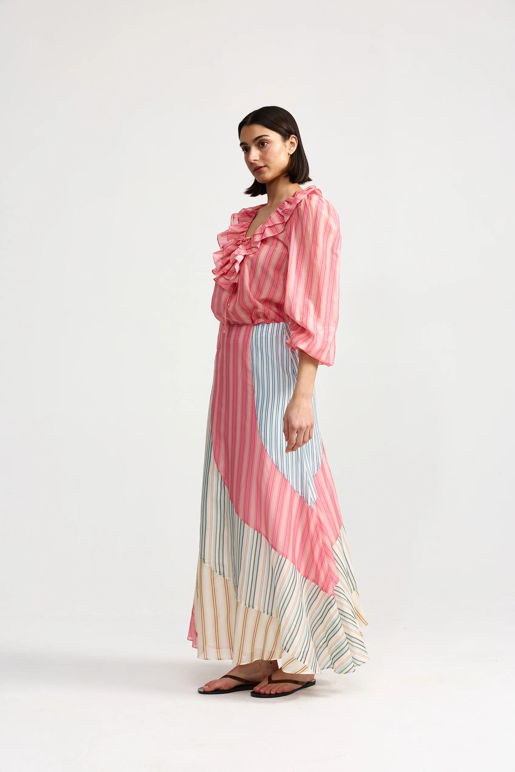 The Filly Blouse Sorbet Stripe exudes effortless femininity with its cascading ruffle neckline and delicate tie-front detail. The airy, lightweight fabric drapes beautifully, while the voluminous sleeves add a touch of drama.