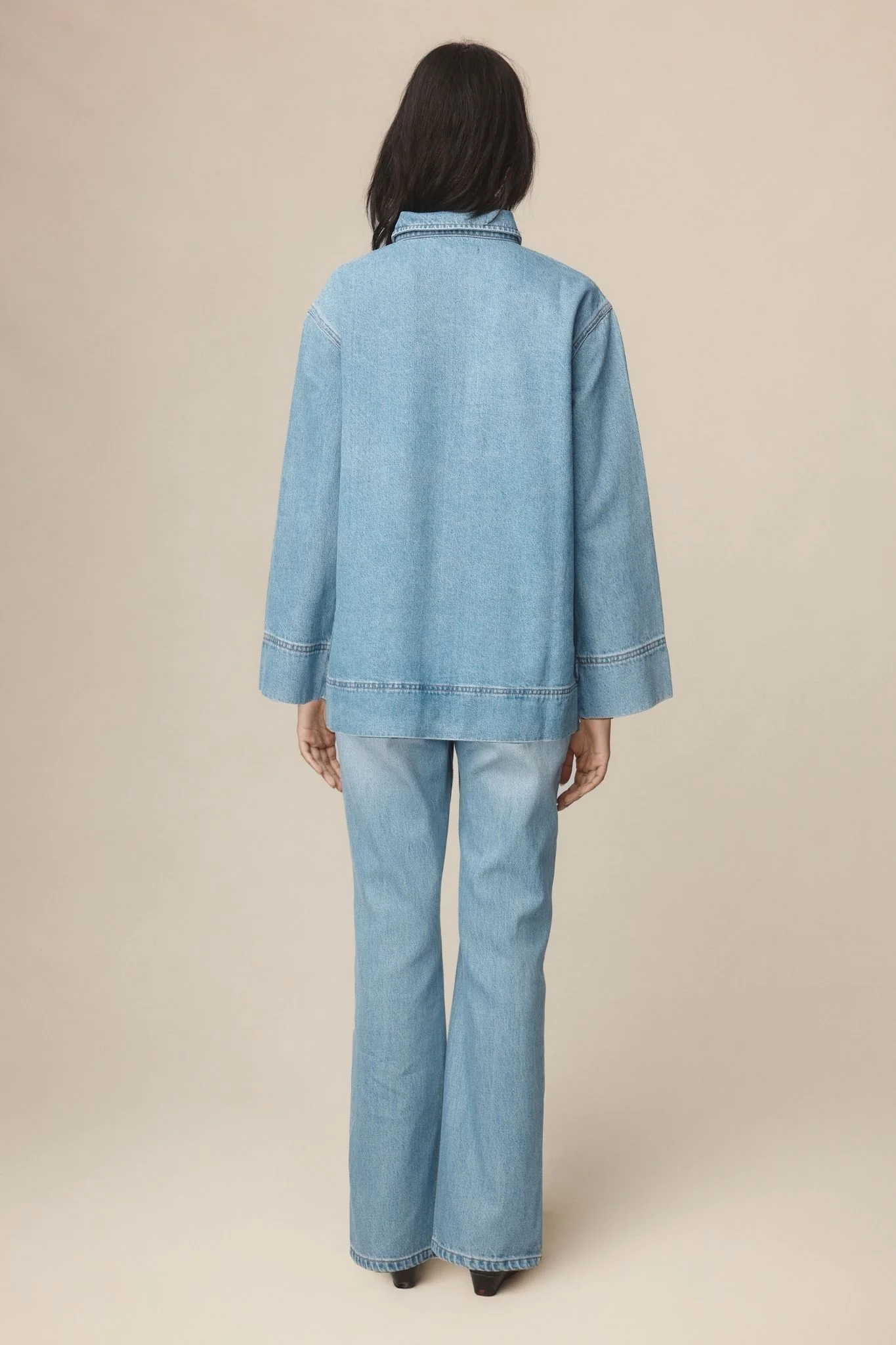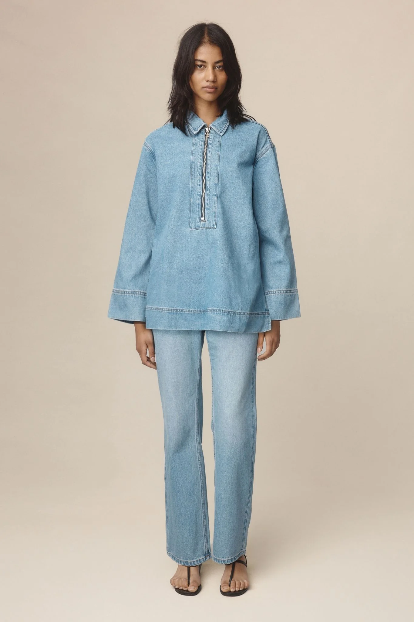 This pullover-style denim shirt balances utility with a relaxed, modern shape. Designed with a slightly boxy fit, it features a clean stand collar and a half-zip front placket for adjustable styling. Wide, straight sleeves and a straight hem enhance its easy wearing shape. Subtle splits in the hem are relaxed and flattering, being able to glimpse what is worn underneath. Minimal detailing and tonal stitching keep the look refined, making it a versatile layering piece across seasons. The length falls to the hip.
