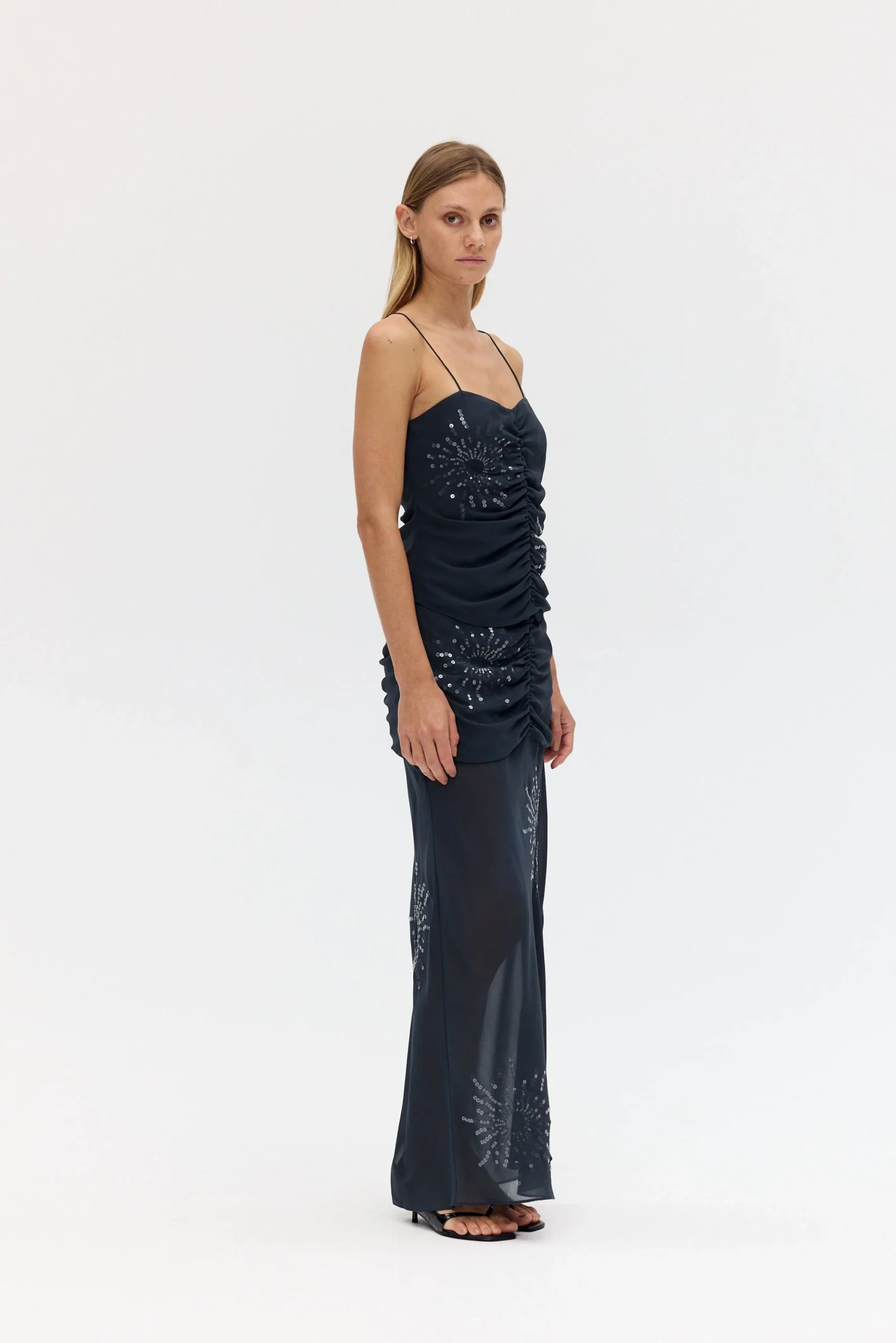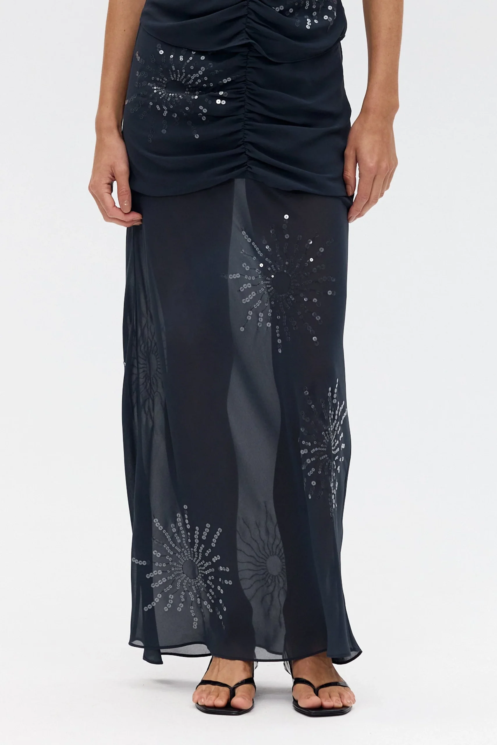 The Flicker Bias Maxi Skirt plays with light and texture through a fluid, elongated silhouette. The slim fit through the upper body falls to a gentle flare at the hem, cut on the bias for natural drape and movement. The sheer lower skirt reveals subtle transparency, creating a layered interplay of opacity. Adorned with an exclusive sequin pattern designed in house, this piece embodies modern occasion dressing with refined ease.