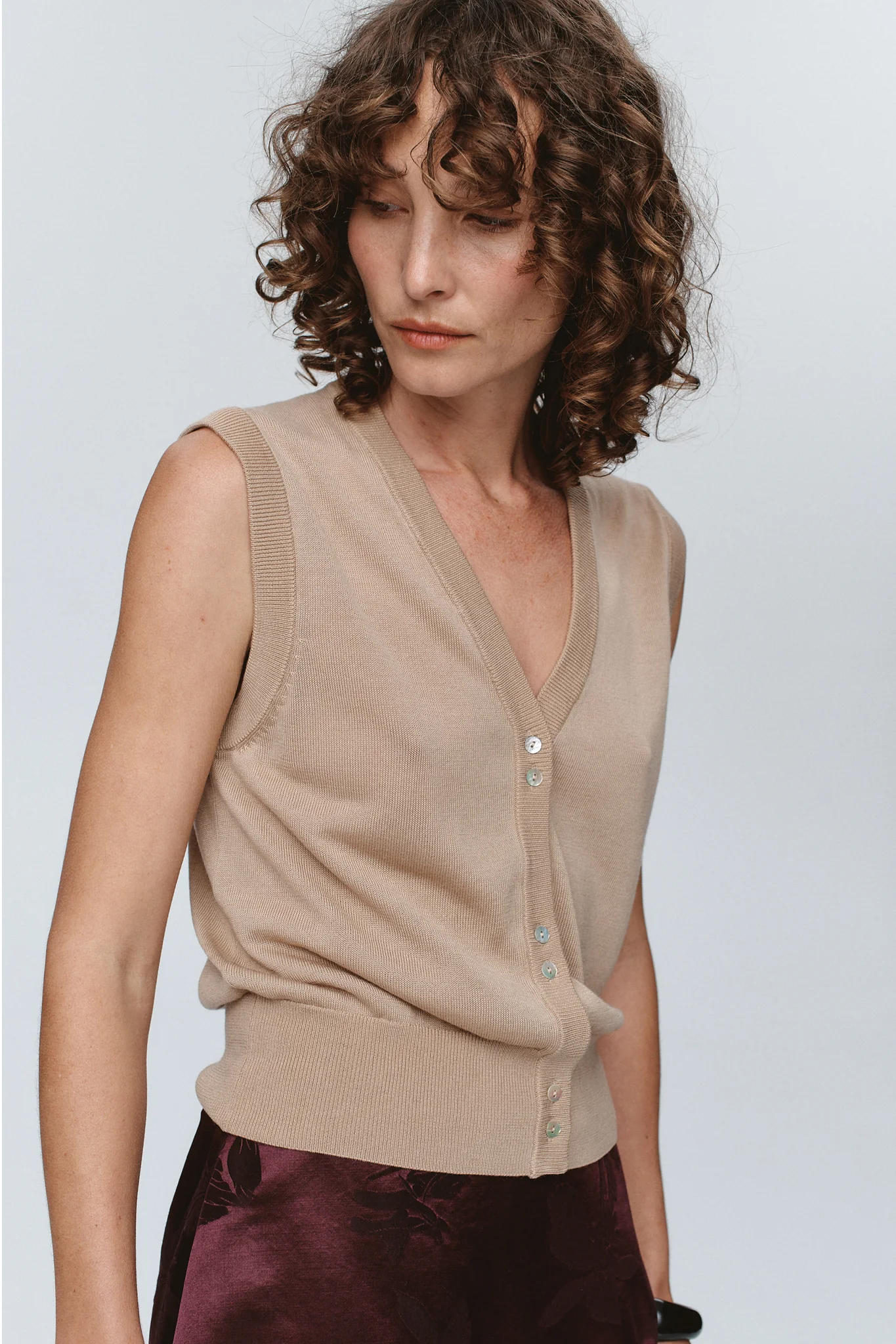 The Foundations Vest is finely knitted in a cotton / cashmere yarn and features a deep V- neckline, secured with contrasting shell buttons down the centre front in a paired sequence. This vest is finished with a ribbed hem.