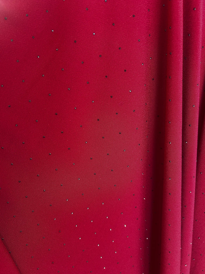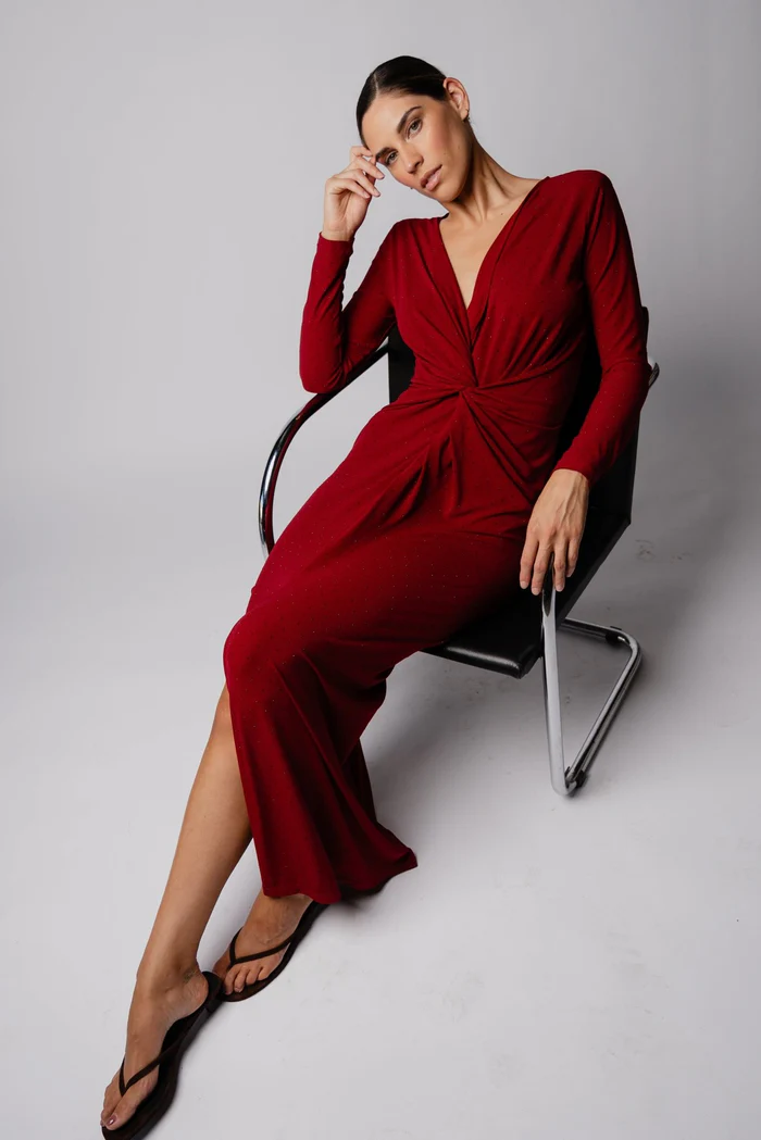 The Gaea Stretch Maxi in Samba reinterprets the signature Gaia. Twist in a stretch jersey silhouette designed for comfort and ease. Cut in a rich bordo tone, the matte jersey base is scattered with subtle black diamonties, creating a refined shimmer that reveals itself softly in movement rather than overt shine.