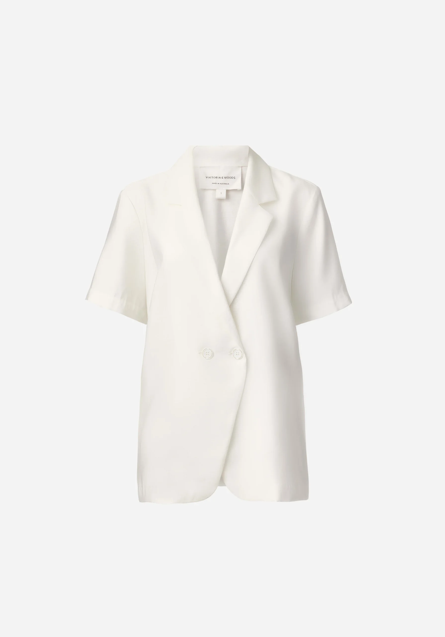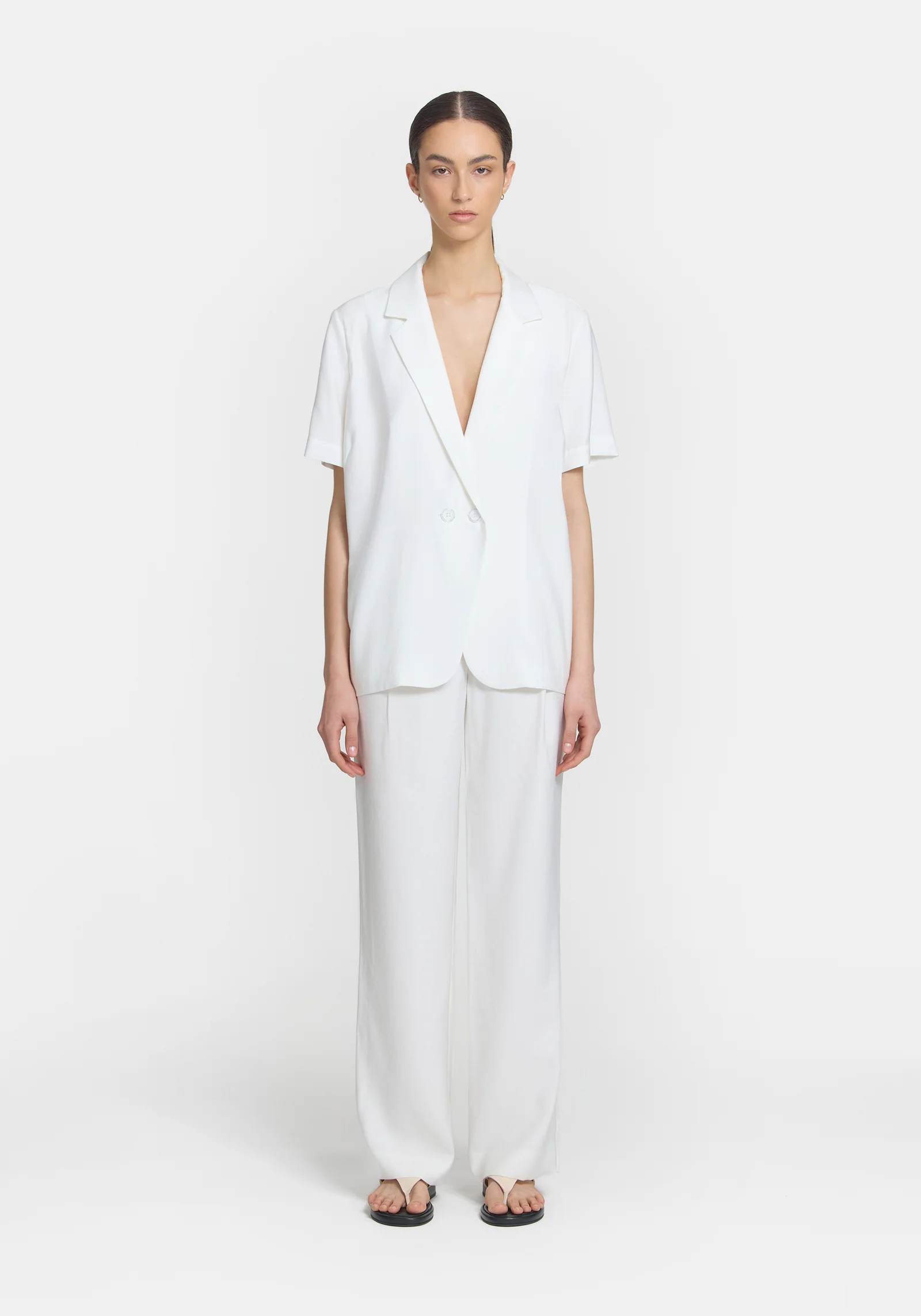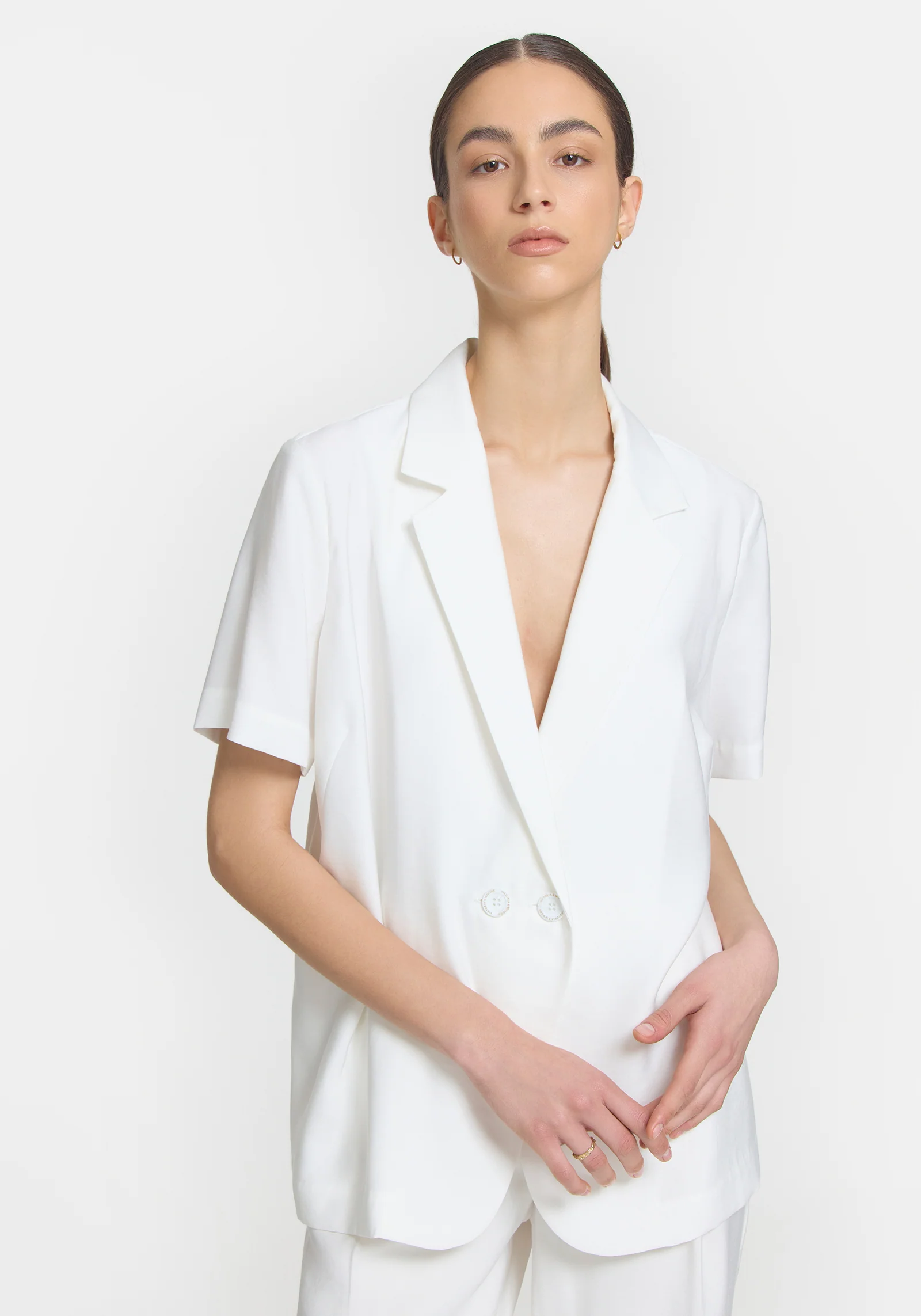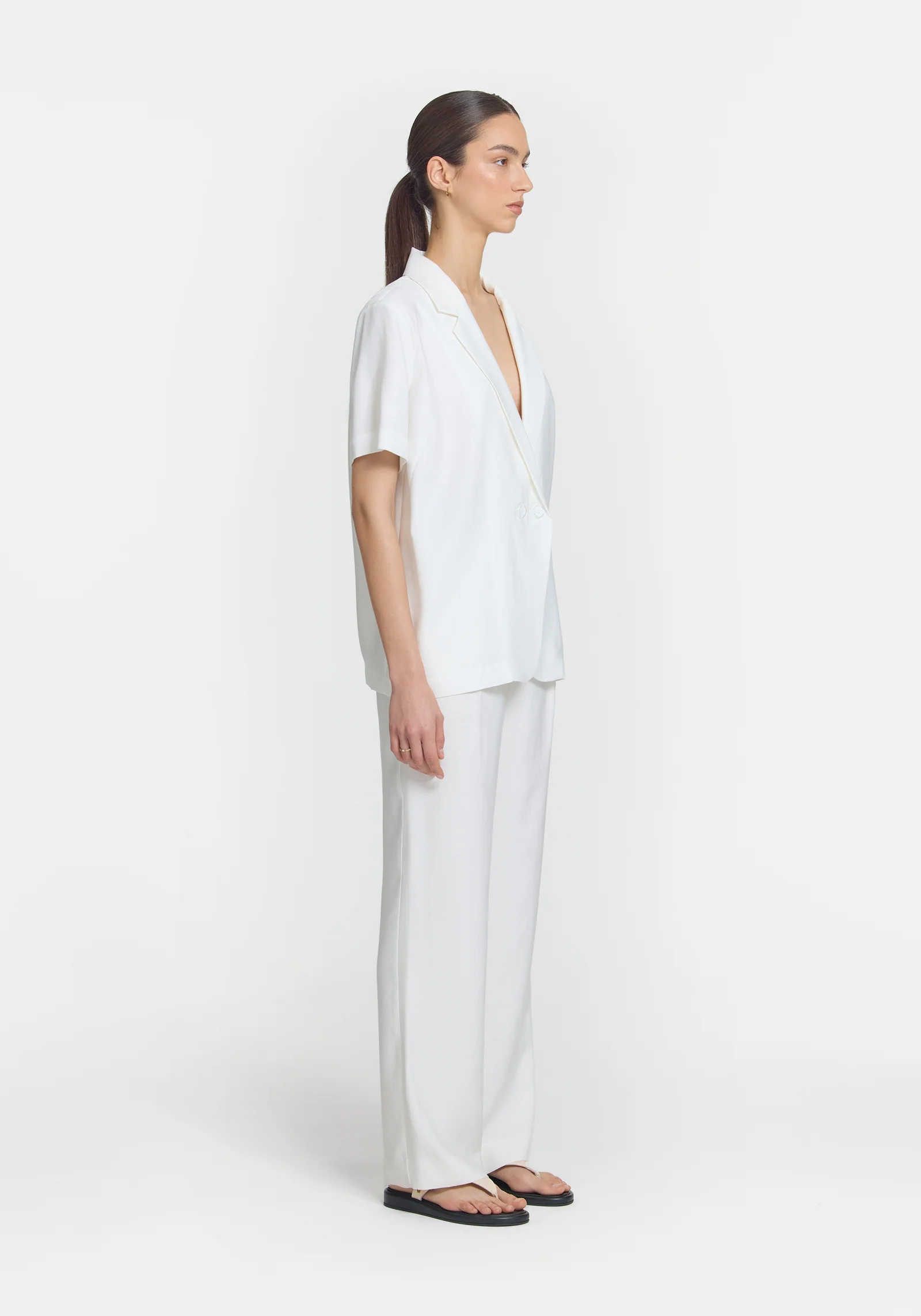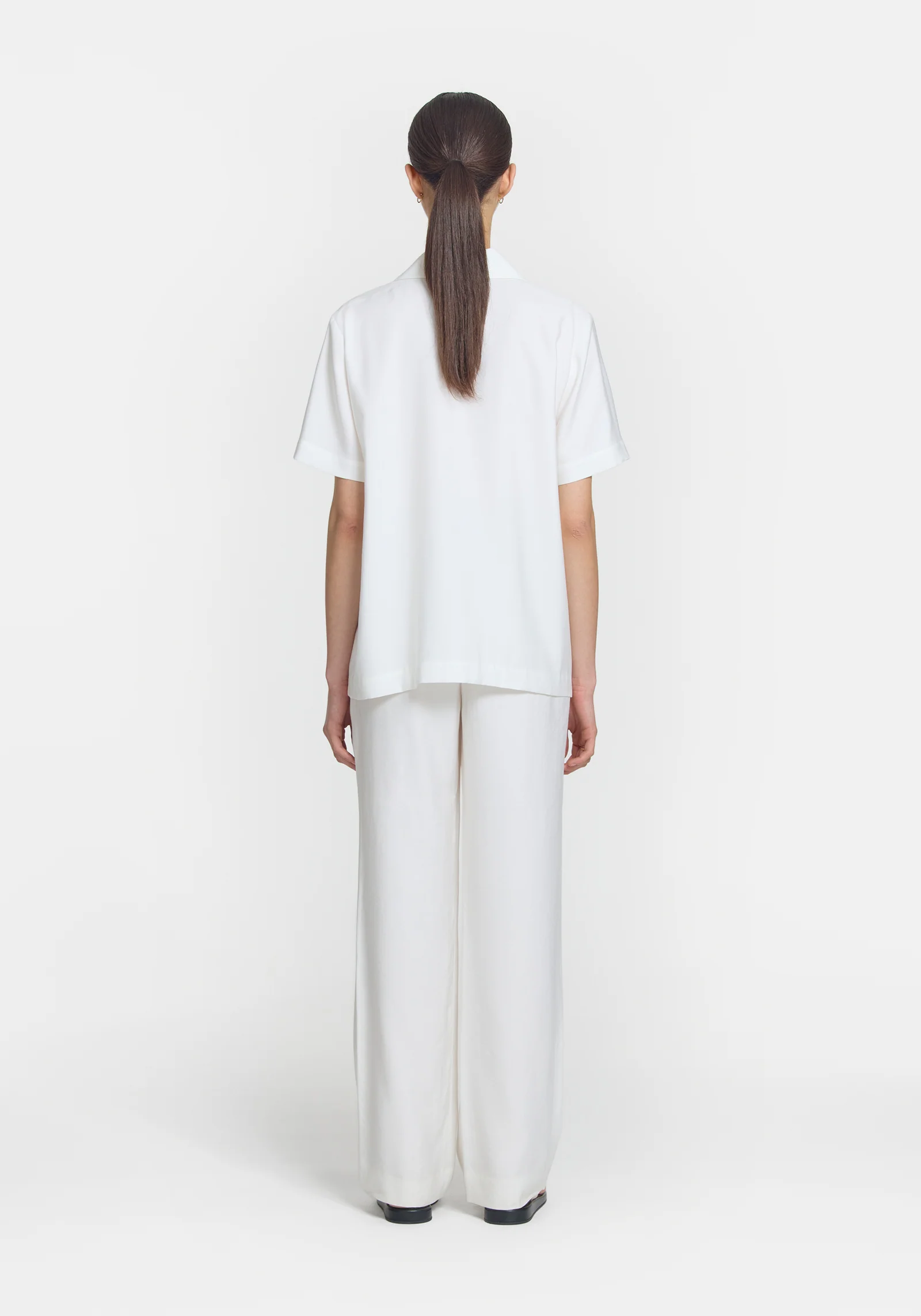 Introducing the Hepburn Shirt, tailored in a luxurious ivory bamboo blend. With its double-breasted front and relaxed fit, this piece offers timeless versatility.
