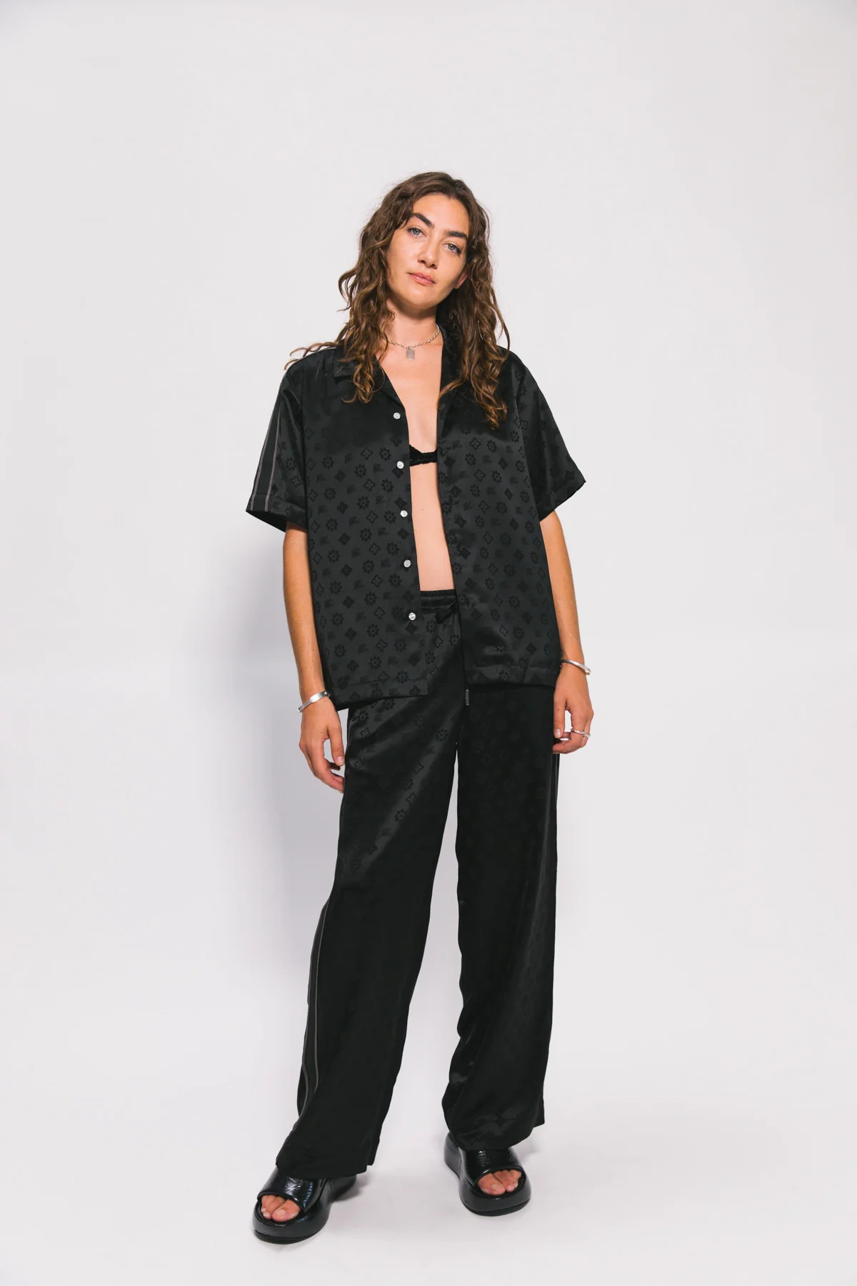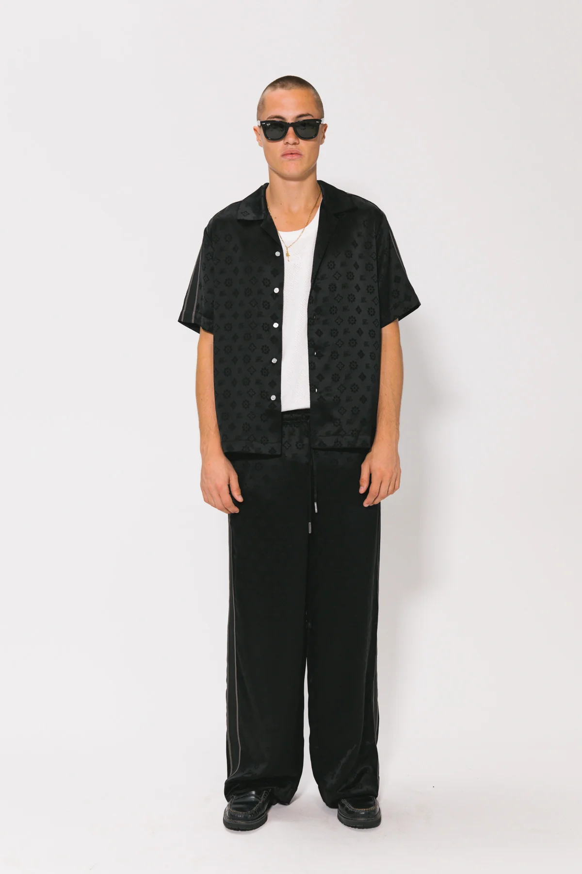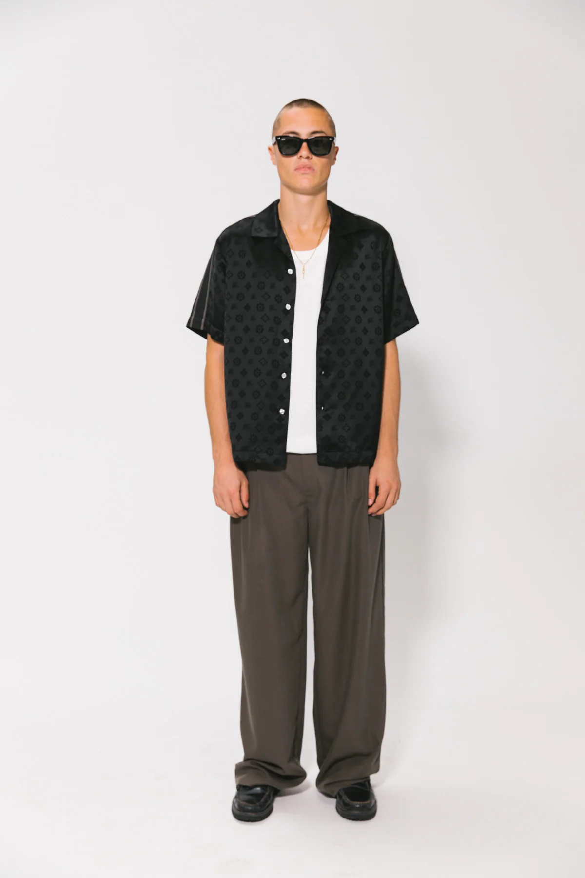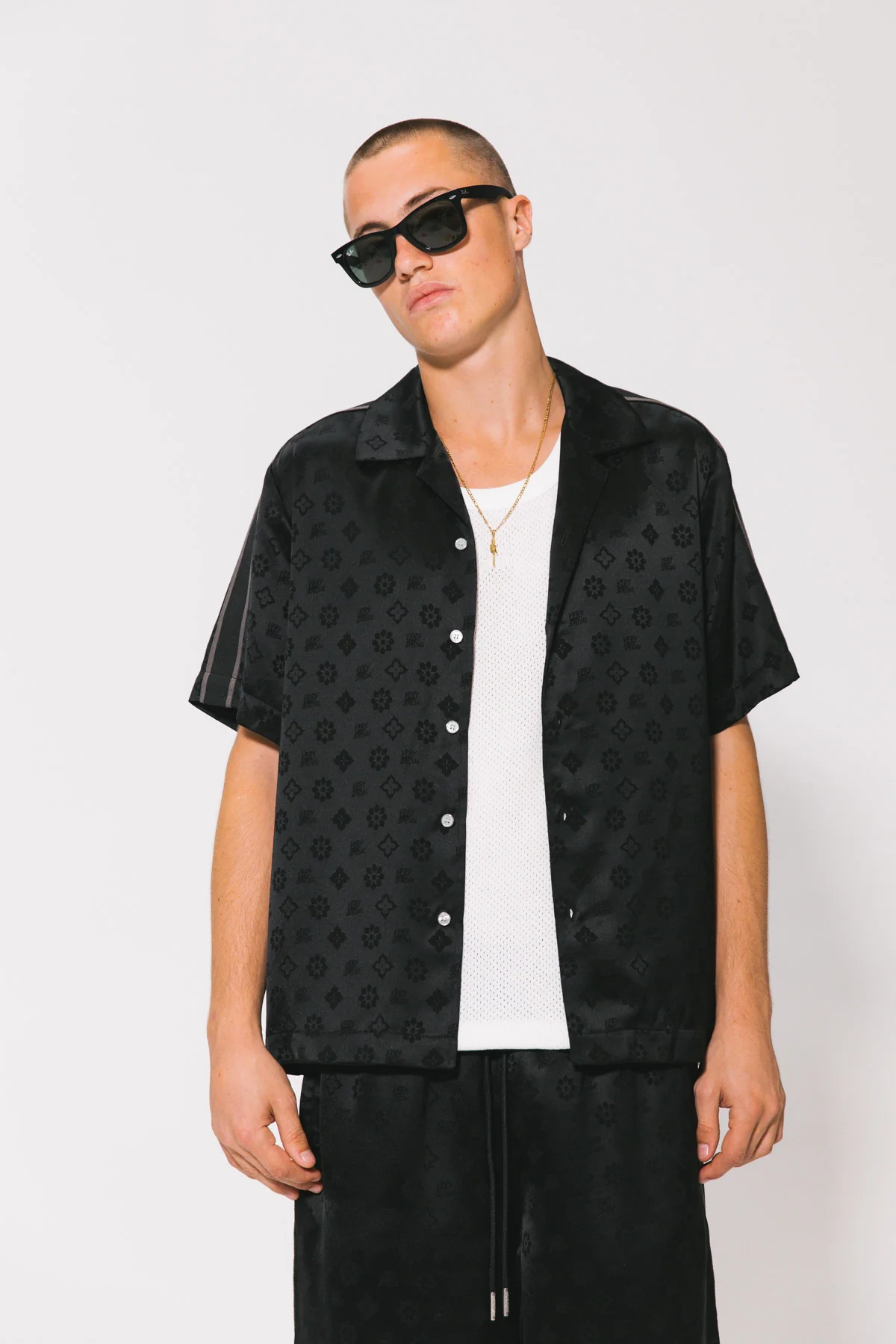 The Jacquard motif satin fabric is back in our top-selling Resort shirt. With tonal grey/black knitted jacquard stripe and pearl/silver metal buttons.