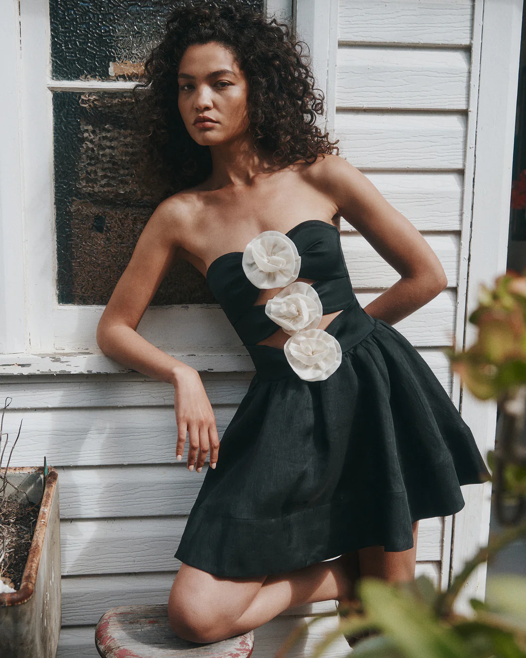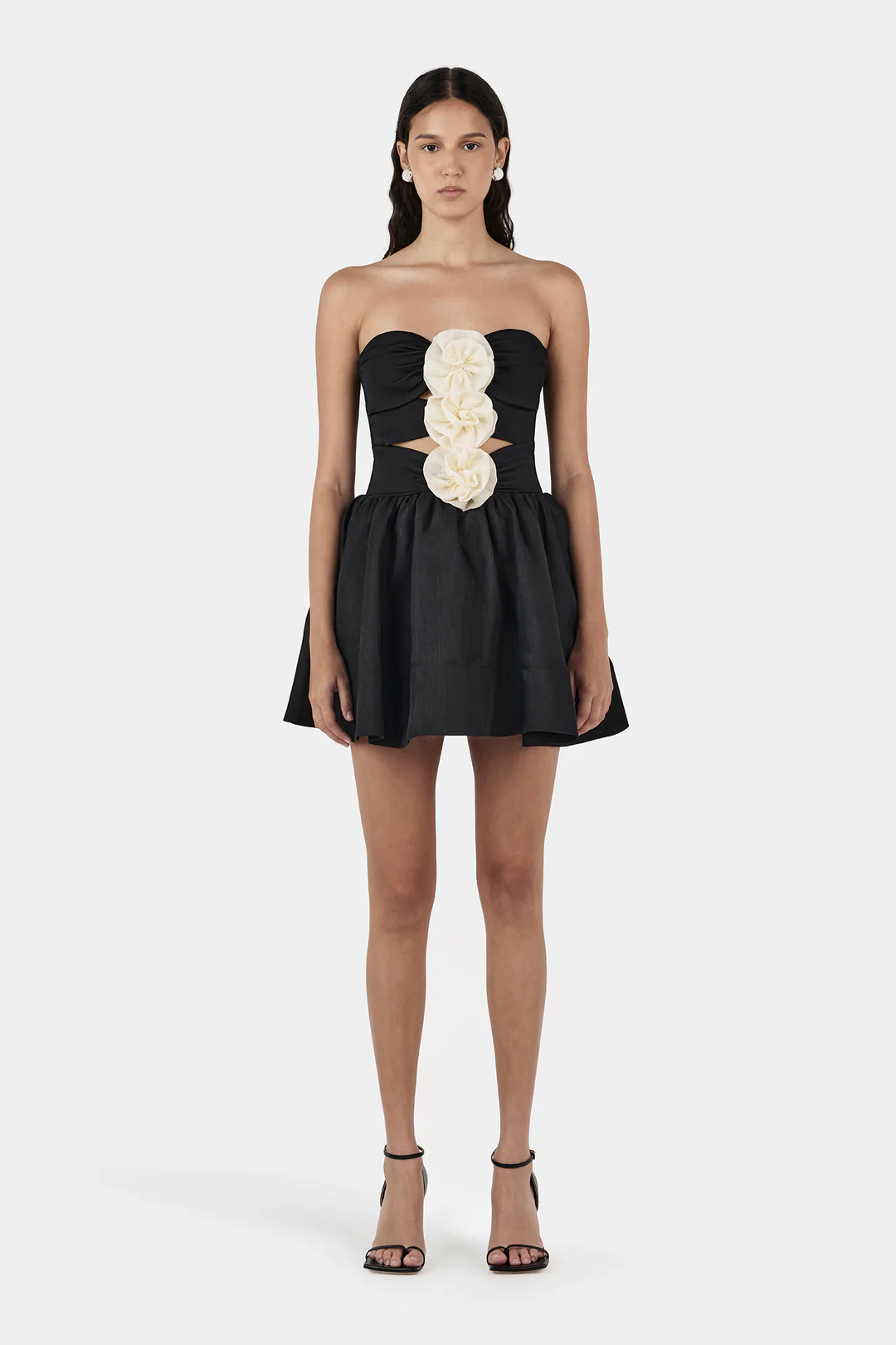 The Jacquie Mini Dress is a strapless mini with gorgeous contrasting flower appliques at the centre front. The dress has a full gathered skirt and internal boning from the bodice to the waist which provides subtle structure. Finished with an invisible centre back zipper and hook-and-eye closure for a clean silhouette.