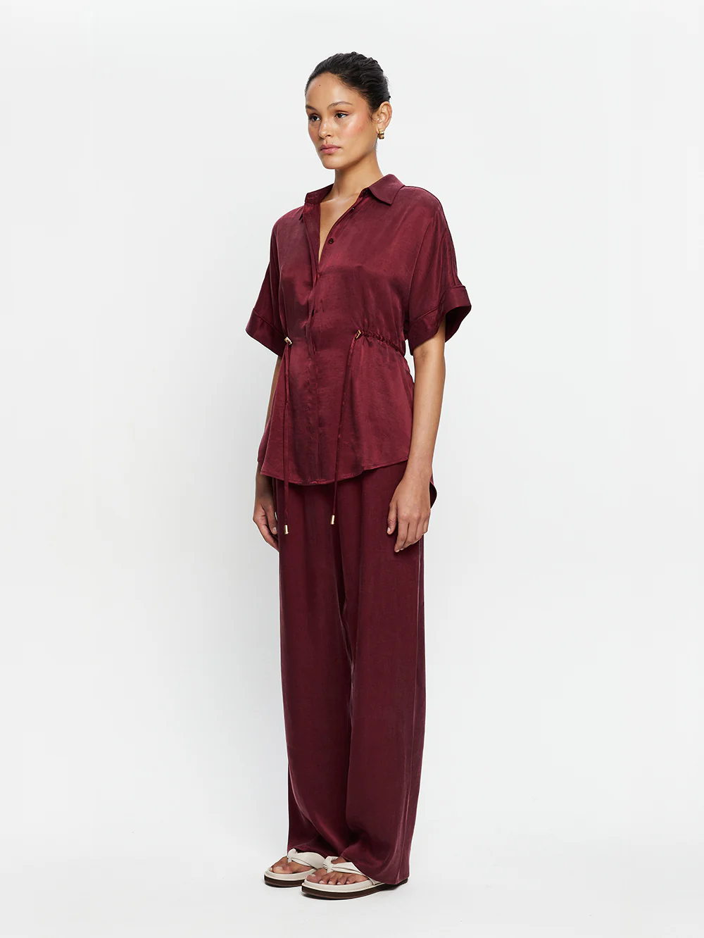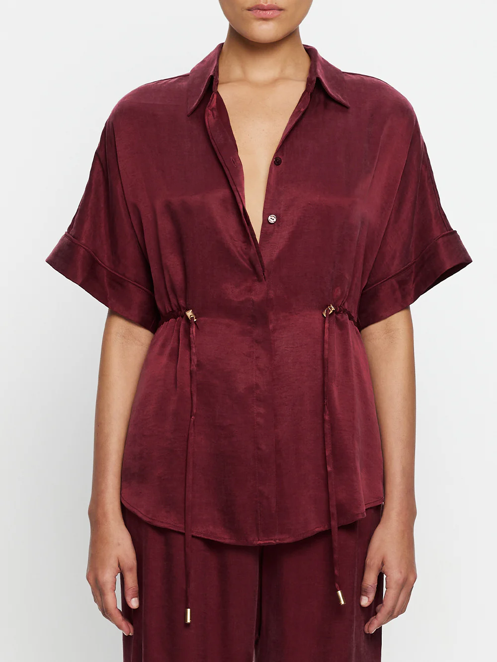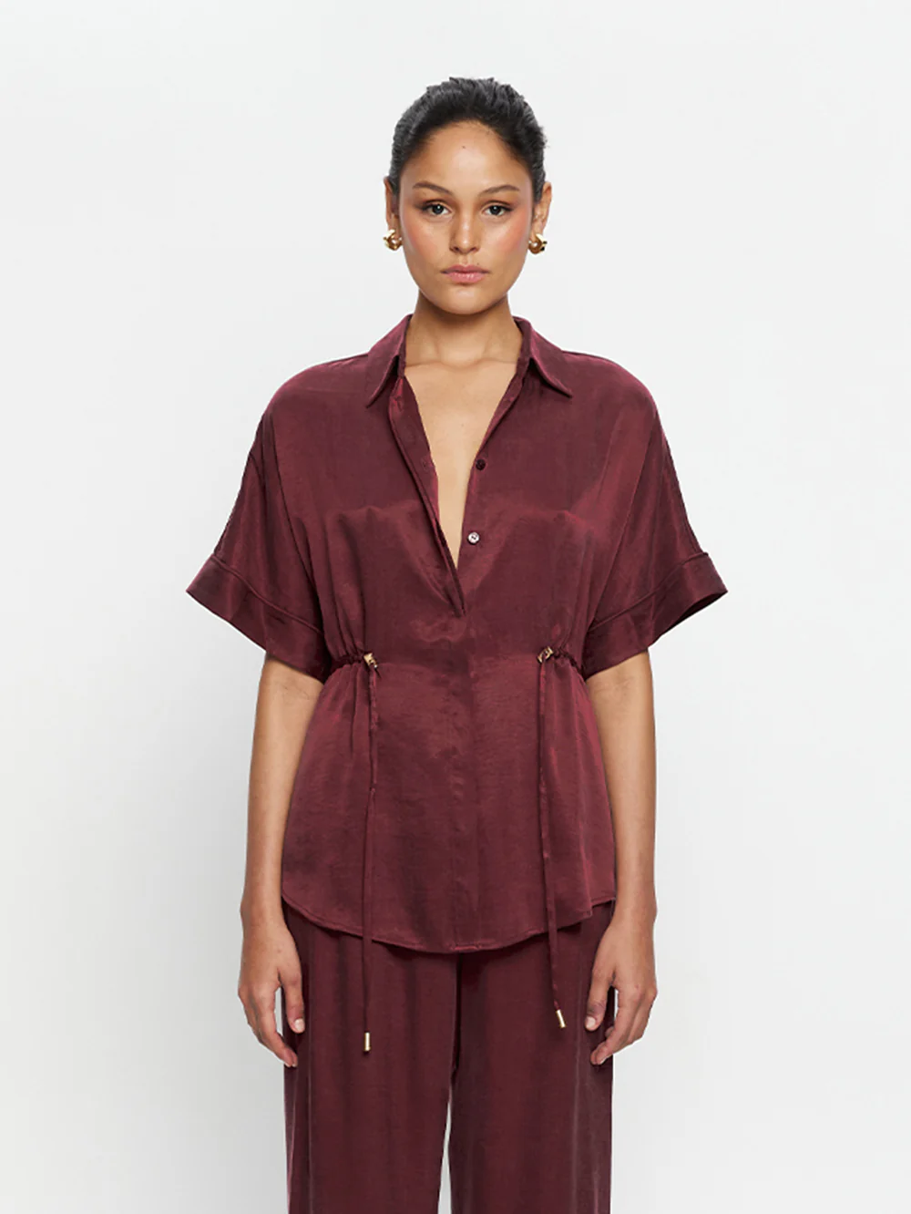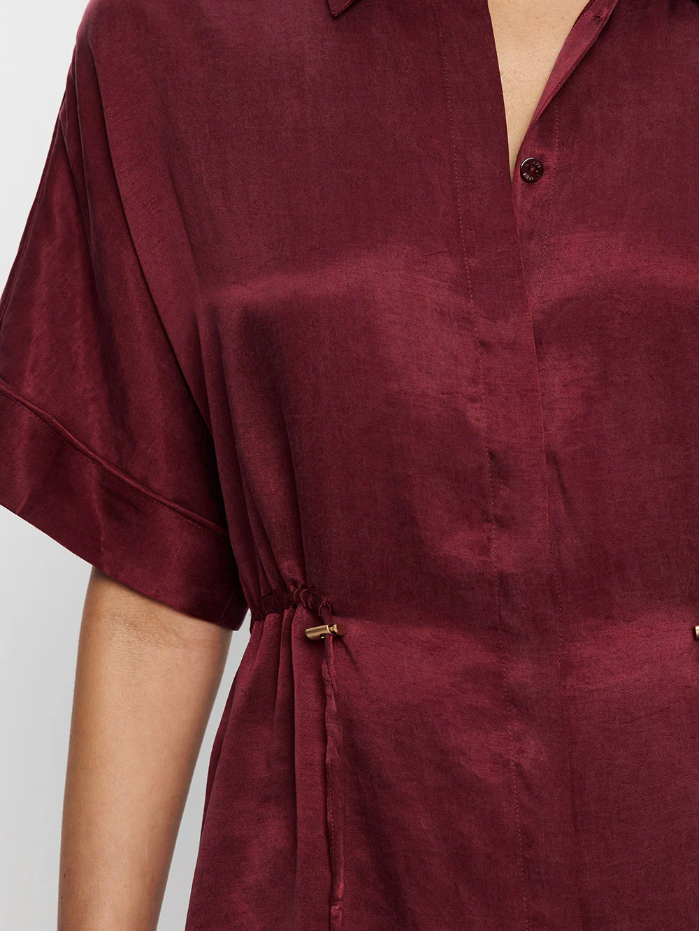 The Jaxon Shirt in plum is a relaxed shirt featuring short sleeves and a concealed button-down front, complete with adjustable drawcords at the waist for a softly defined shape. Designed for ease and versatility, it blends relaxed tailoring with refined simplicity. Style with the matching Jaxon Pant for a coordinated look, or pair with denim for effortless everyday wear.