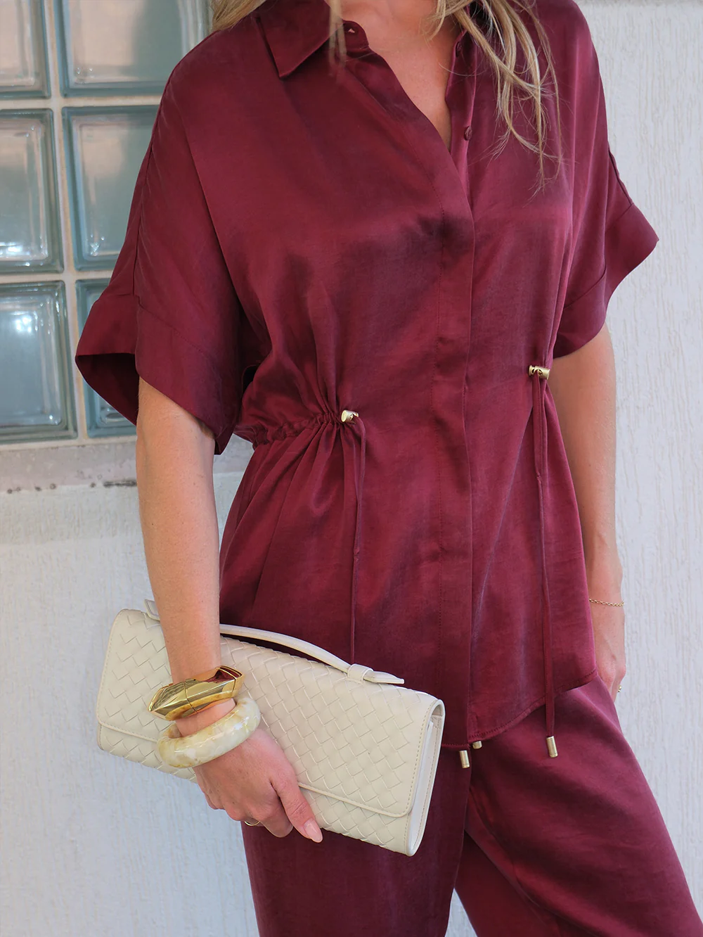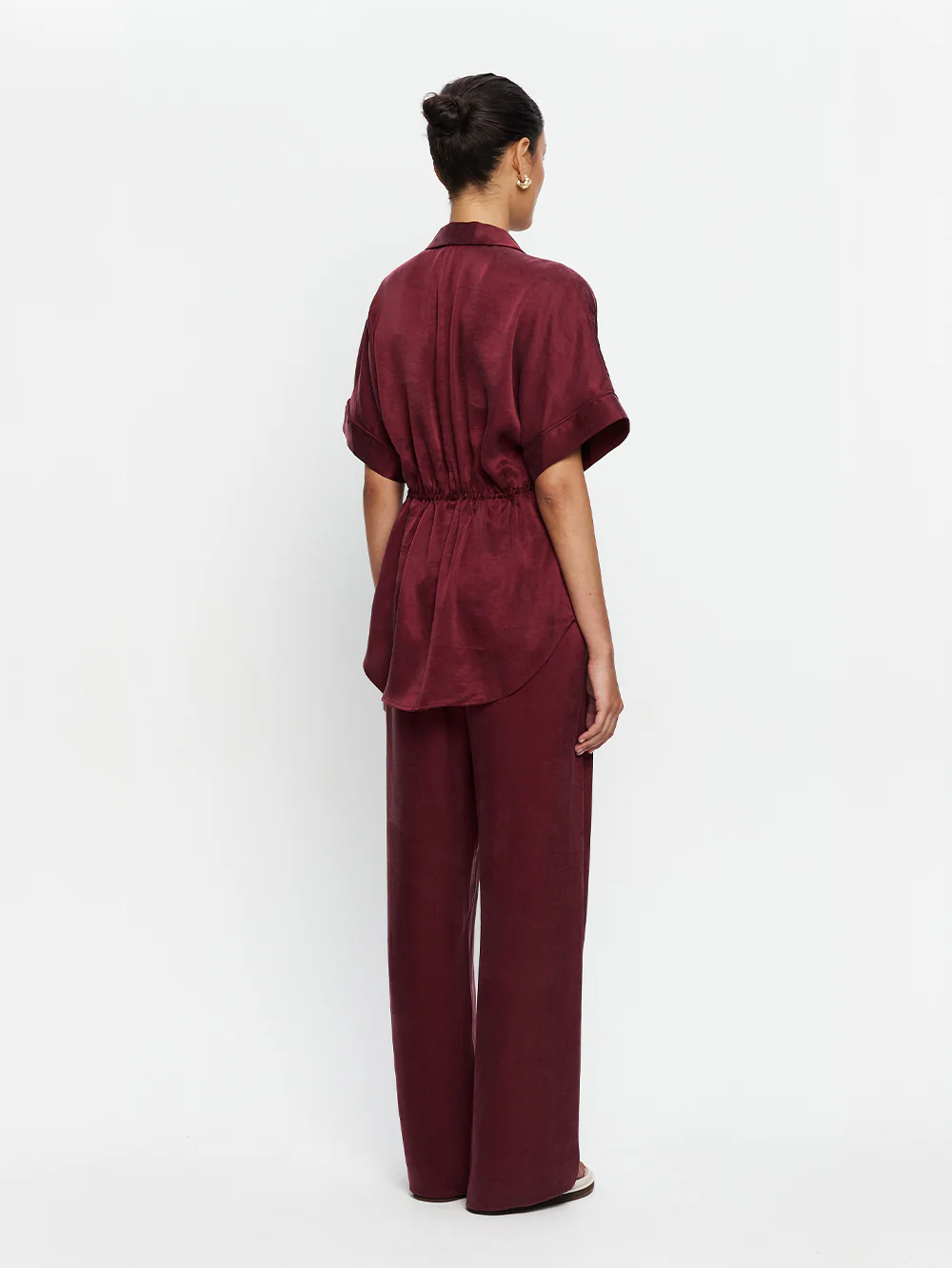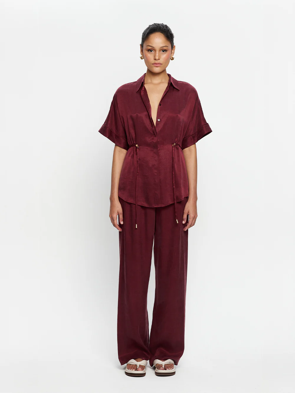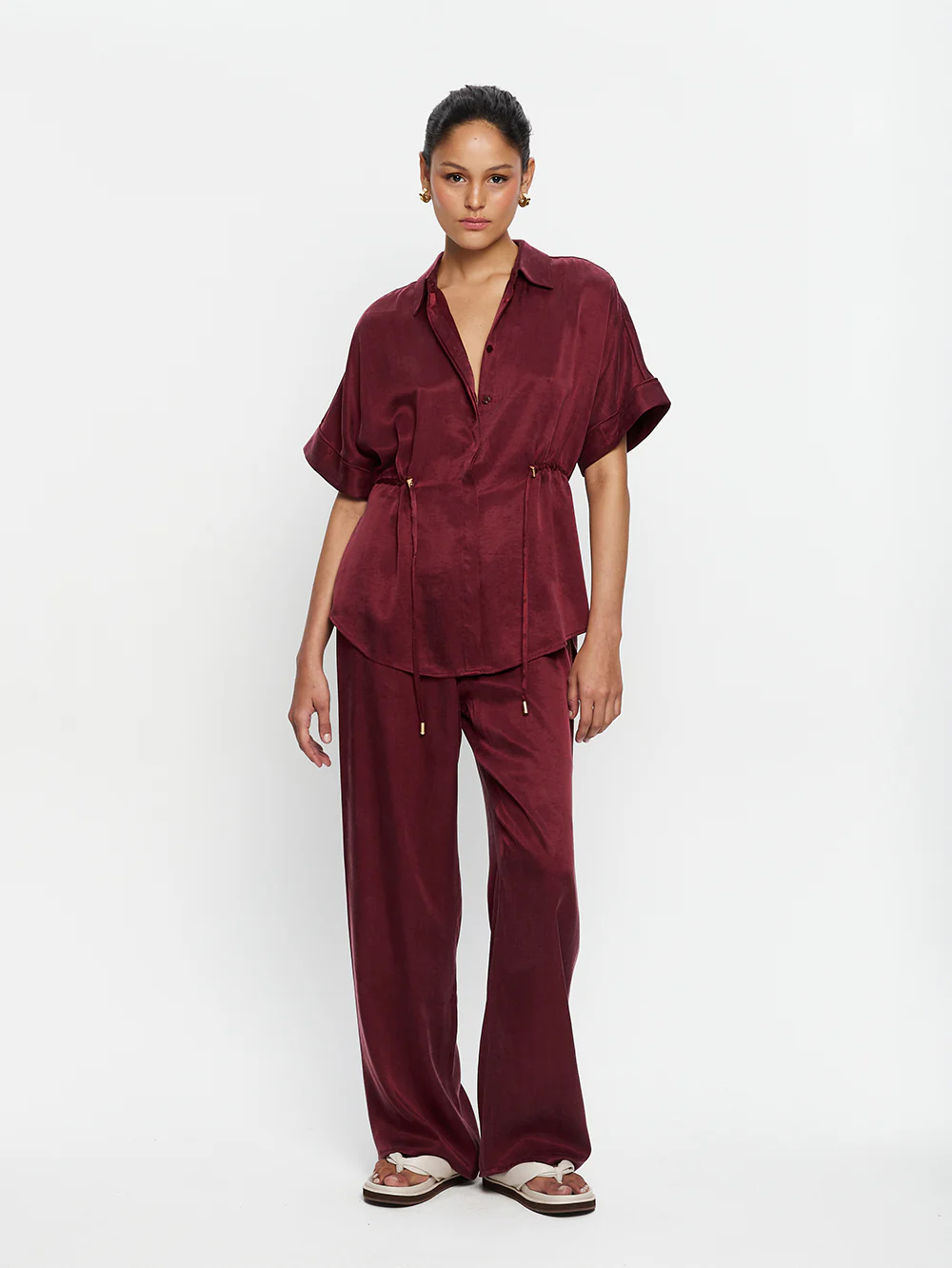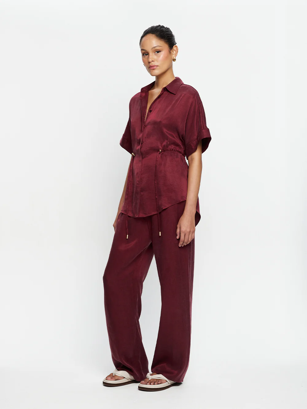 The Jaxon Shirt in plum is a relaxed shirt featuring short sleeves and a concealed button-down front, complete with adjustable drawcords at the waist for a softly defined shape. Designed for ease and versatility, it blends relaxed tailoring with refined simplicity. Style with the matching Jaxon Pant for a coordinated look, or pair with denim for effortless everyday wear.