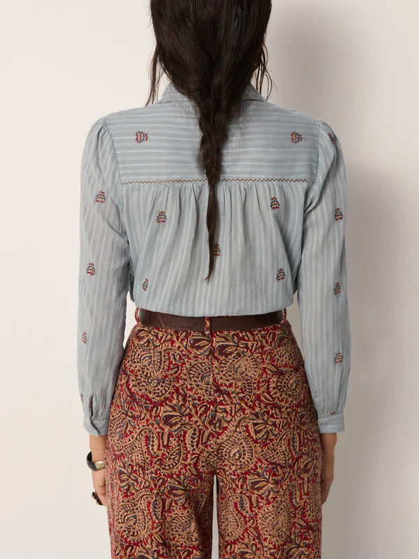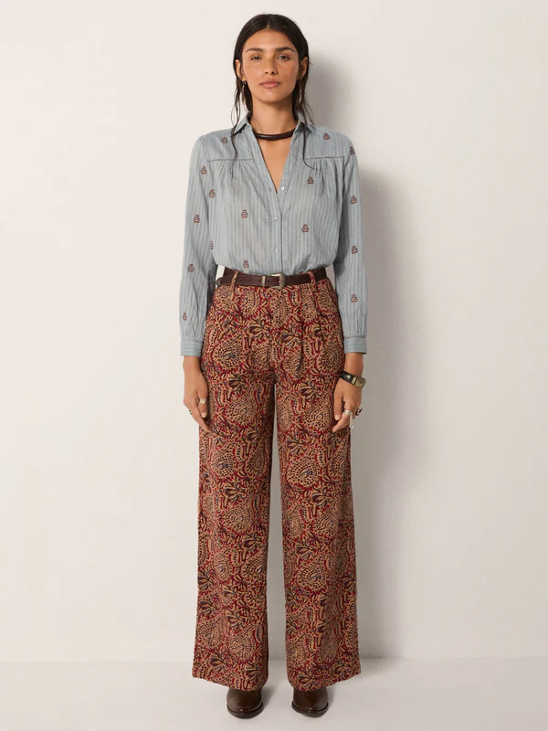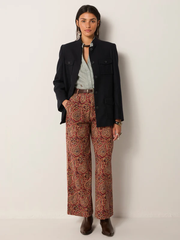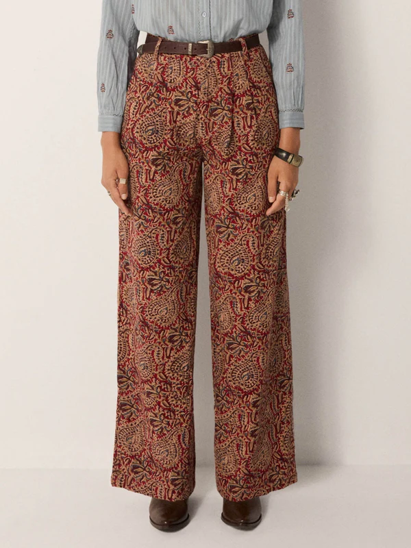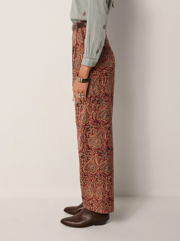 Wide-leg pant in cotton microcorduroy jacquard, drenched in deep burgundy and earthy sand tones. The swirling paisley pattern carries a richness that feels both grounded and ornate, like fabric collected from a far-off bazaar. Cut with volume through the leg and a high waist, they strike balance between comfort and statement.