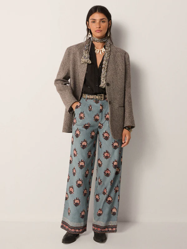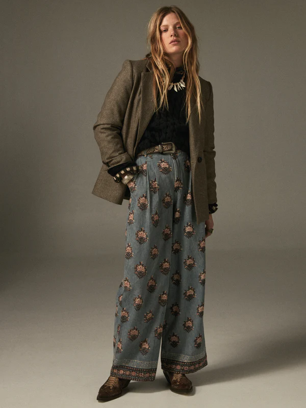 Light micro-corduroy with easy drape, cut to a wide-leg silhouette. The cloth feels soft yet substantial, holding structure without stiffness.