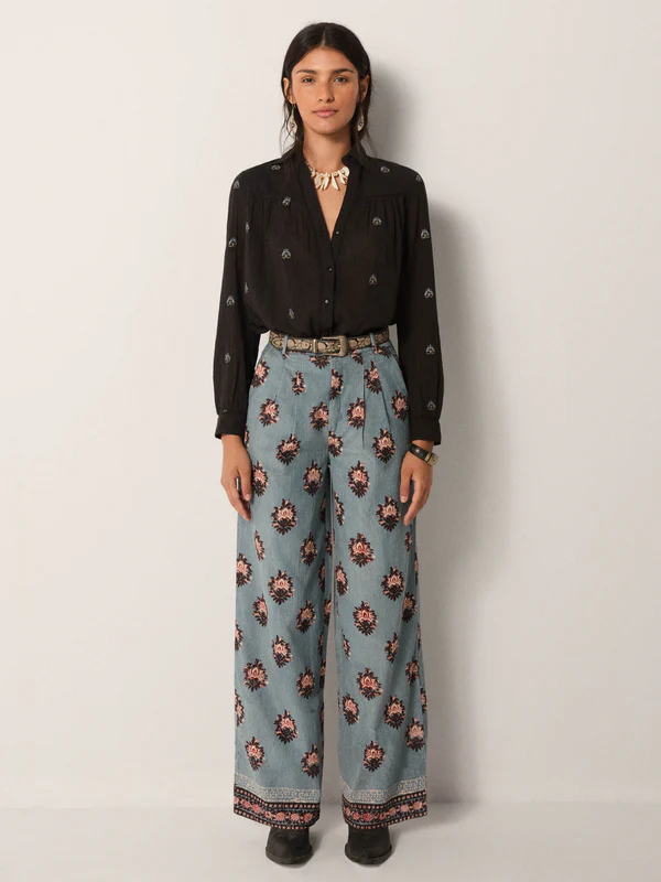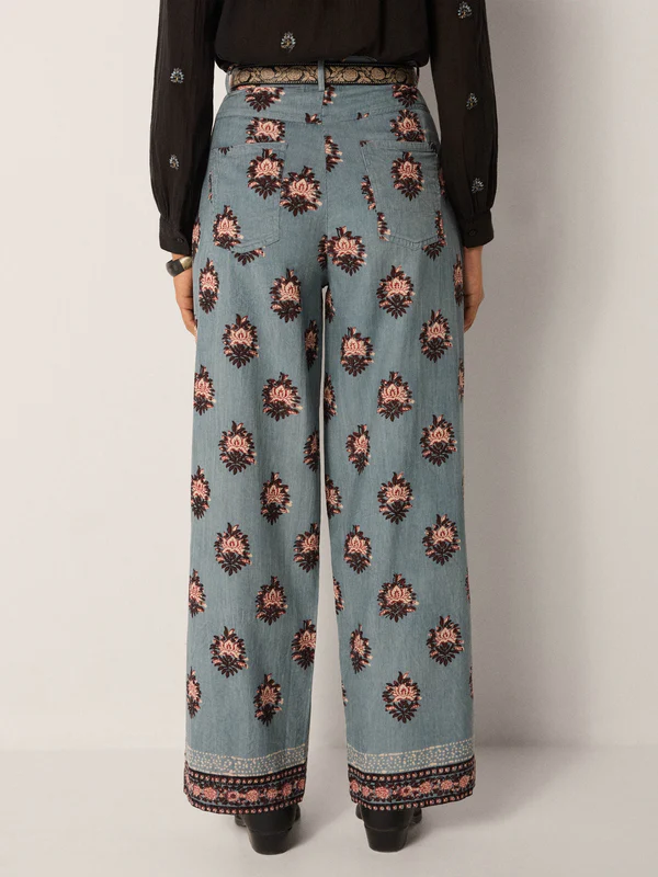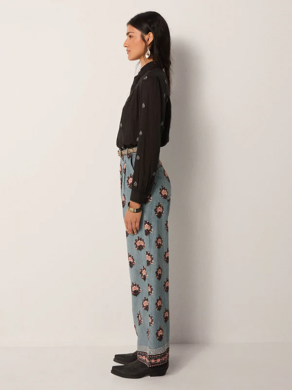 Rose medallions print across cerulean ground, hem finished with a fine border. The design recalls repurposed textile panels, rhythmic and bold.