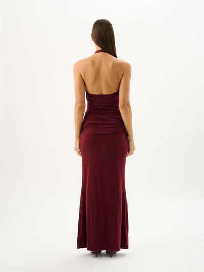 Crafted in a luxe Sangria cupro, the Julietta Halter Dress is defined by its flattering fitted silhouette and refined halter neck cut. Featuring a ruched waist with tie detailing, custom ROAME. hardware and a fluid maxi length, it embodies understated elegance for evening moments.