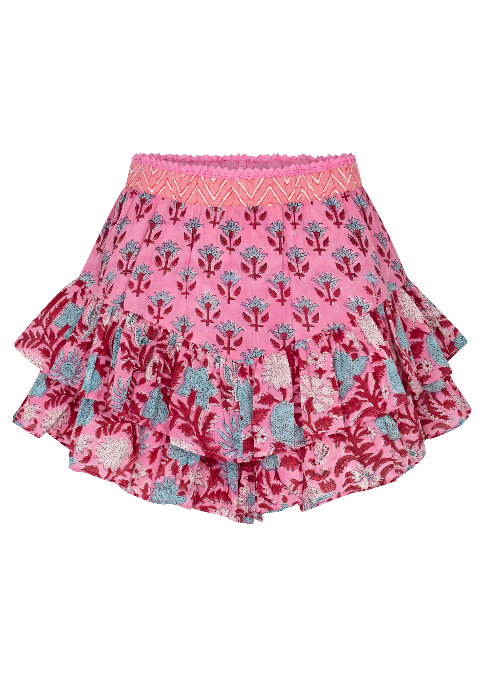 The Kamala Block Print Fae Frill Skort brings playful movement and handcrafted character to an easy summer silhouette. Designed with a soft, gathered waistband and layered frill hem, the piece combines the ease of shorts with the feminine feel of a skirt.