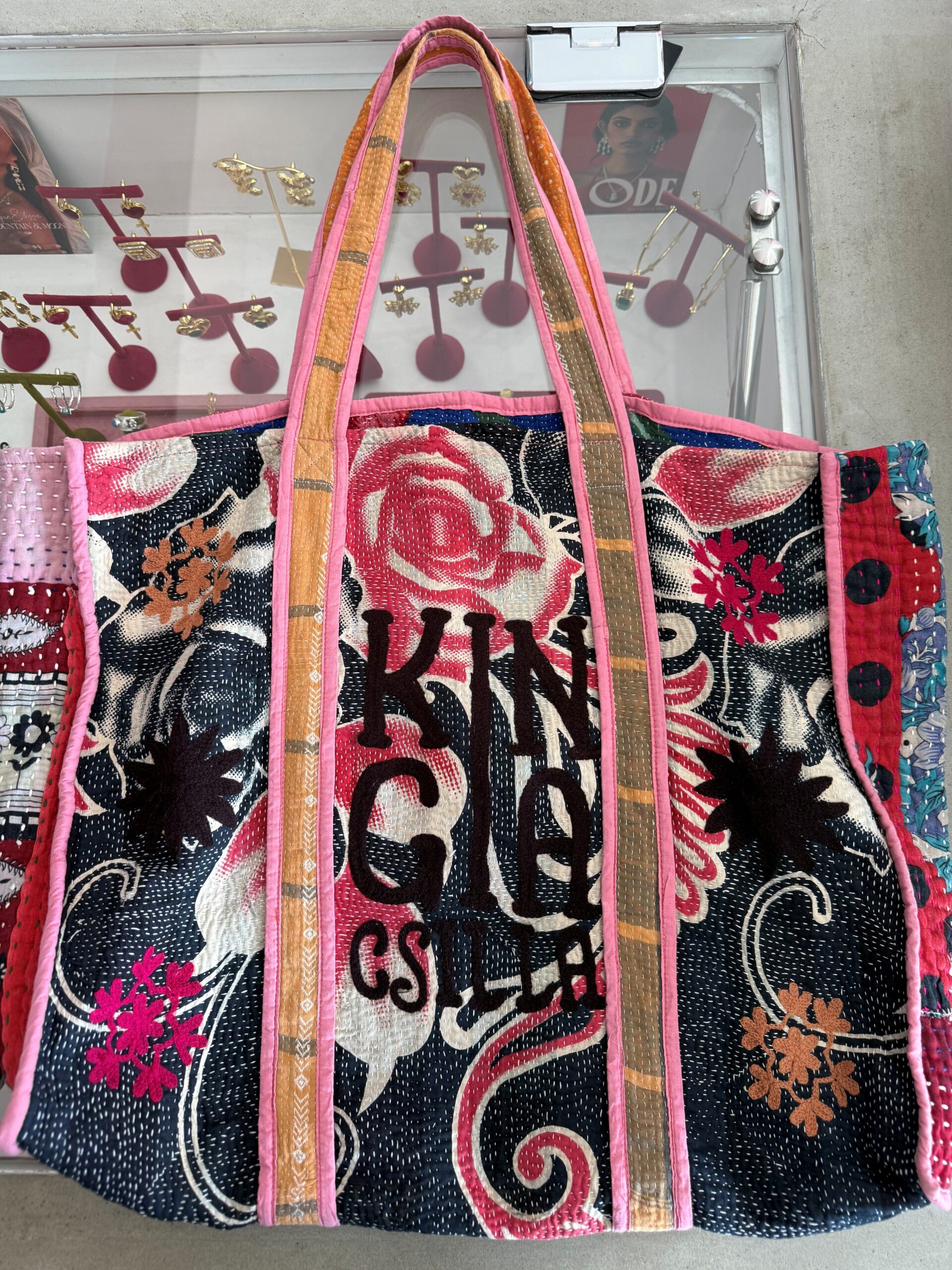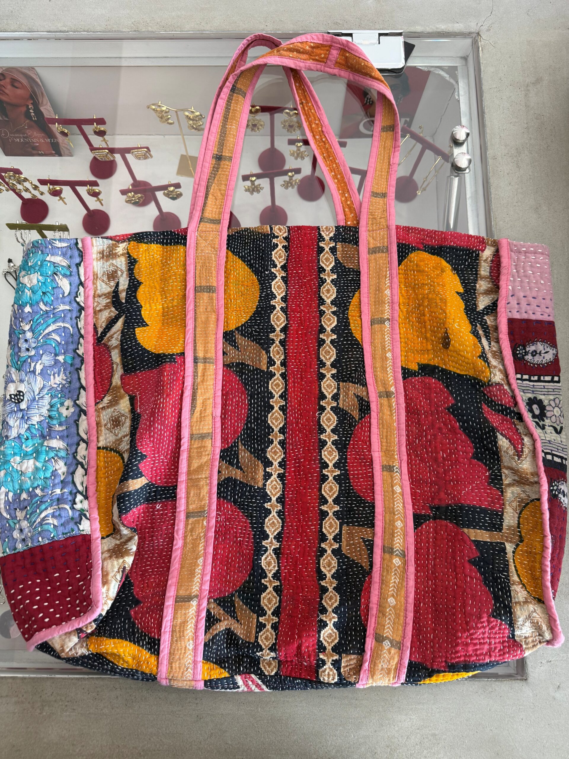 A handcrafted Indian block-printed Kantha bag with vibrant patterns, designed to add a bold, artisanal touch to your everyday style.