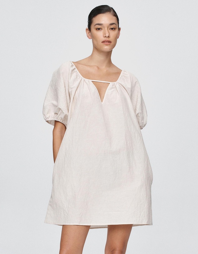 A relaxed mini dress with a gentle A-line shape. The wide square neckline is softened by a narrow strap that creates a subtle v shape cut-out, while balloon sleeves are gathered to lend volume and ease. Designed for a relaxed fit offering an understated sense of femininity and simplicity.