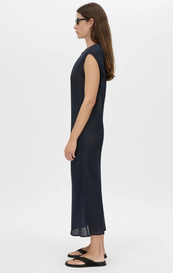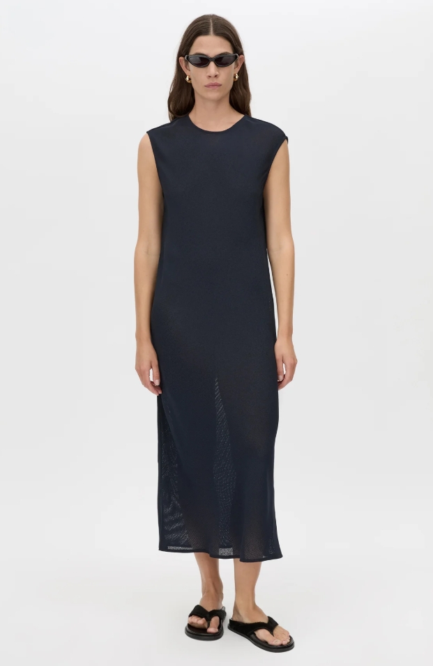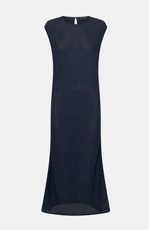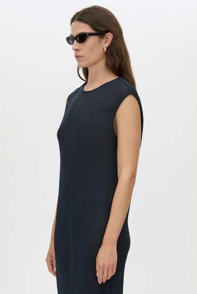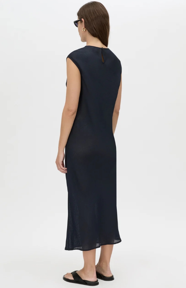 CAMILLA AND MARC Kenya navy shell midi dress. Relaxed bias cut silhouette. Button and loop closure at centre back. Double turn hem.