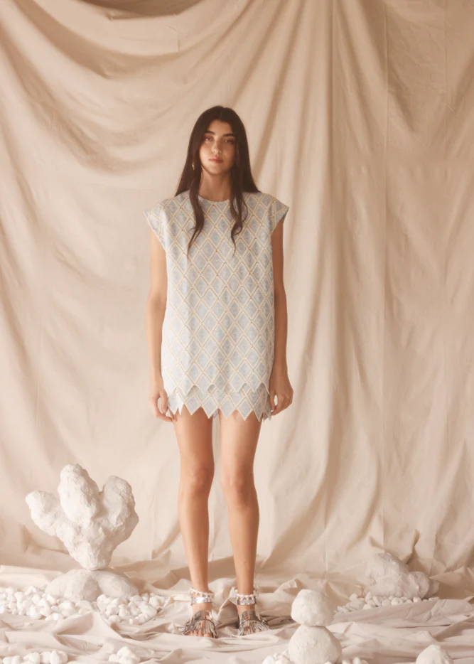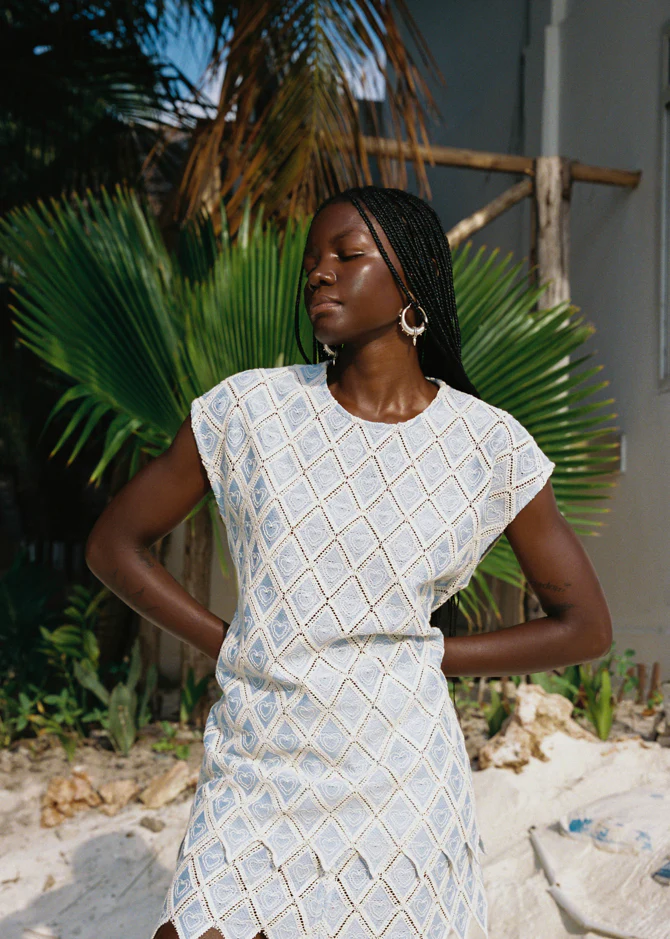 The Laguna Amante Blouse in soft blue is a refined celebration of artisanal craftsmanship. This exquisite piece features an intricate geometric diamond pattern created through delicate hand-finished embroidery and cutwork in sky blue and golden beige tones. With its gently structured silhouette, cap sleeves, and crew neckline, this handcrafted blouse screams sophistication. Perfect for pairing with the matching Laguna Lita Mini Skirt or styling separately for versatile resort elegance.