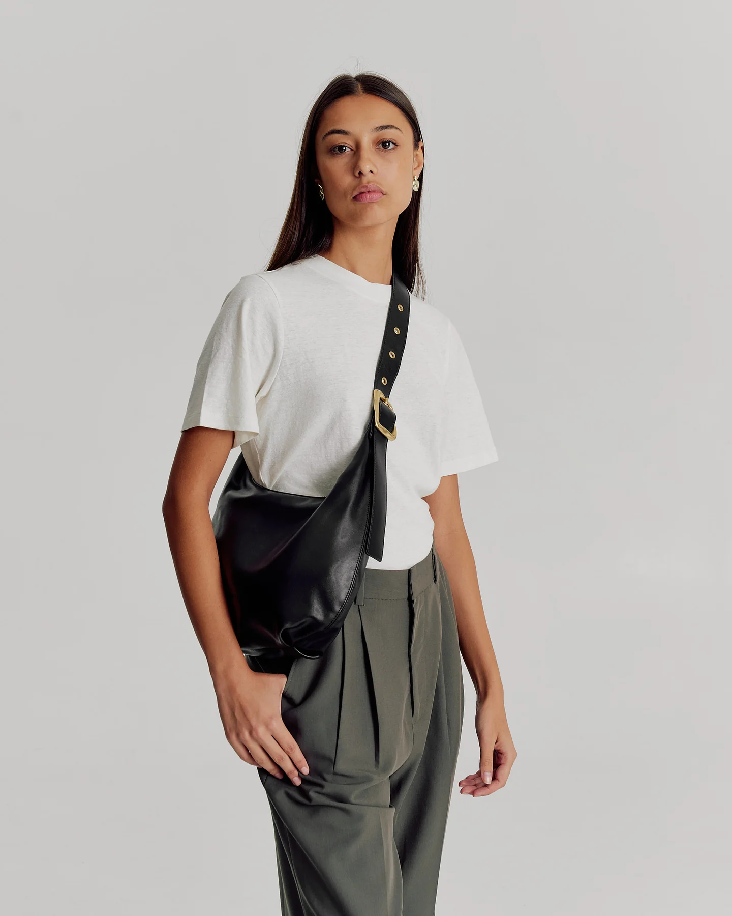 The most wanted Everyday Croissant Bag is now available. Embellished with a brass buckle and multiple eyelets to adjust to the ideal length, its ample size takes you from work to the weekend.