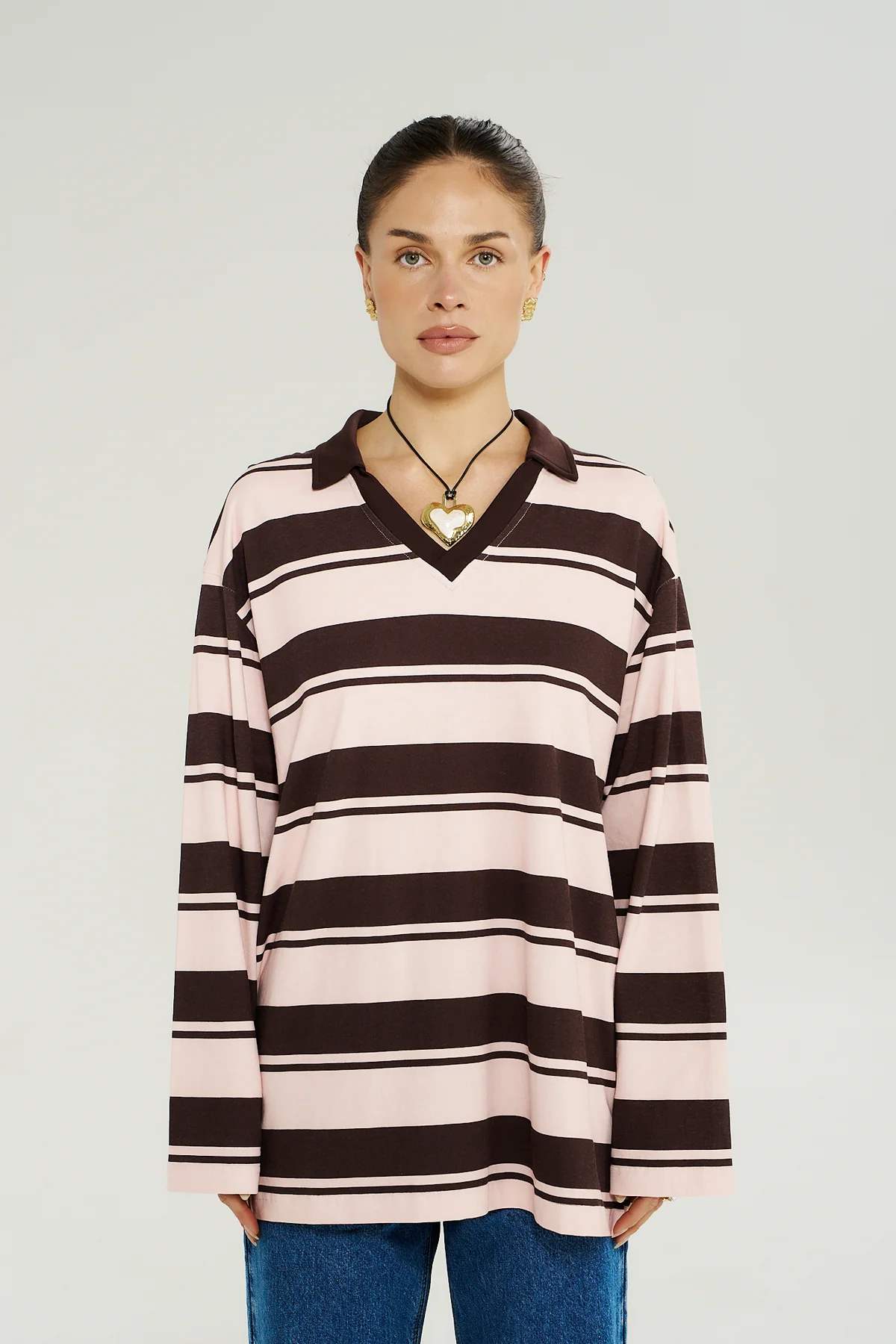 A modern take on the classic polo, this long sleeve top features rich Choc Rose stripes that feel both sporty and refined. The fitted shape makes it perfect for layering or wearing as a statement on its own. Ideal for transitional weather, travel days, or relaxed dinners.