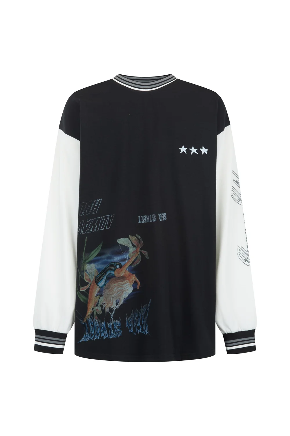 The best selling long sleeve bock tied back with contrast panels, premium jacquard ribbing with Hayley’s Metallic Diver illustration. A relaxed fit piece that balances bold graphics with a vintage finish.