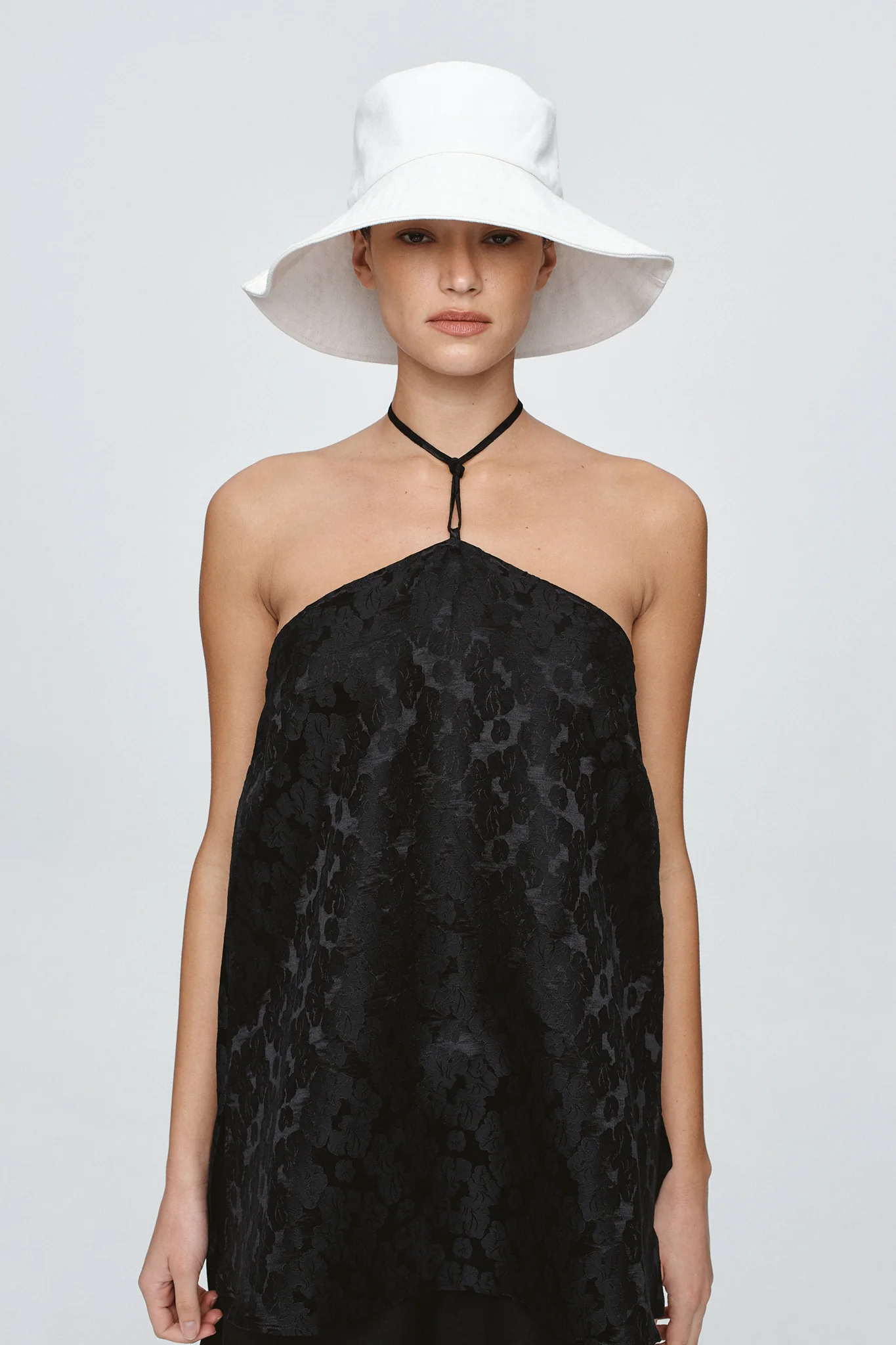 The Nonna Hat is a classic wide-brim bucket silhouette crafted from a structured cotton canvas. It features a deep crown and a generous downward brim providing full sun coverage. The internal edge is finished with a clean bias bind for comfort and durability.