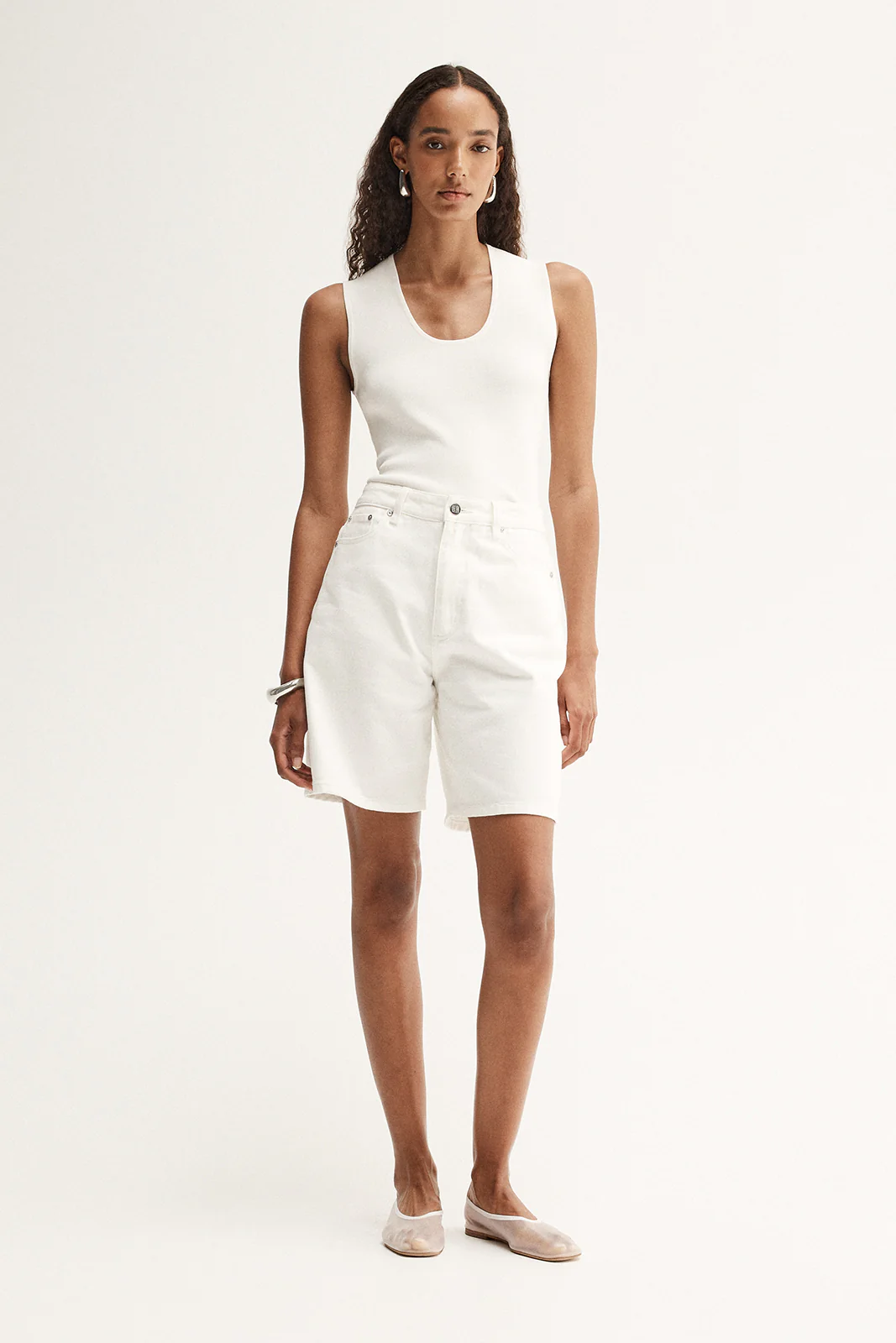 The best-selling jeans in a summer style, the Odin Short is our new denim staple. Made of 100% cotton in our ivory wash, the Odin Short is cut to a high waisted fit with button and zip fly, classic 5-pocket styling, and a relaxed, wide leg silhouette. Sitting just above the knee, the Odin Short pairs perfectly with our range of premium basics.