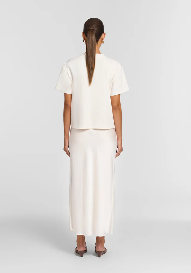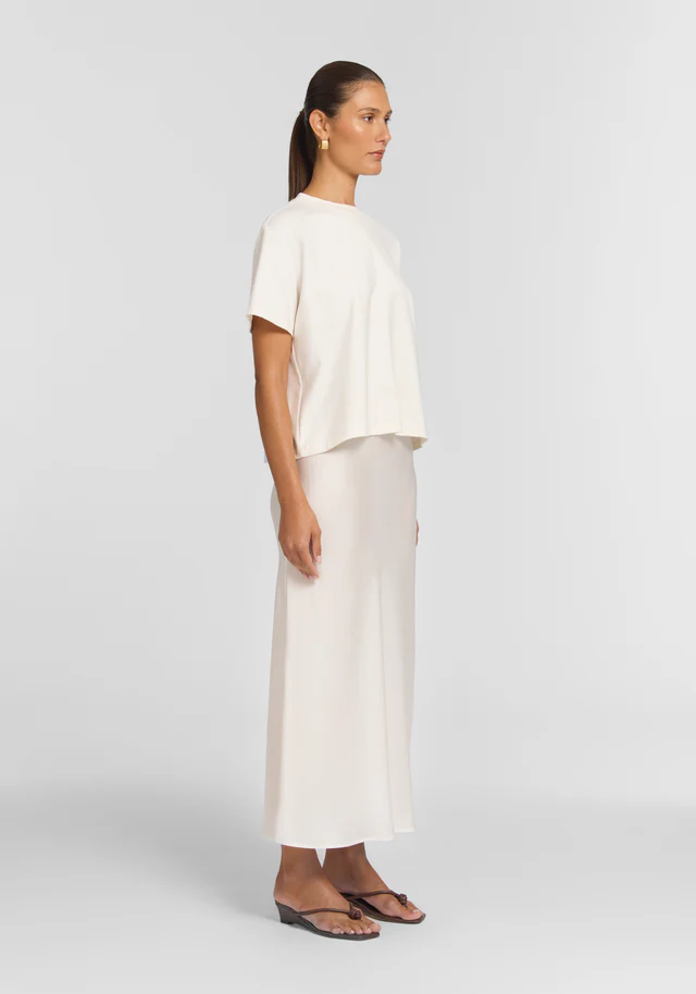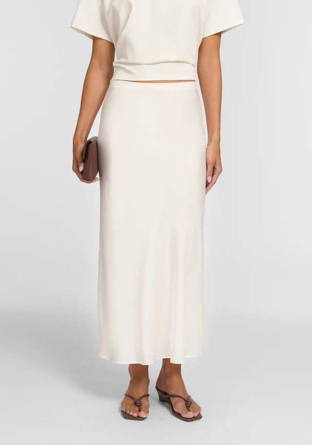 Introducing the Othello Skirt, a sophisticated staple crafted from a signature cupro blend in classic ivory. Cut on the bias with a mid-rise silhouette and midi length, it drapes elegantly for a flattering fit. Effortlessly integrate into your elevated or everyday outfitting, embodying timeless elegance for any occasion.