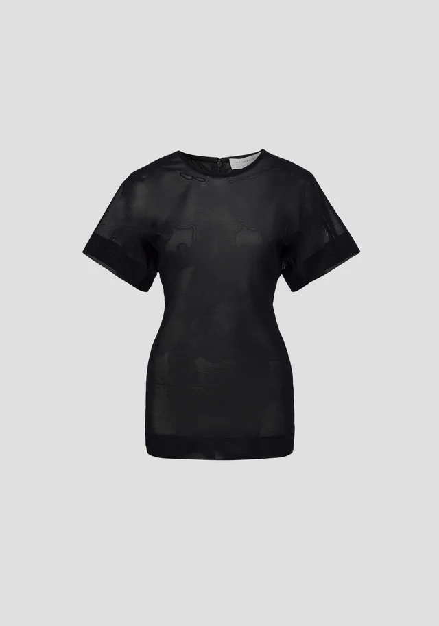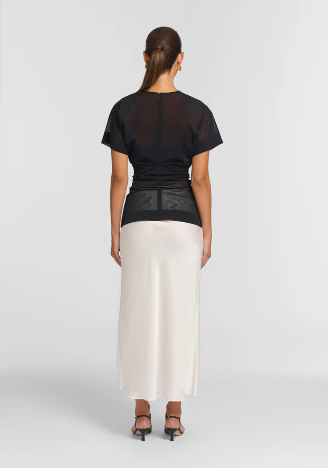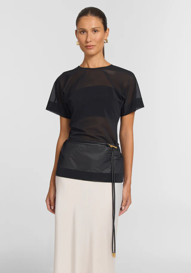 An elevated essential, the Polaris Top is crafted from signature V&W Powermesh in black, fusing elevated ease with modern proportions. Defined by an extended shoulder silhouette and crew neckline, this structured tee features back waist tucks that cinch the waist.