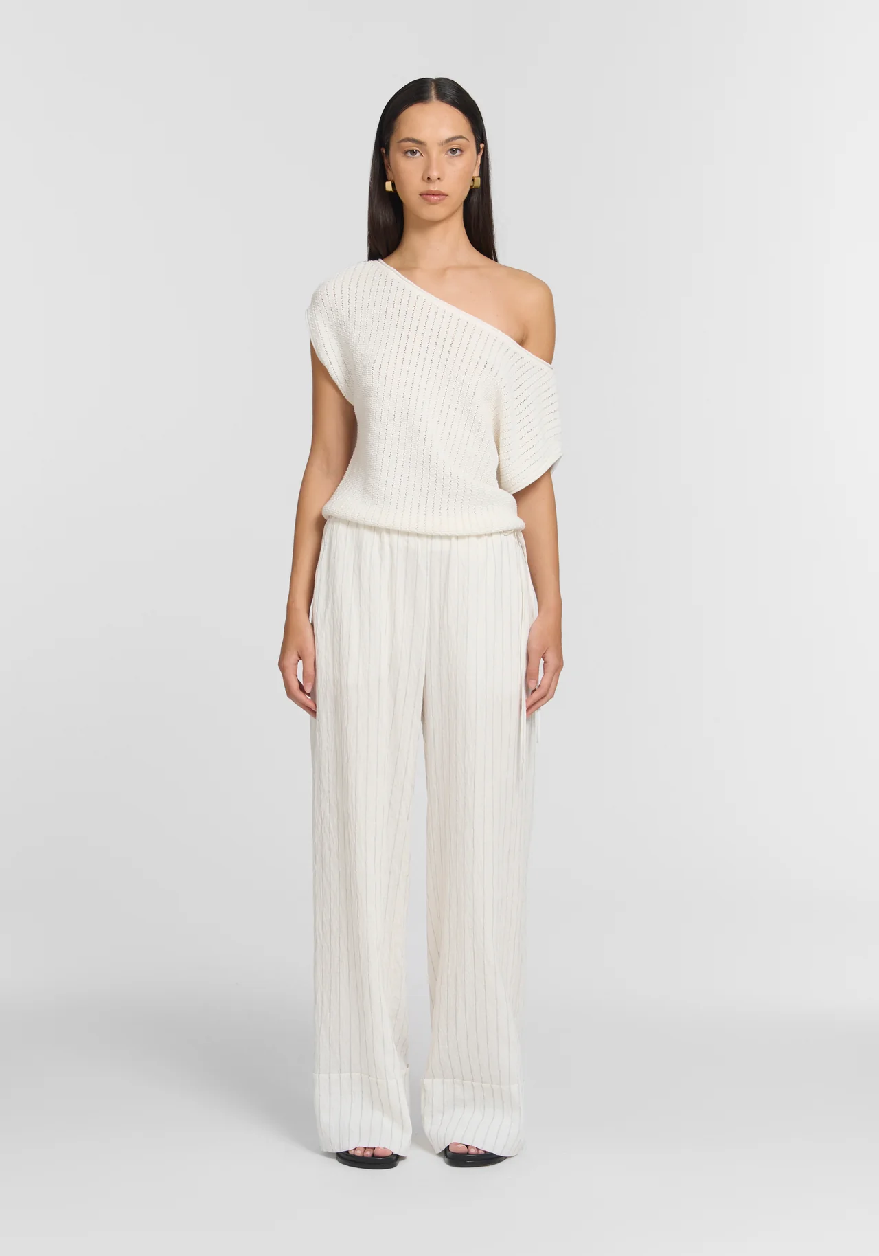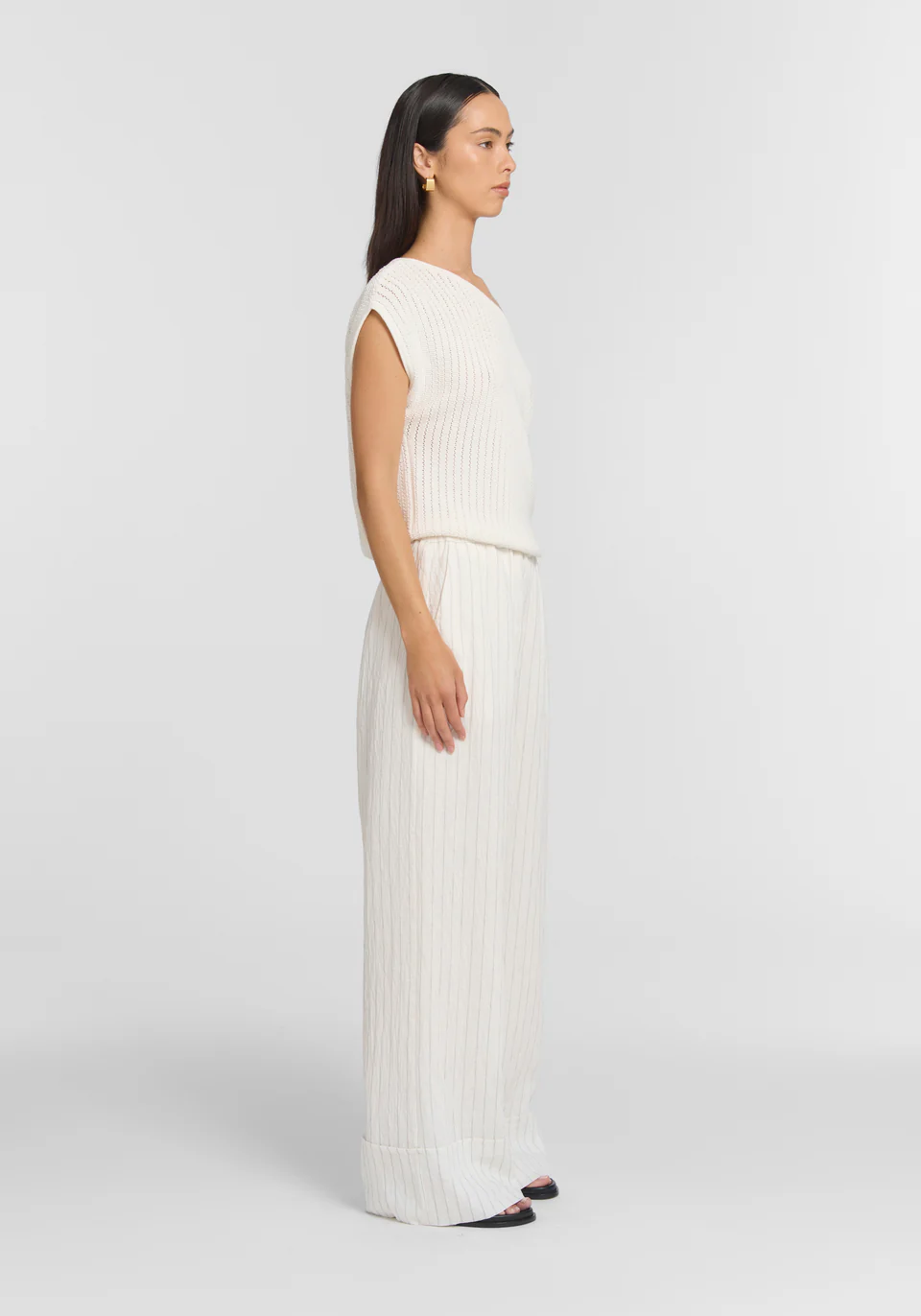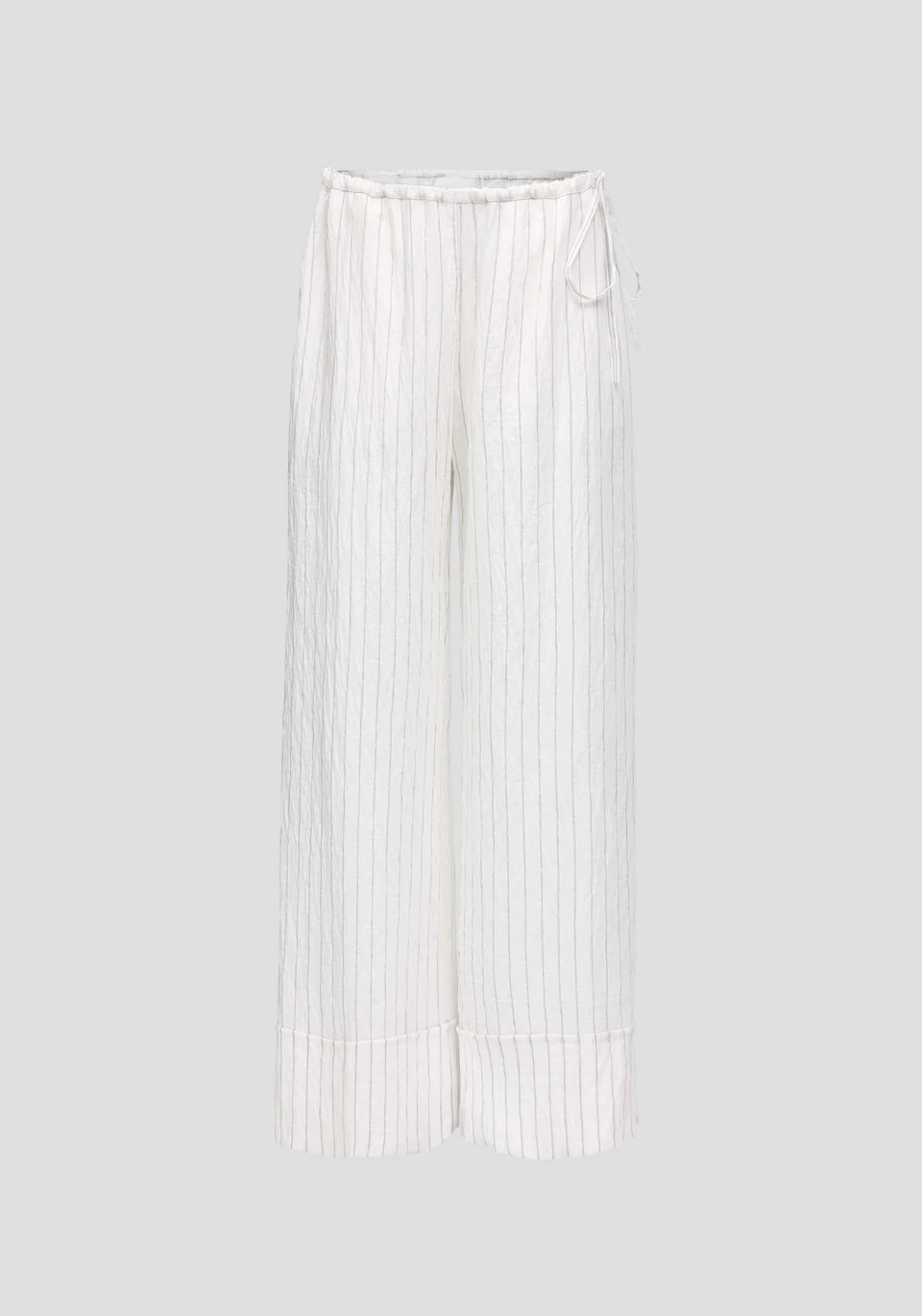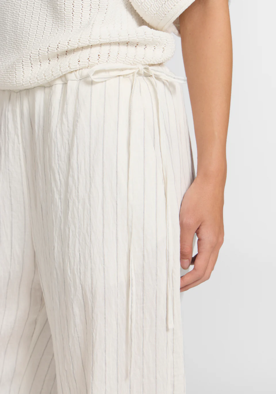 The Redford Trouser, realised in a lightweight, fluid textile with a neutral stripe, introduces a fresh calm to modern dressing. Designed with a relaxed wide-leg profile, an elasticated waist, exposed tie detail, and pockets, it delivers an effortless summer staple.