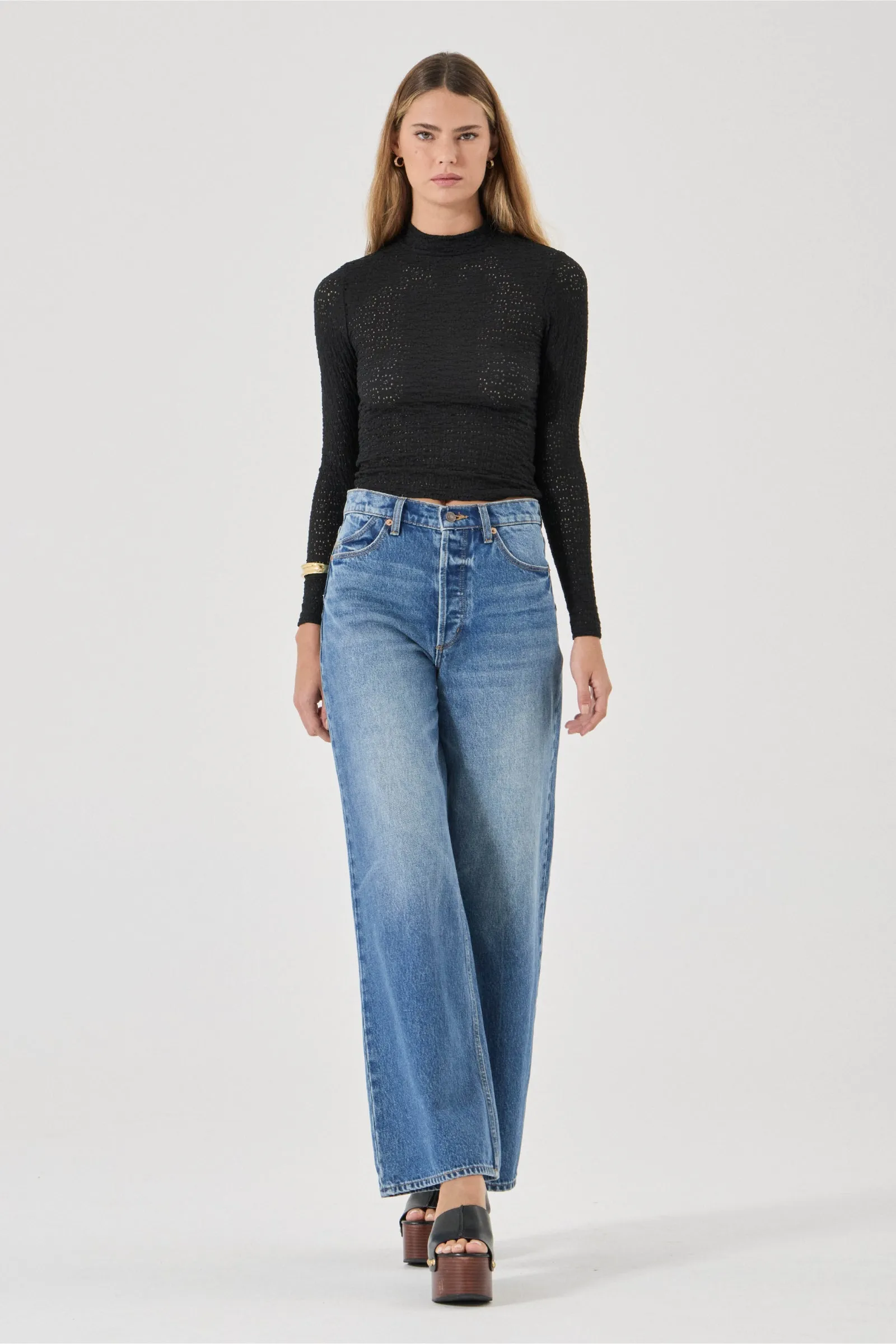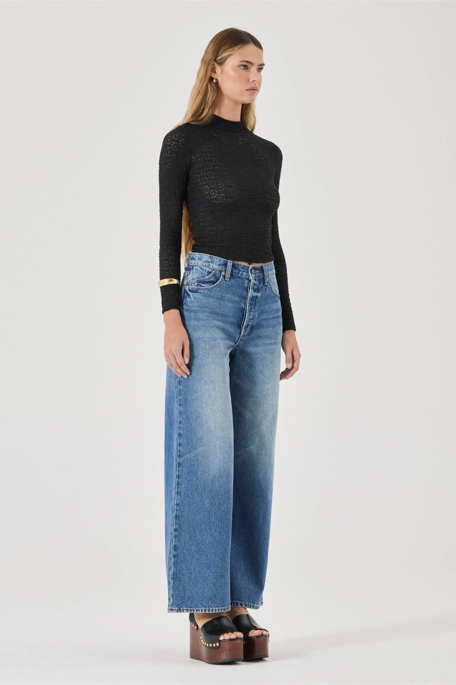Relaxed Sailor is a high-rise jean with a relaxed A-line wide leg, designed to sit loose off the body.