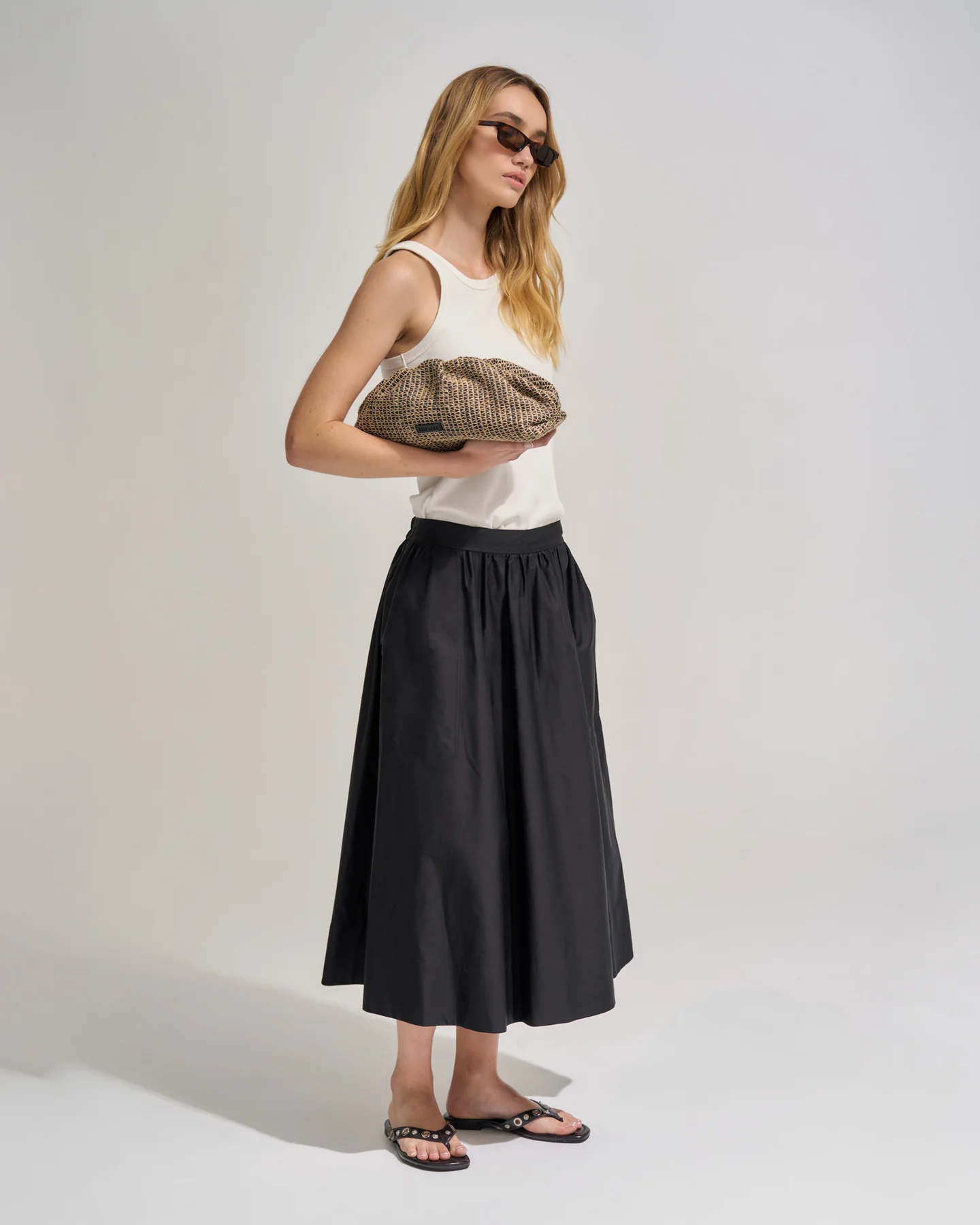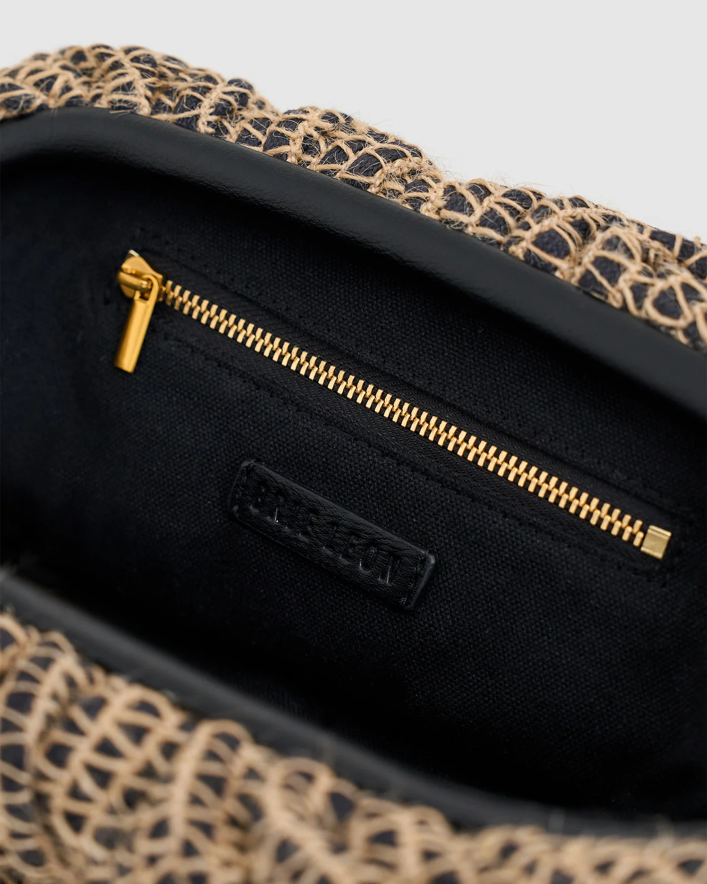 Featuring a magnet clutch frame closure and a soft gathered structure, it transitions seamlessly from day to night. The interior includes a zip pocket on the back wall for added functionality, while the exterior raffia stripe finish offers a natural, textural contrast.