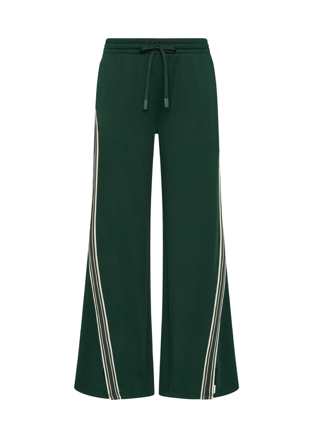 Racing green track pant with contrast side stripes and an easy retro sport feel