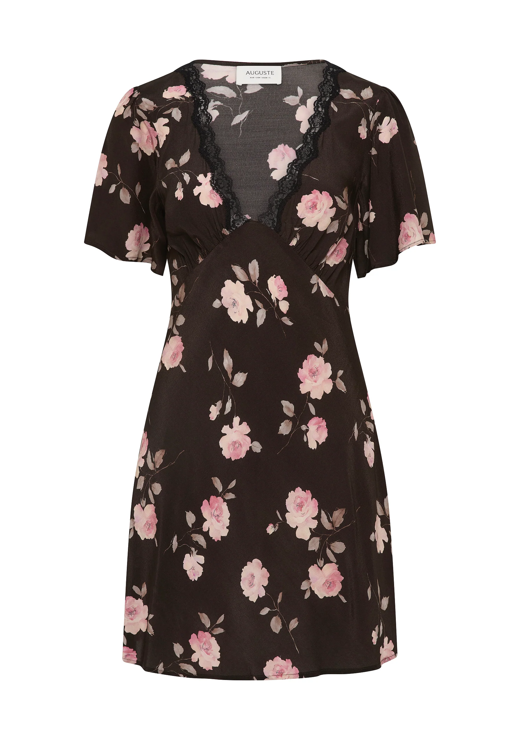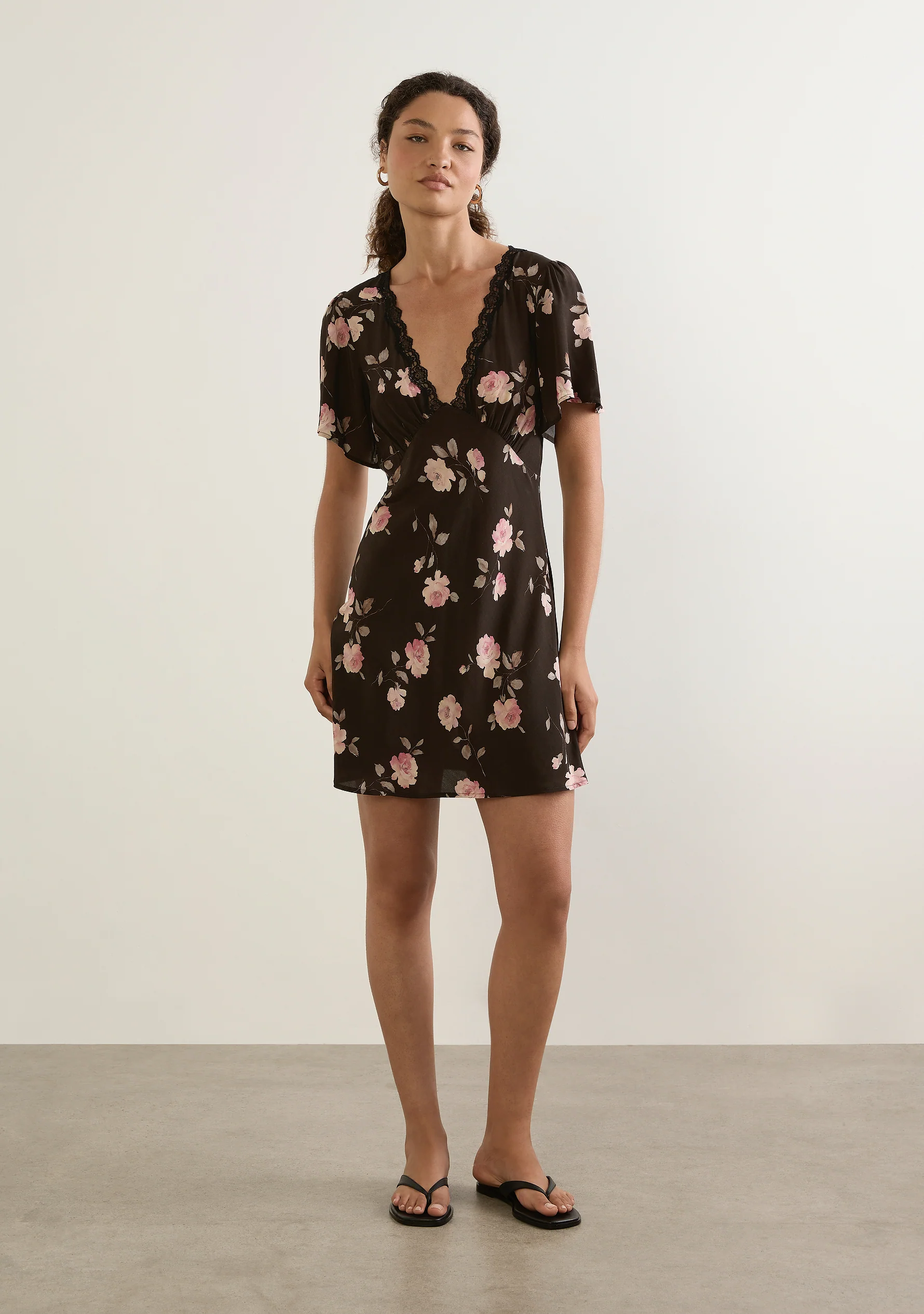The Sadie Mini Dress in the striking charcoal Nova print brings a touch of ’90s nostalgia to a playful mini length. With a lace-trimmed neckline, soft under-bust gathers, and flutter sleeves, it’s cut on the bias to skim the body beautifully—effortless, feminine, and endlessly wearable.