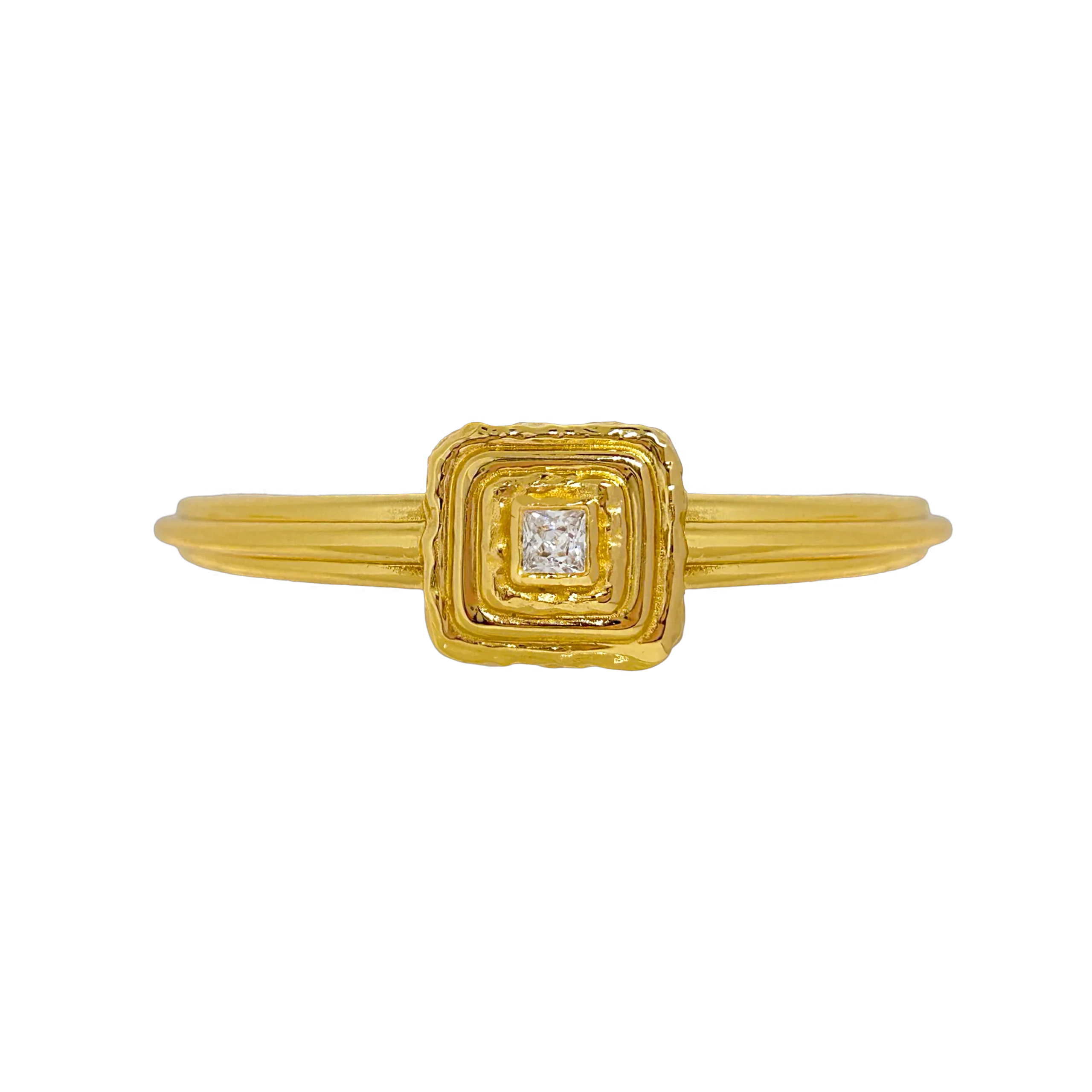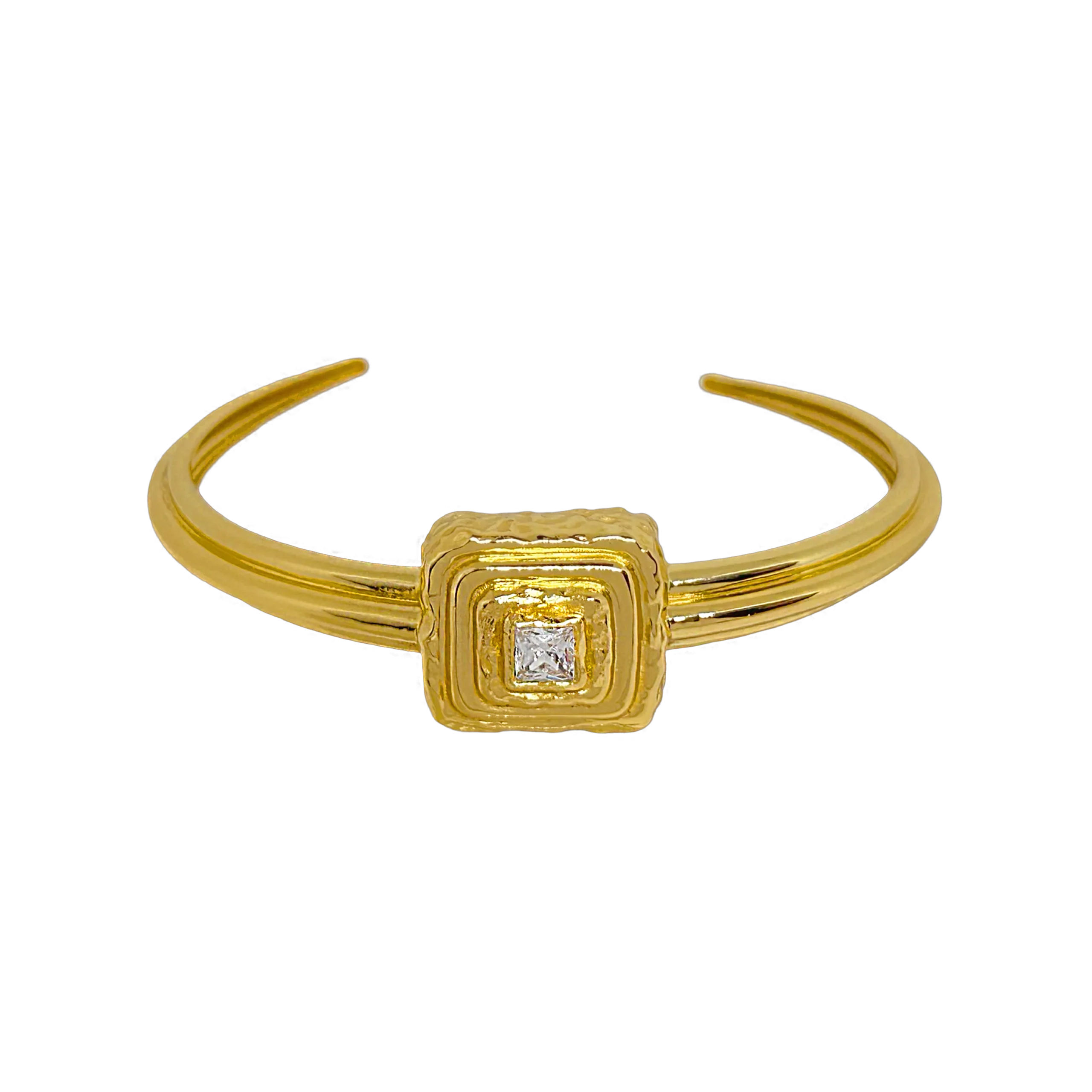 A bold expression of heritage and form, the Samira Cuff fuses architectural lines with artisanal warmth. Handcrafted by master artisans, its radiant gold finish encircles a sparkling CZ gemstone, framed in sculptural tiers that echo timeless traditions. Designed for the modern woman who moves with purpose and grace, this piece balances strength and elegance in every curve. Wear it solo as a statement or layered — a tribute to heritage, reimagined for today.